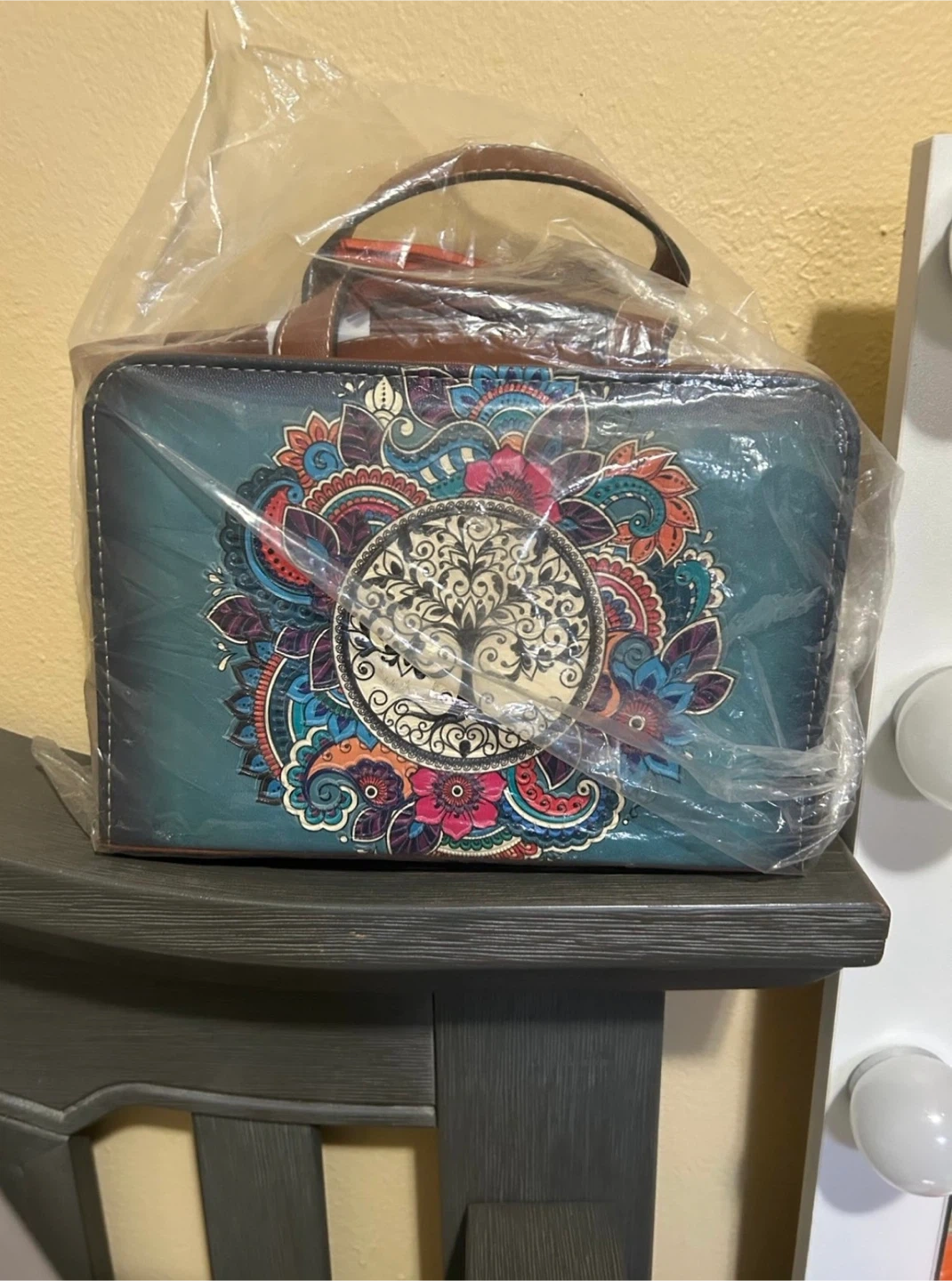 This cosmetic bag features a vibrant bohemian-style tree of life design. It's made with a durable material and includes a convenient top handle. Perfect for organizing makeup and toiletries on the go!