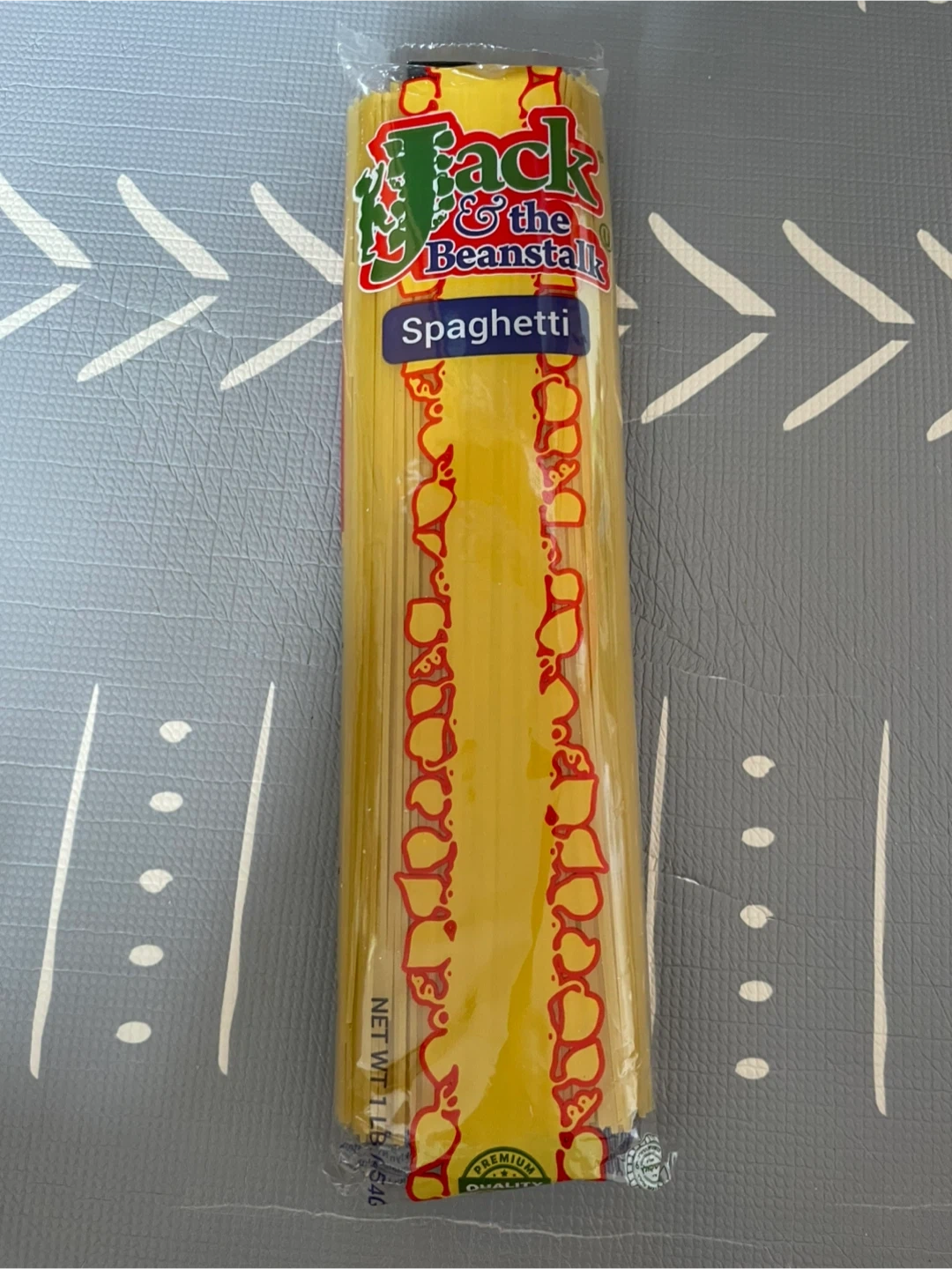 This is a package of Jack & the Beanstalk spaghetti. It contains premium quality pasta. Net weight 1 lb / 454g.