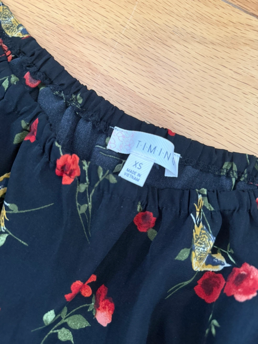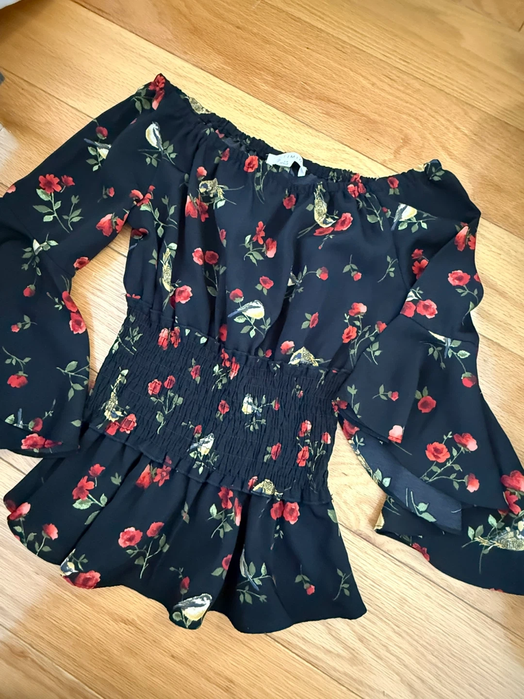 This Tymin off-shoulder top features a black base with a charming floral and bird print. It's designed with a smocked waist and flared sleeves. Size XS.