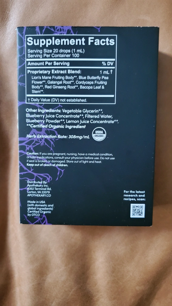 Herbal tincture dietary supplement. Longevity and brain support. 1 fl oz (30 mL). Features Lion's Mane, Blueberry, and other ingredients.