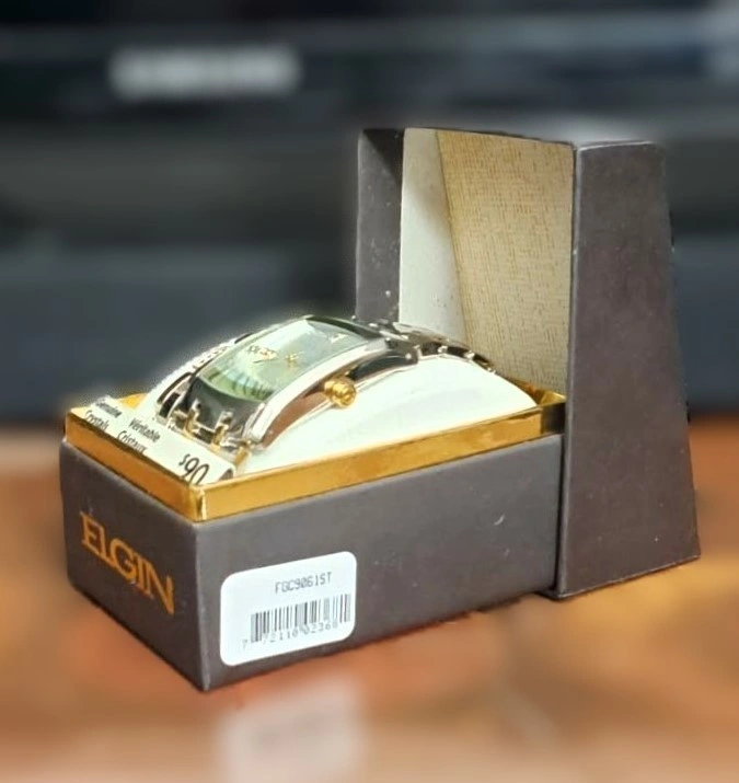 Elevate your style with this stunning, brand new men's Elgin watch and matching bracelet set. This classic two-tone timepiece features a rectangular silver dial accented with genuine crystals as hour markers, offering a touch of everyday luxury.
