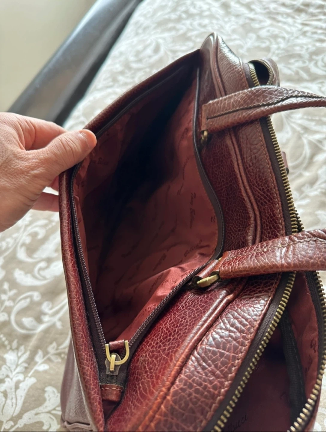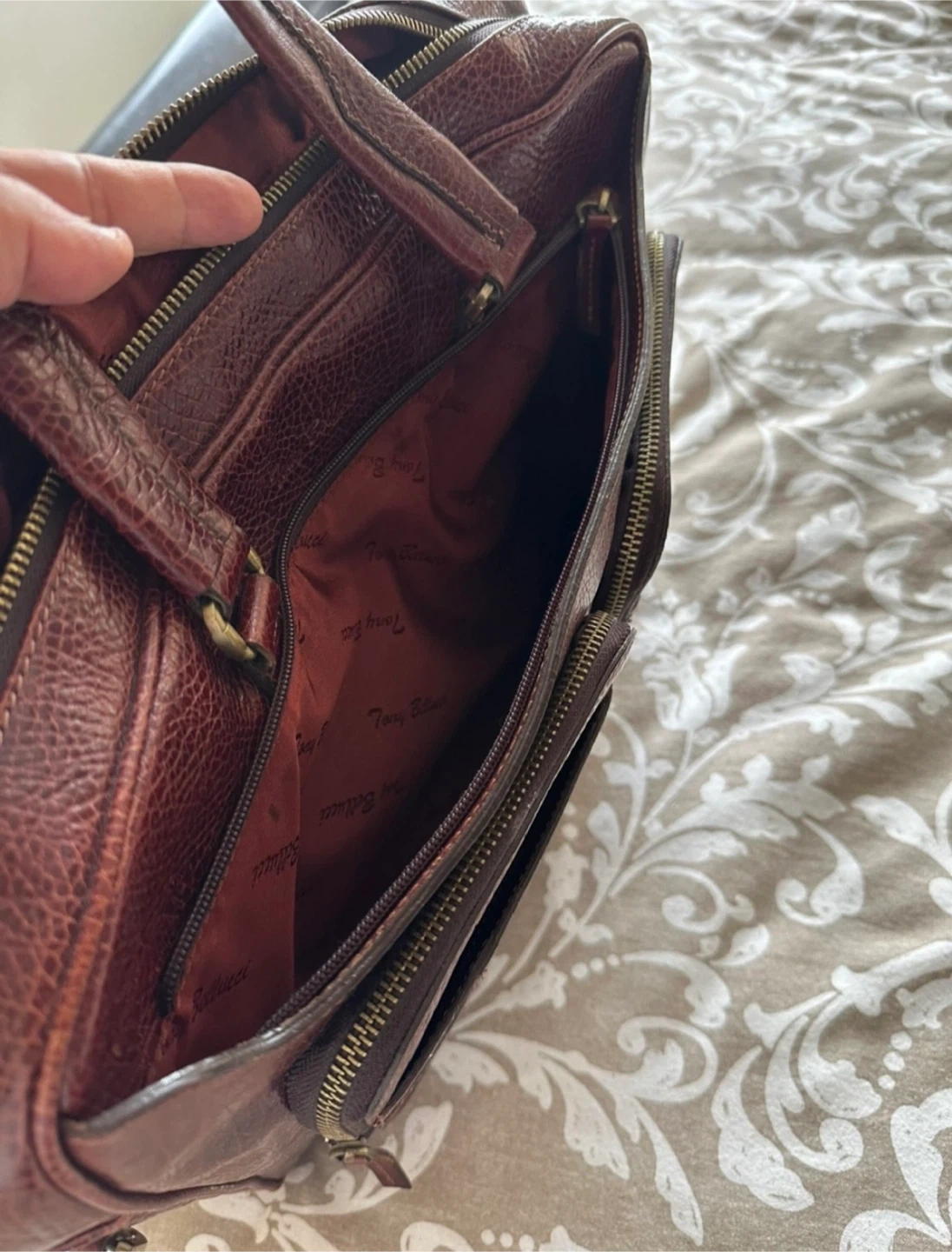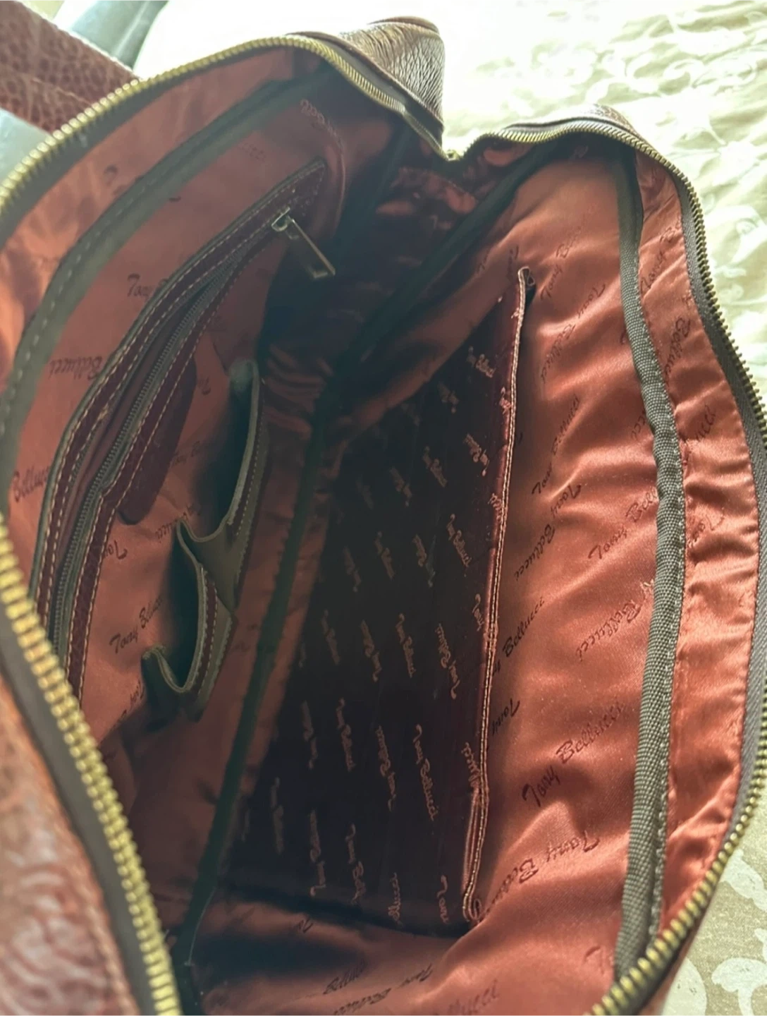 Beautiful genuine brown leather briefcase by Tony Bellucci. It's in great condition and ready for a new home! The interior is lined with a silky fabric that features the brand's name. Two main compartments. Several smaller pockets inside. Top handles. Zip closures. There is a minor (half a centimetre) stitch tear as seen in the last photo. Good for work or travel. Price is firm and not negotiable. Pick up near Scarborough Town Centre.