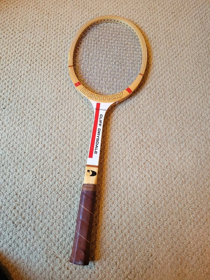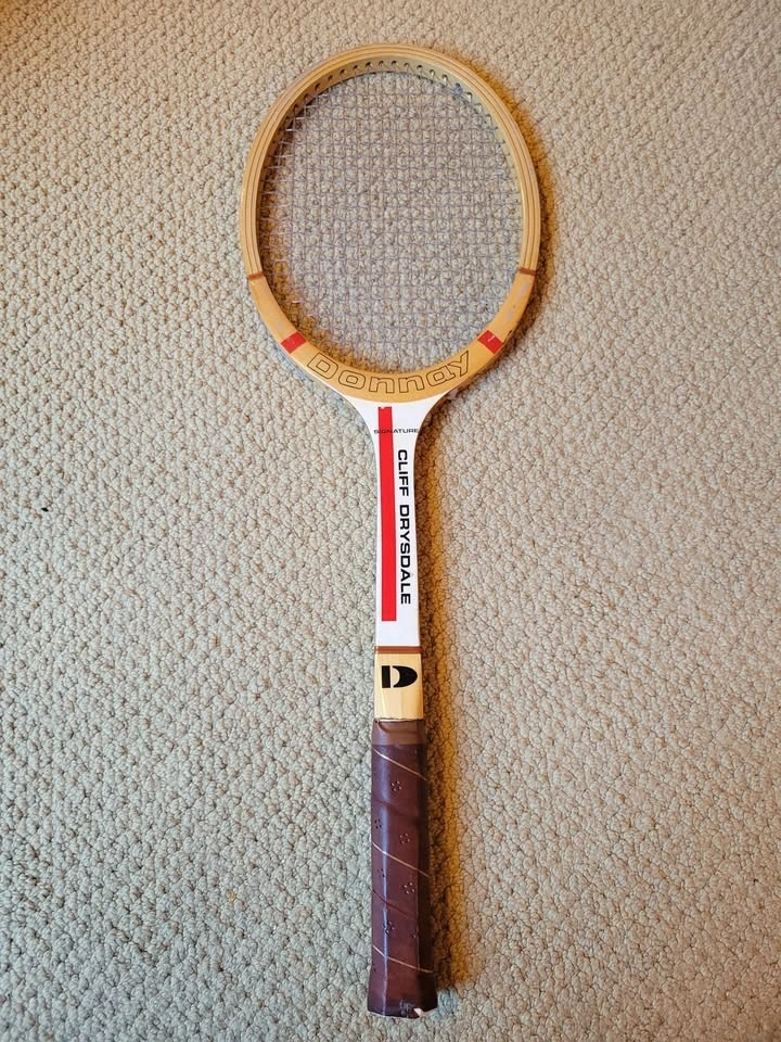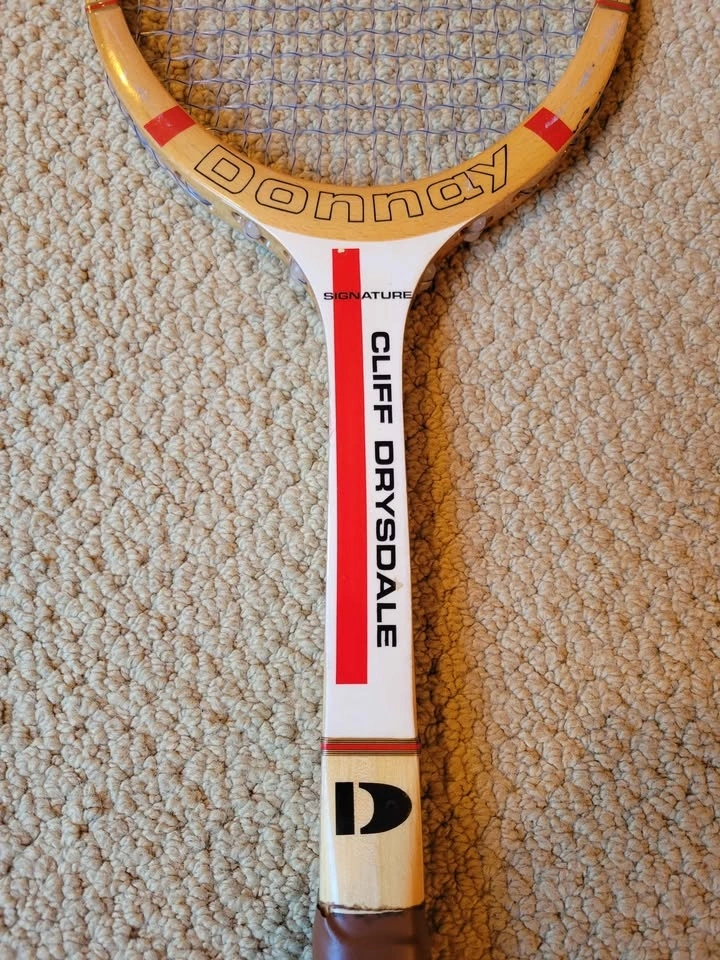 Vintage Donnay Cliff Drysdale wooden tennis racket. The racket features a classic wooden frame construction typical of those used from the 1940s through the 1980s. It is a signature model, bearing the name of South African professional tennis player Cliff Drysdale. Donnay was a prominent manufacturer of tennis rackets. Vintage wooden rackets like this are often sought after by collectors for display or use in "stone age" open tournaments. Signature series.
