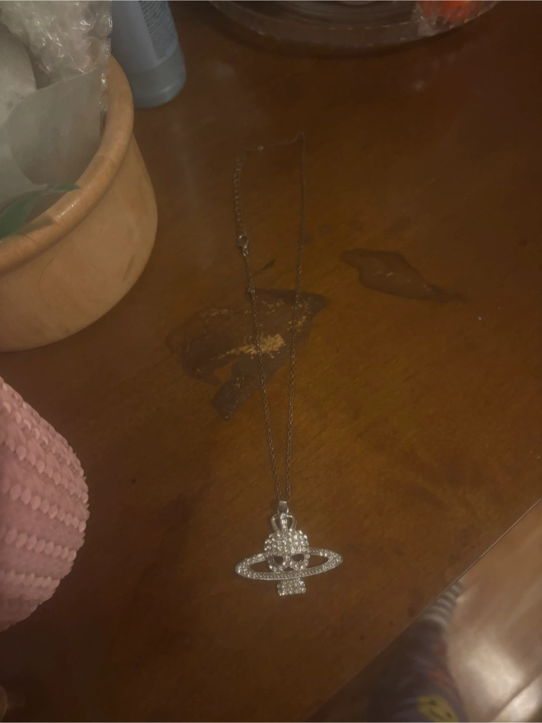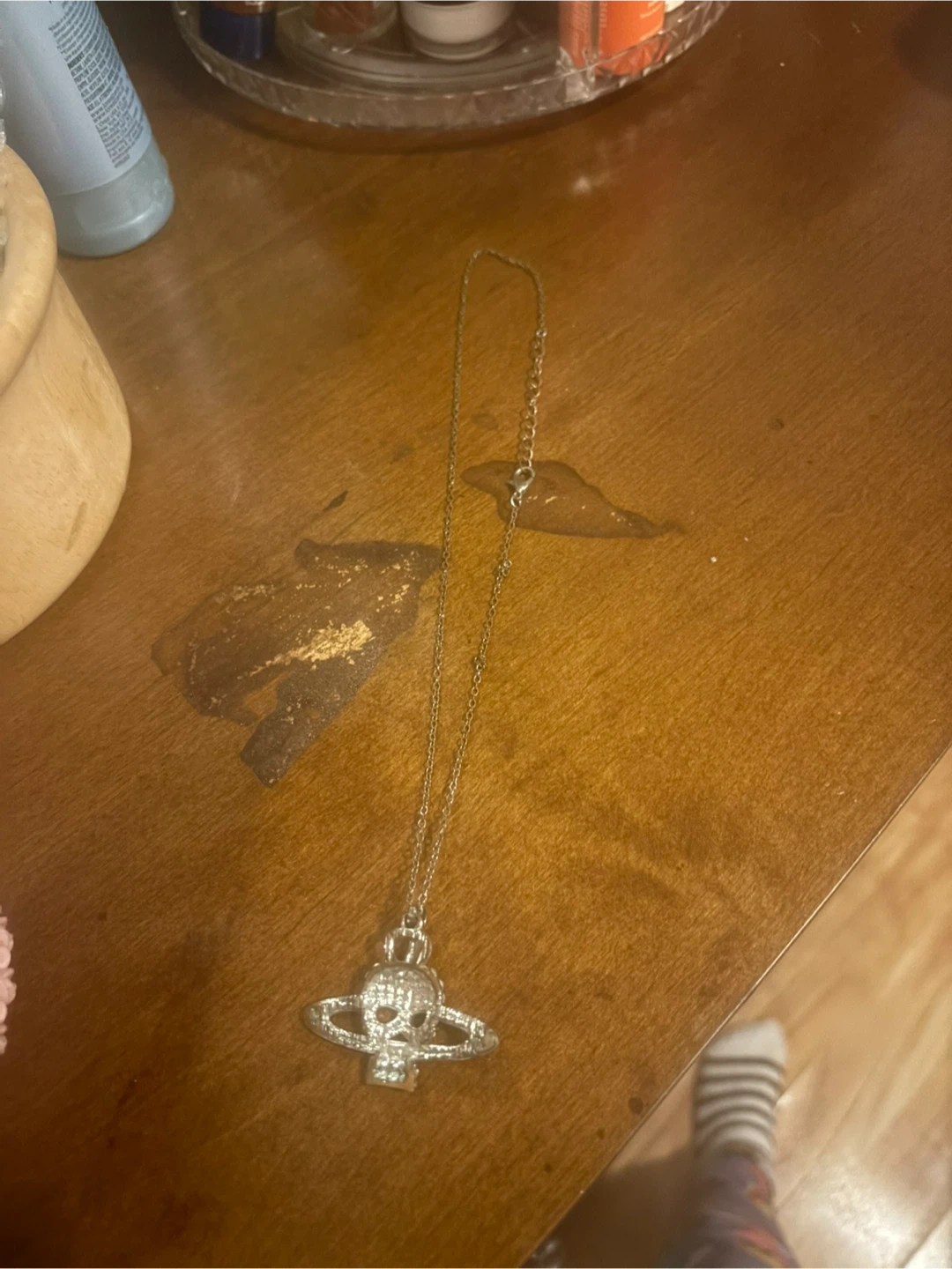 This is a Vivienne Westwood Saturn necklace. It's a silver-tone pendant necklace with a skull detail and orb emblem. The chain is adjustable.