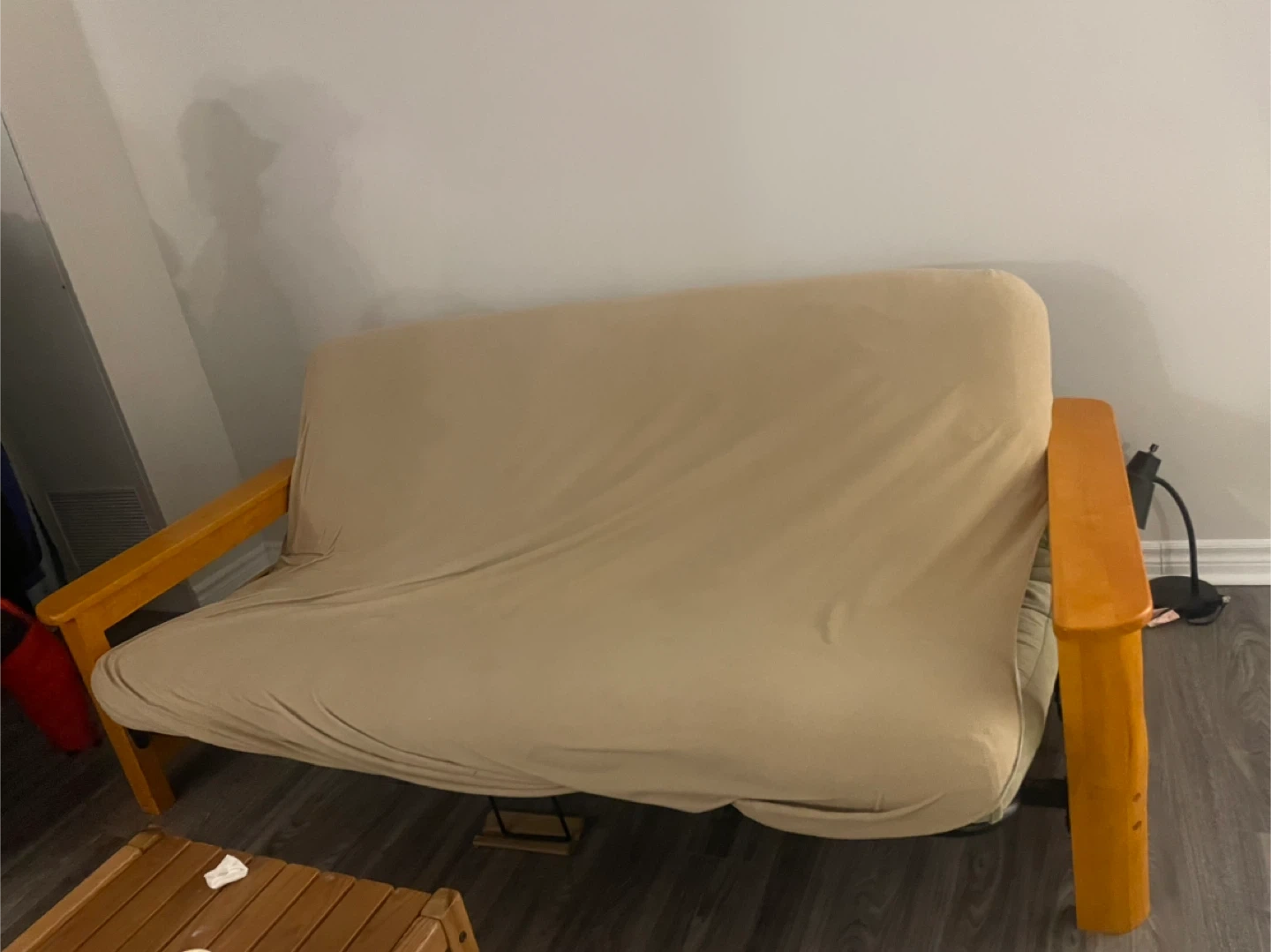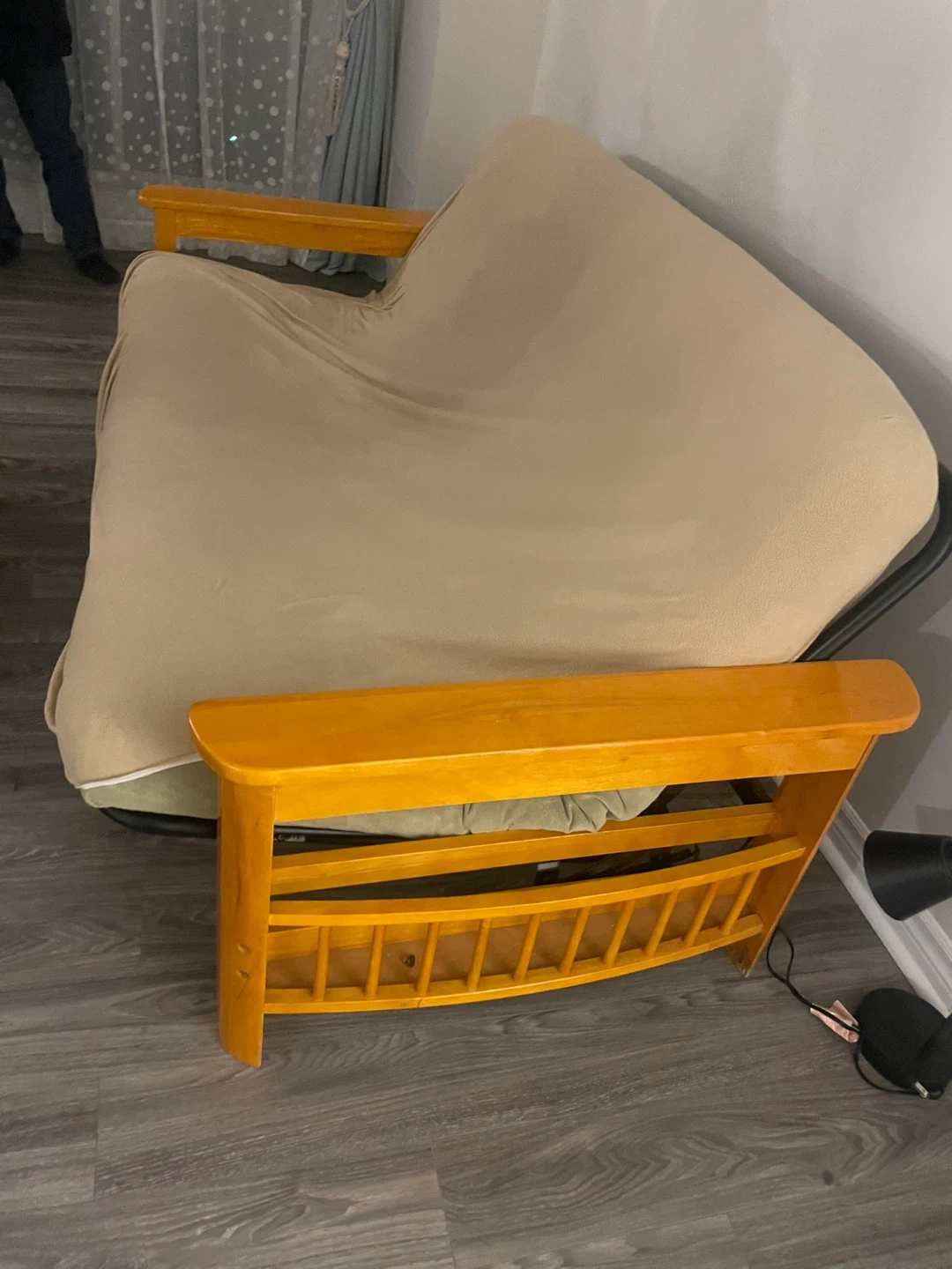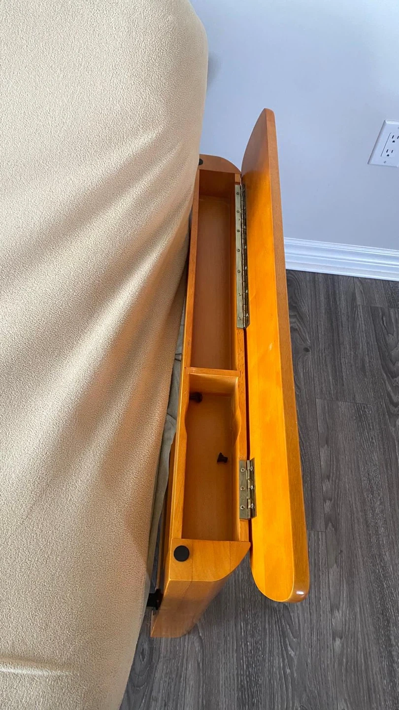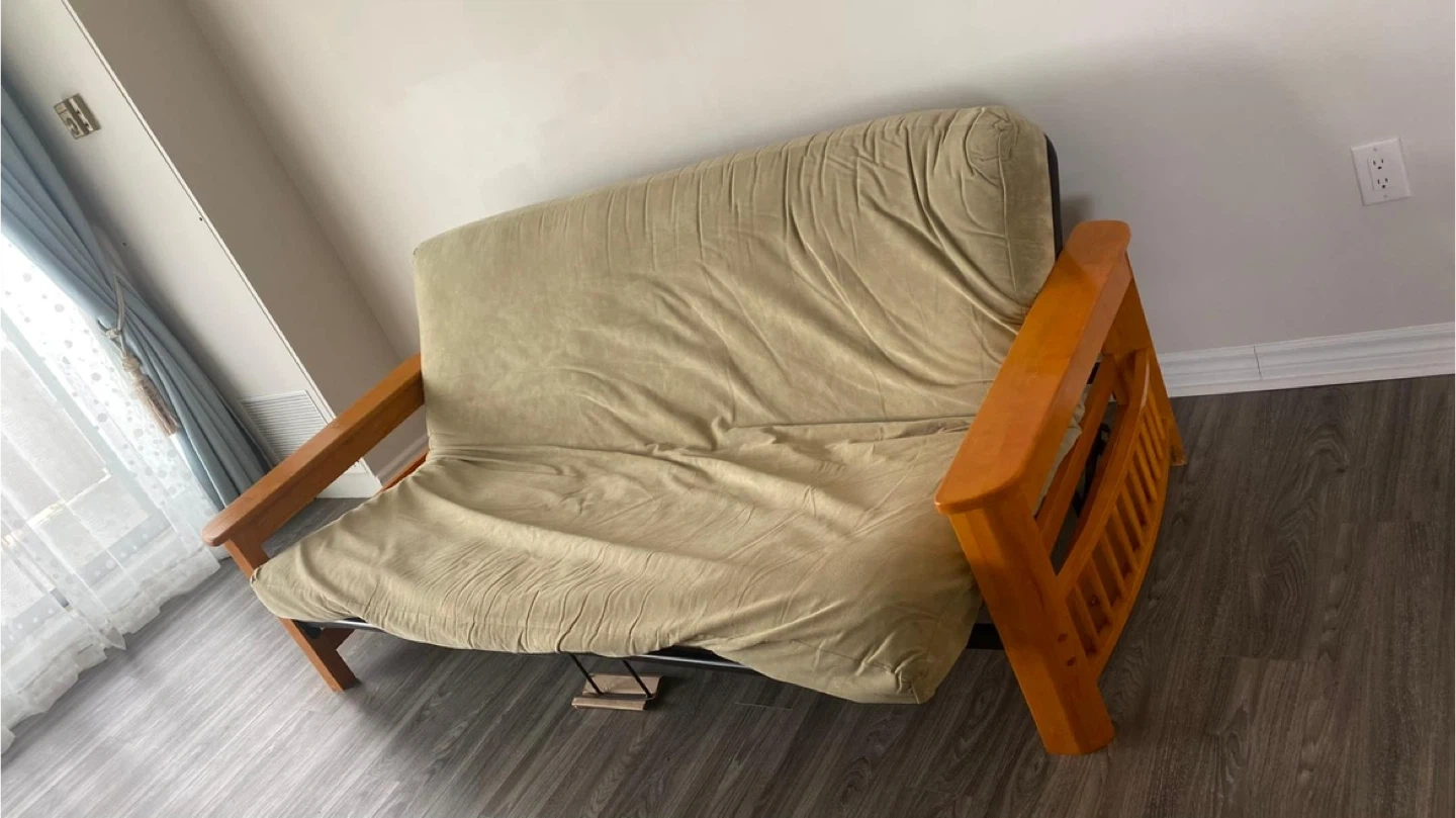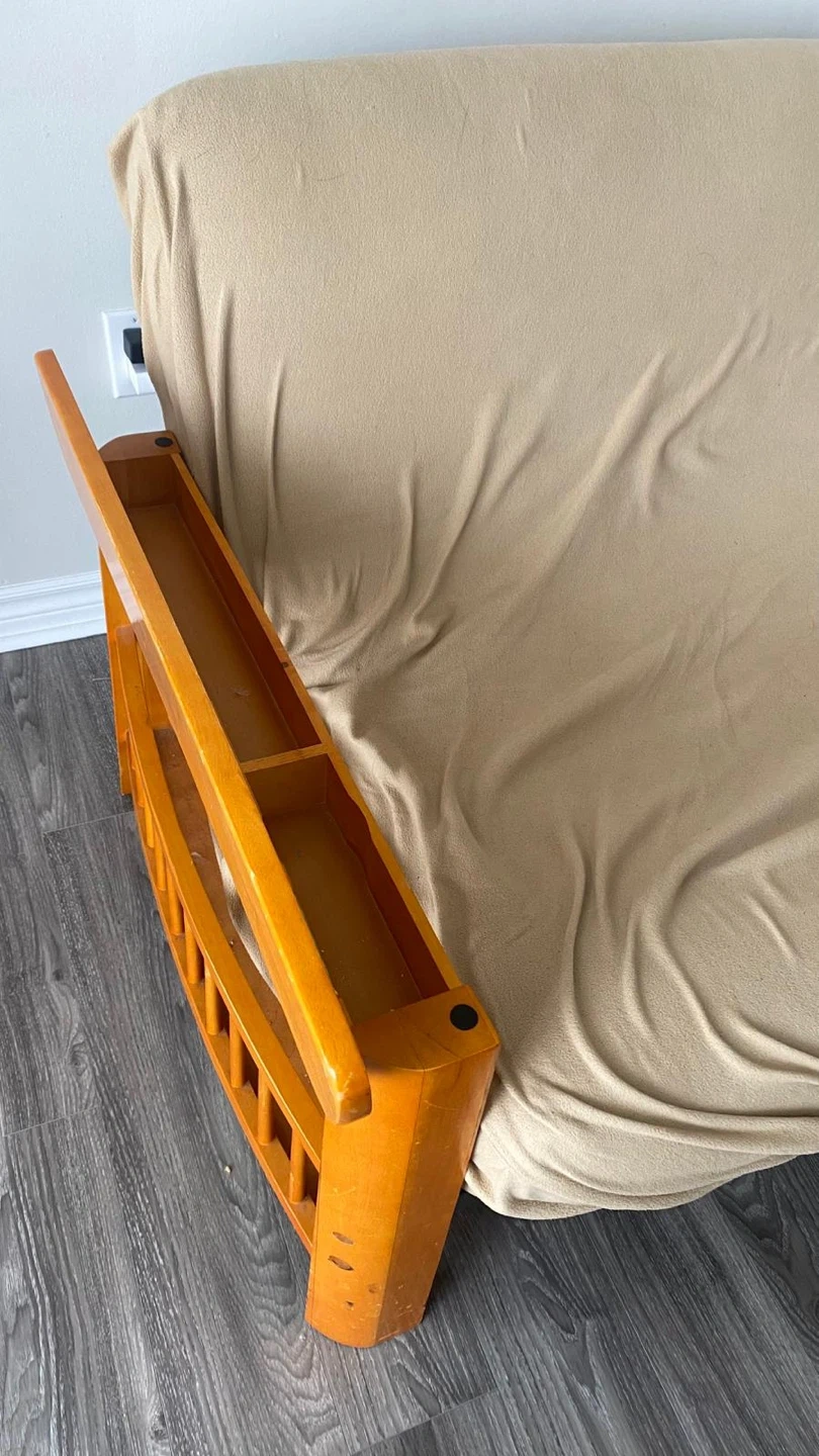 This wooden futon frame comes with a beige removable cover. Cover is washable. Wooden armrests has a storage space. Perfect for a den or small apartment!
