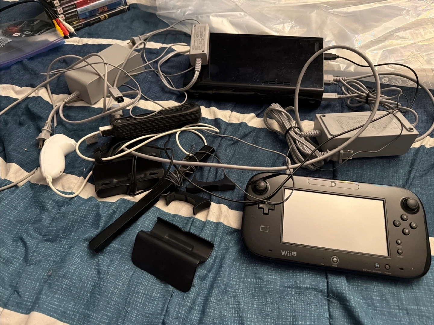 Nintendo Wii U console in black. Comes with the GamePad, power adapter, AC adapter, sensor bar, and steering wheel accessory.