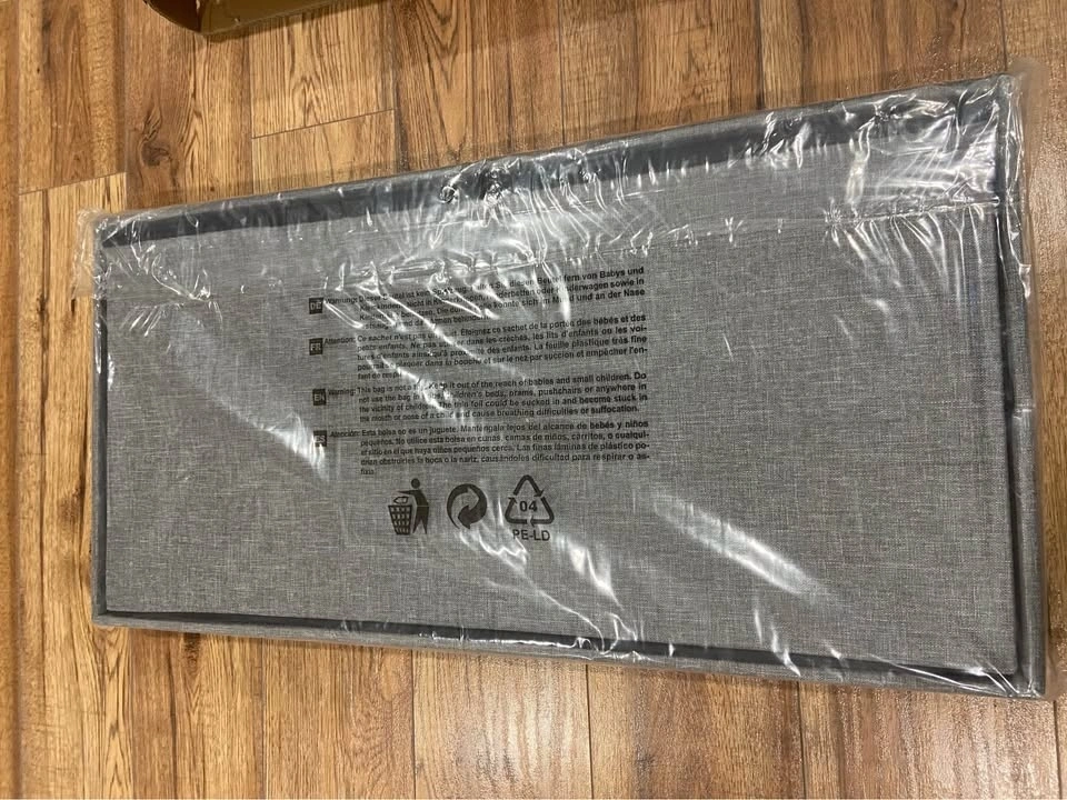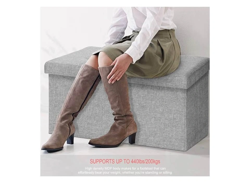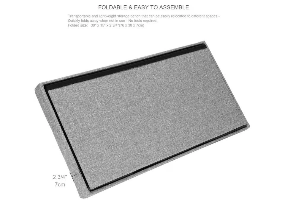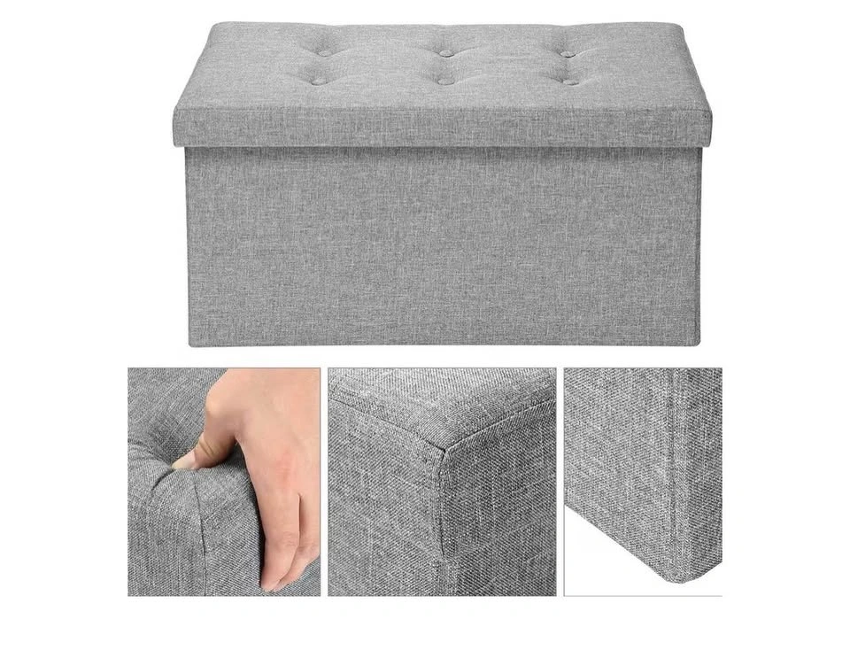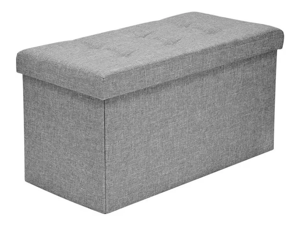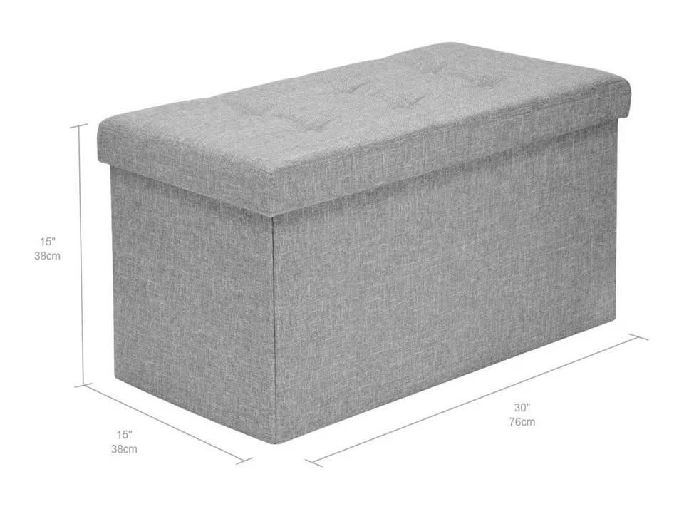 Brand new in a sealed bag. Features comfort foam padding and a sturdy base for seating. The removable cushion lid is filled with high rebound sponge for comfort. The outer material is linen. It offers spacious hidden storage and can be folded compactly for space-saving needs, perfect for a bedroom. It might have a slight smell when first opened, but airing it out for a day or two will make it go away. Sturdy construction supports up to 440 lbs (200 kg) and is made with Medium-Density Fiberboard. It's transportable, lightweight, and easily folds away for storage with no tools required. Dimensions are approximately 30" x 15" x 15" (76 x 38 x 38 cm), and it folds down to about 30" x 15" x 3" (76 x 38 x 7 cm).
