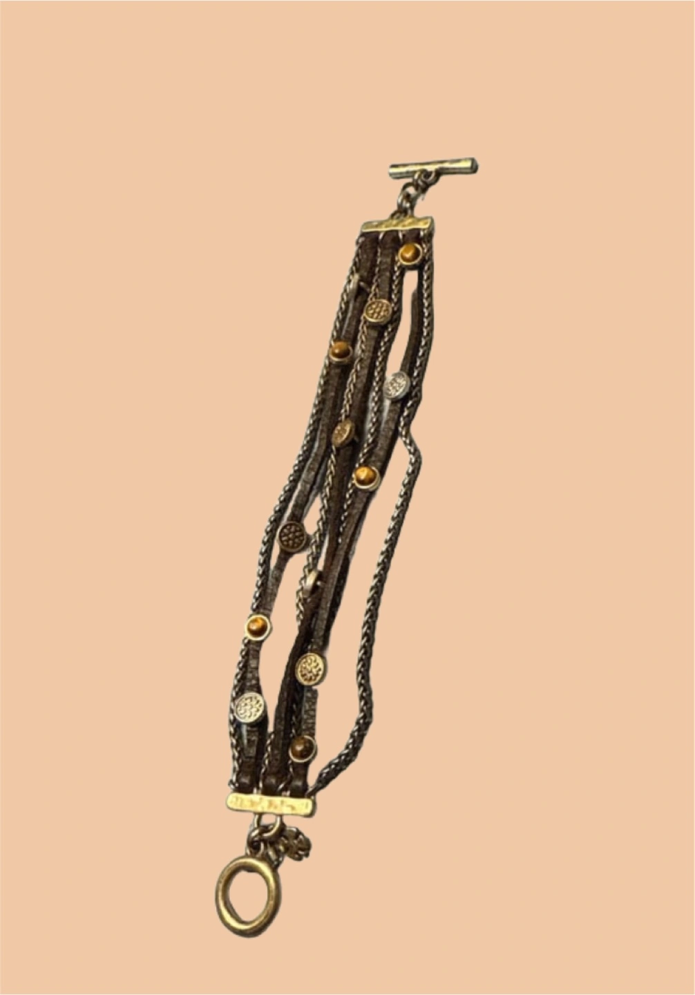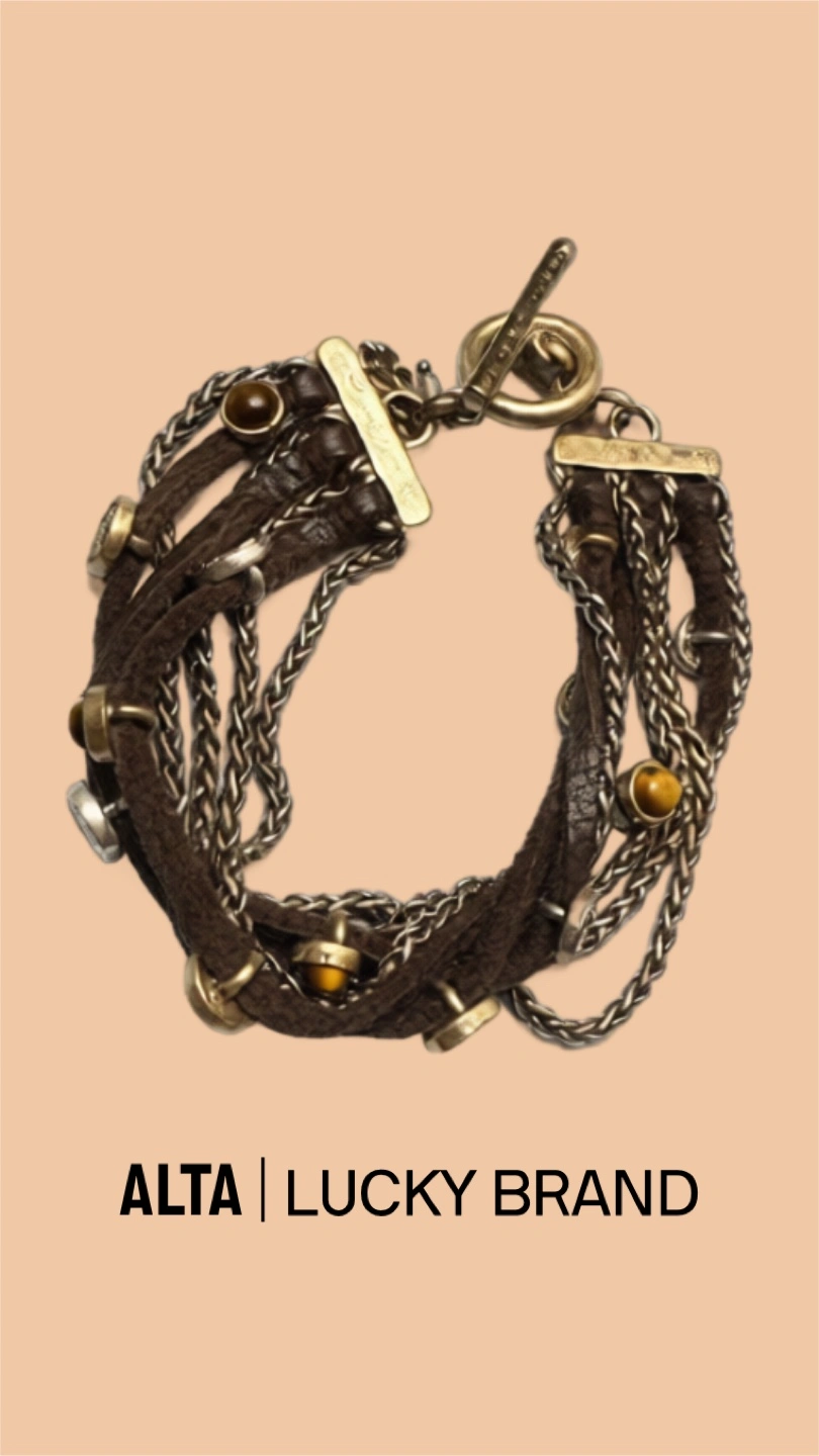 This Lucky Brand bracelet features multiple strands of brown leather and silver-toned chains. It's adorned with tiger's eye beads and decorative metal charms. It has a toggle clasp closure.