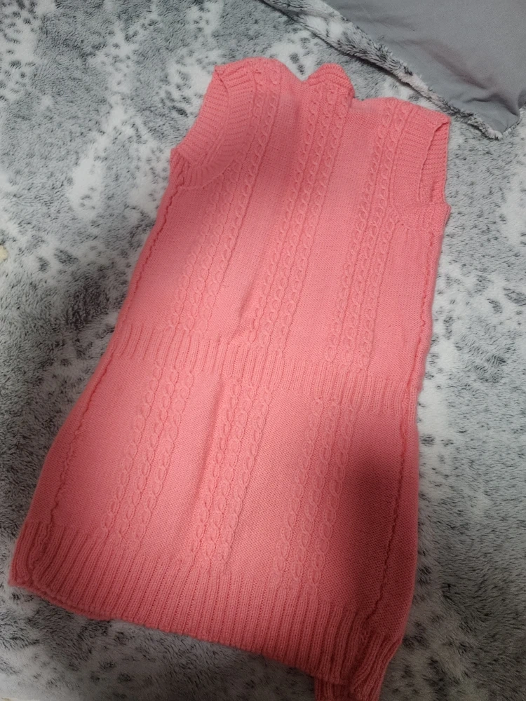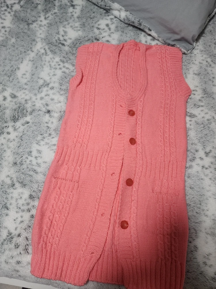 Here's a cute pink knitted sleeveless croshet cardigan! It has a V-neck and button-down front with pockets. Perfect for layering or wearing on its own