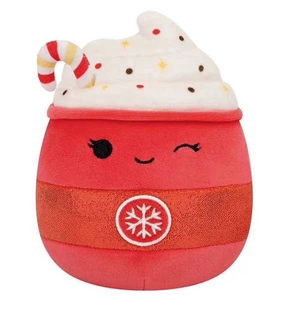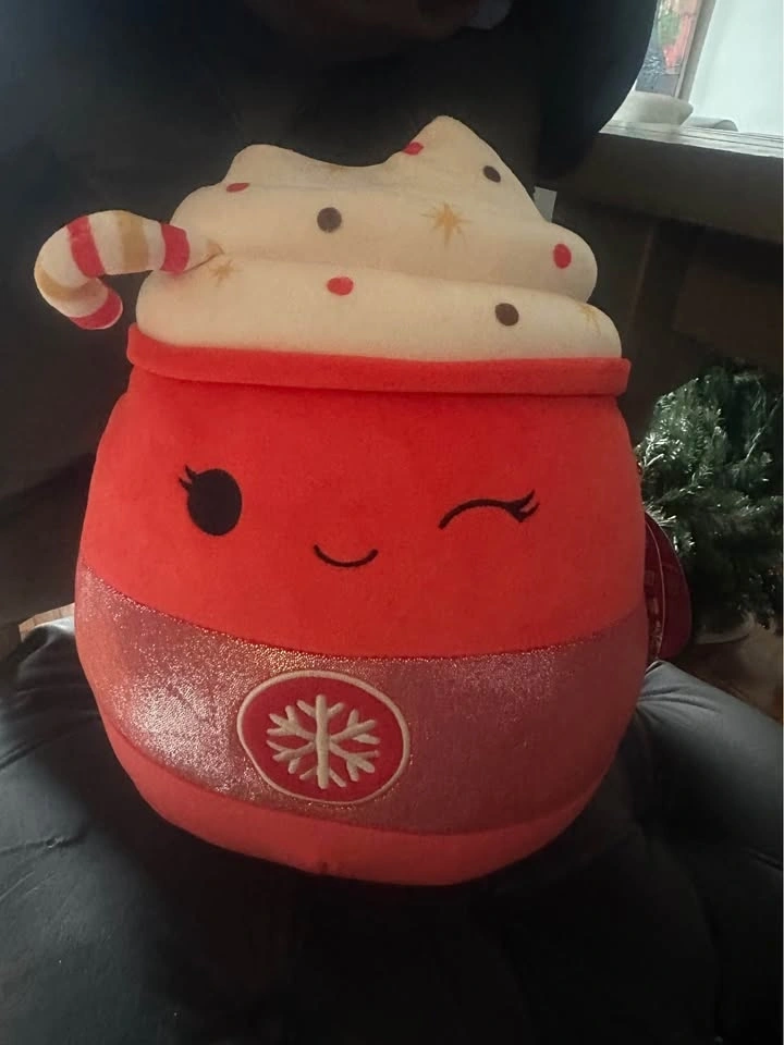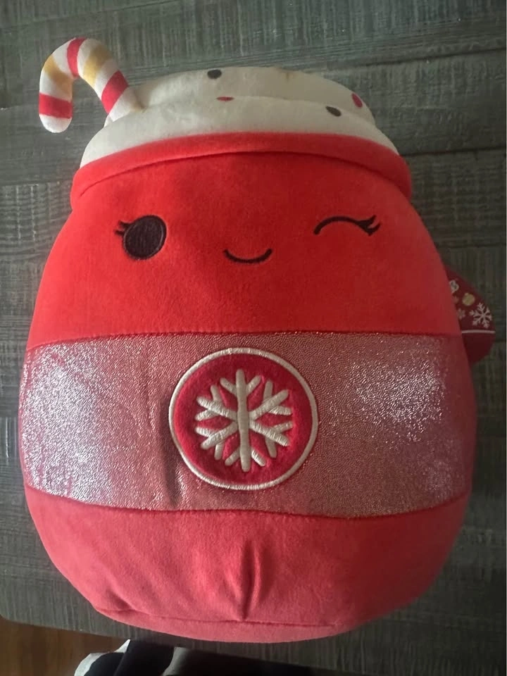 Rare to find 16" Tinsley the Peppermint Latte Squishmallow from the Christmas Squad collection. Features a red cup with a winking face, a sparkly pink band, a snowflake emblem, and a candy cane straw. Made with ultrasoft, high-quality material.