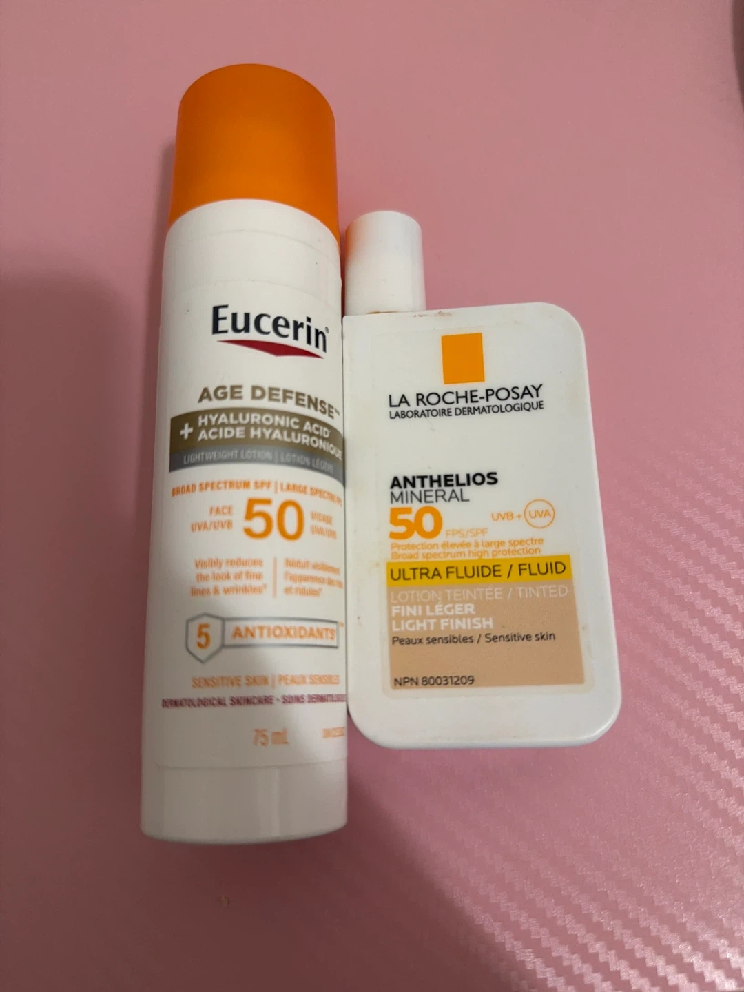 Two sunscreens: Eucerin Age Defense Lightweight Lotion with SPF 50 and 5 antioxidants in a 75ml bottle. Also includes La Roche-Posay Anthelios Mineral Ultra Fluid Tinted Sunscreen with SPF 50 for sensitive skin.