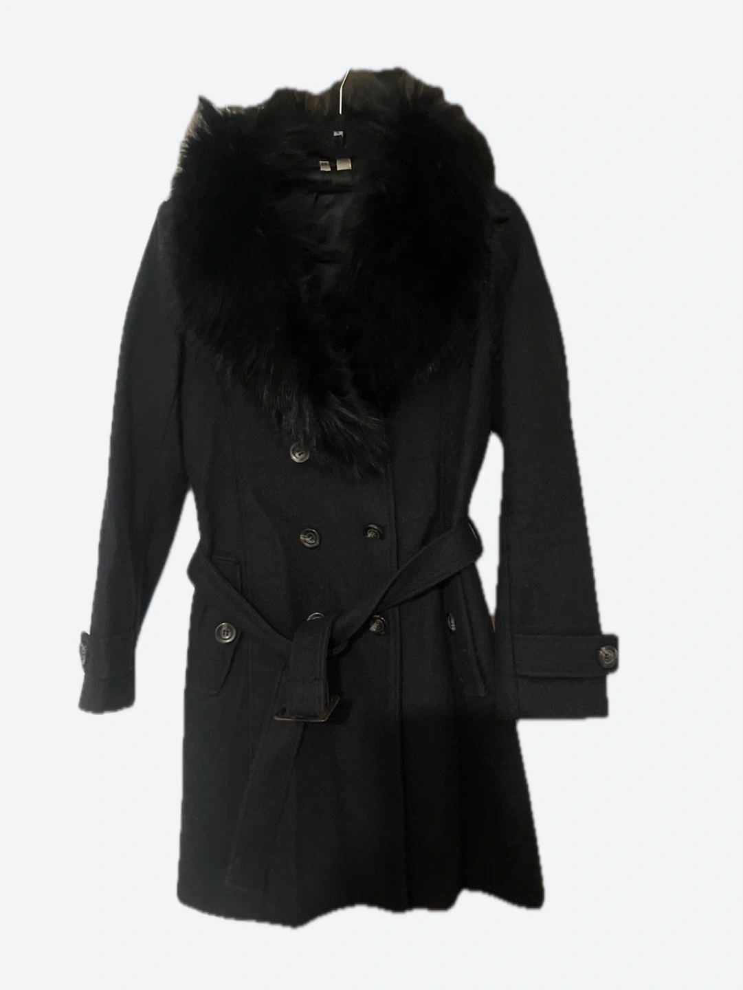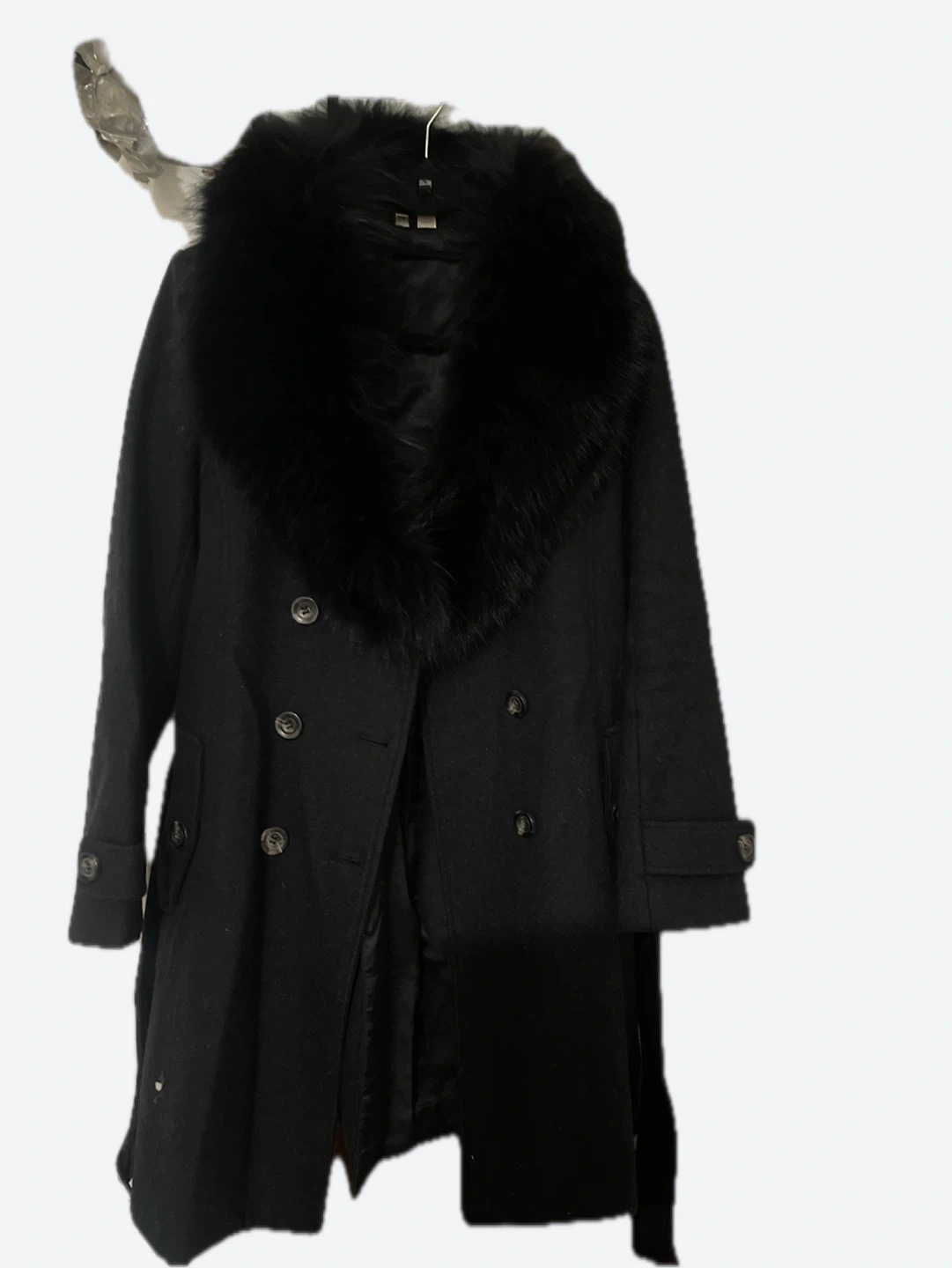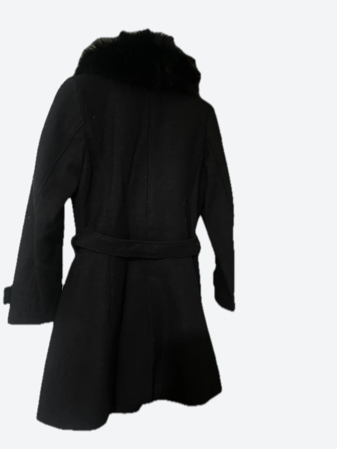 This black coat is made from a wool blend and features a detachable faux fur collar. It has a double-breasted front with button closures and a matching belt. The coat is fully lined.