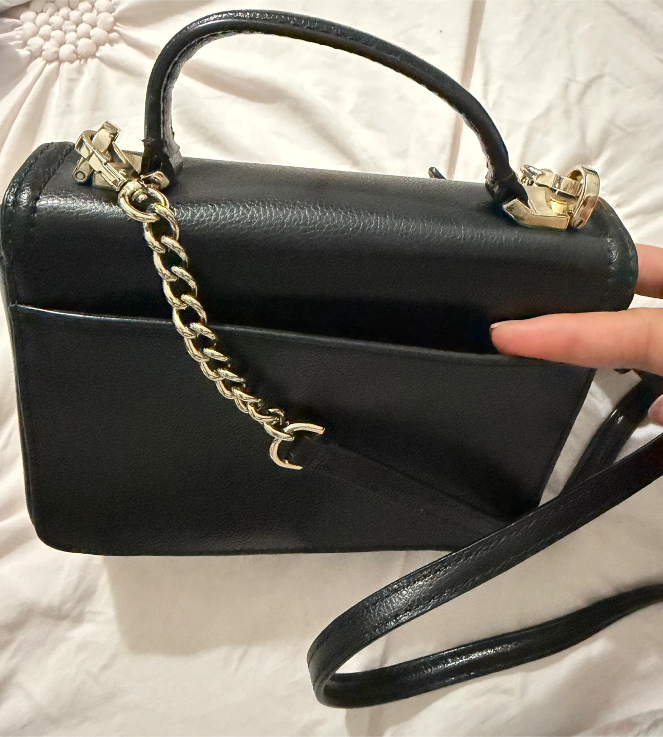 This is a black leather crossbody bag from Kate Spade. It features a chain strap and gold hardware. The interior is lined with the brand's signature spade pattern.