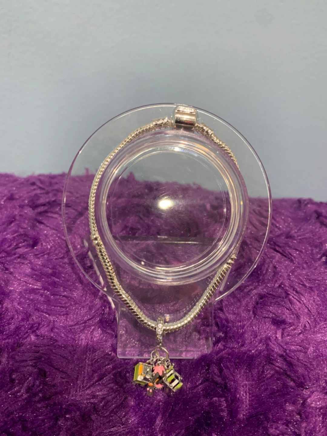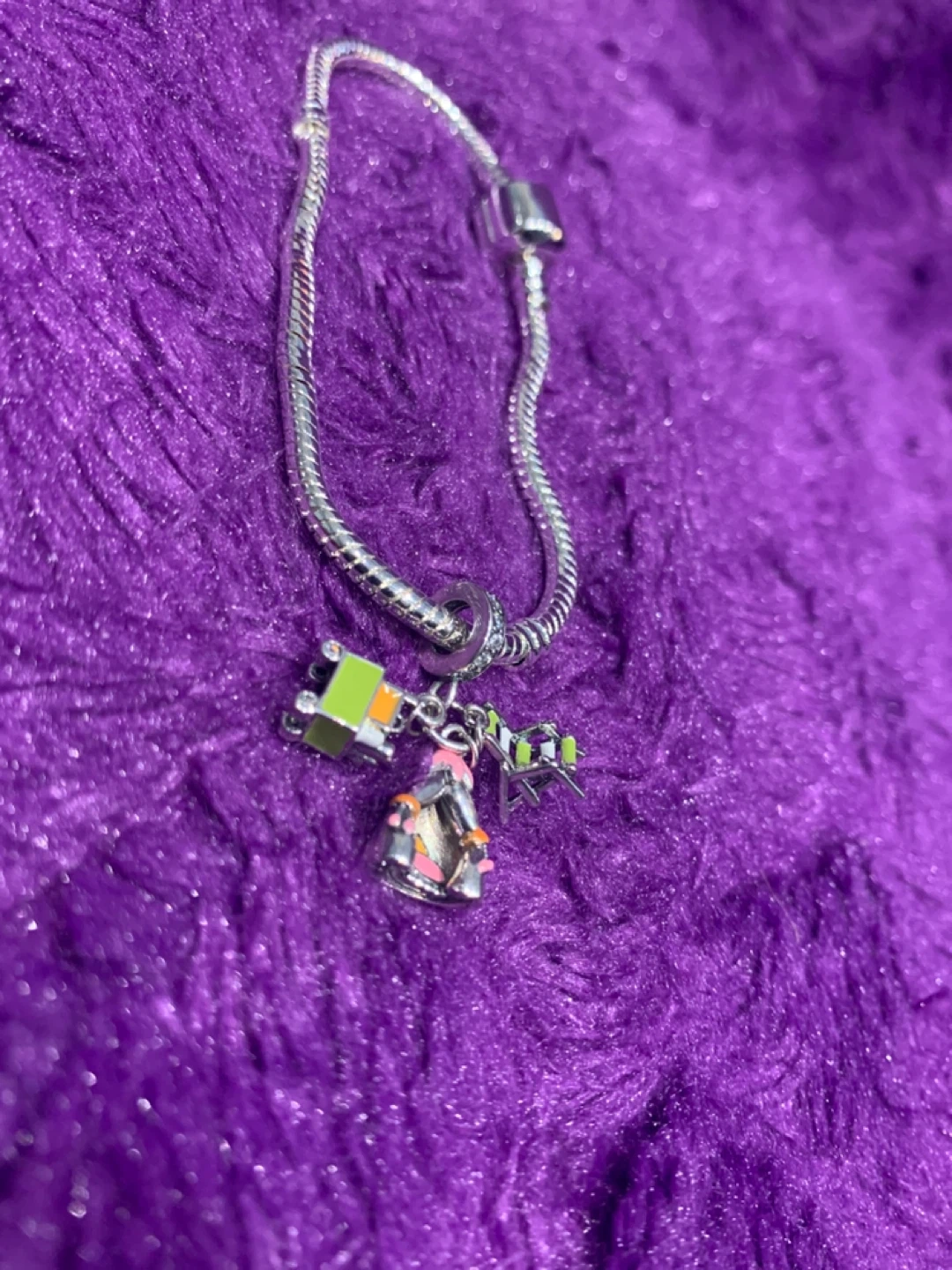This S925 Silver bracelet features a snake chain with a secure clasp. It comes with Silver three colourful charms: a mini house, a flower cluster, and a green and orange block. It's a sweet accessory!