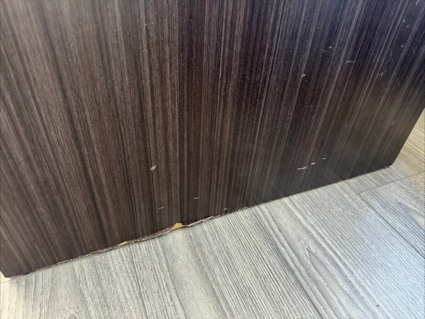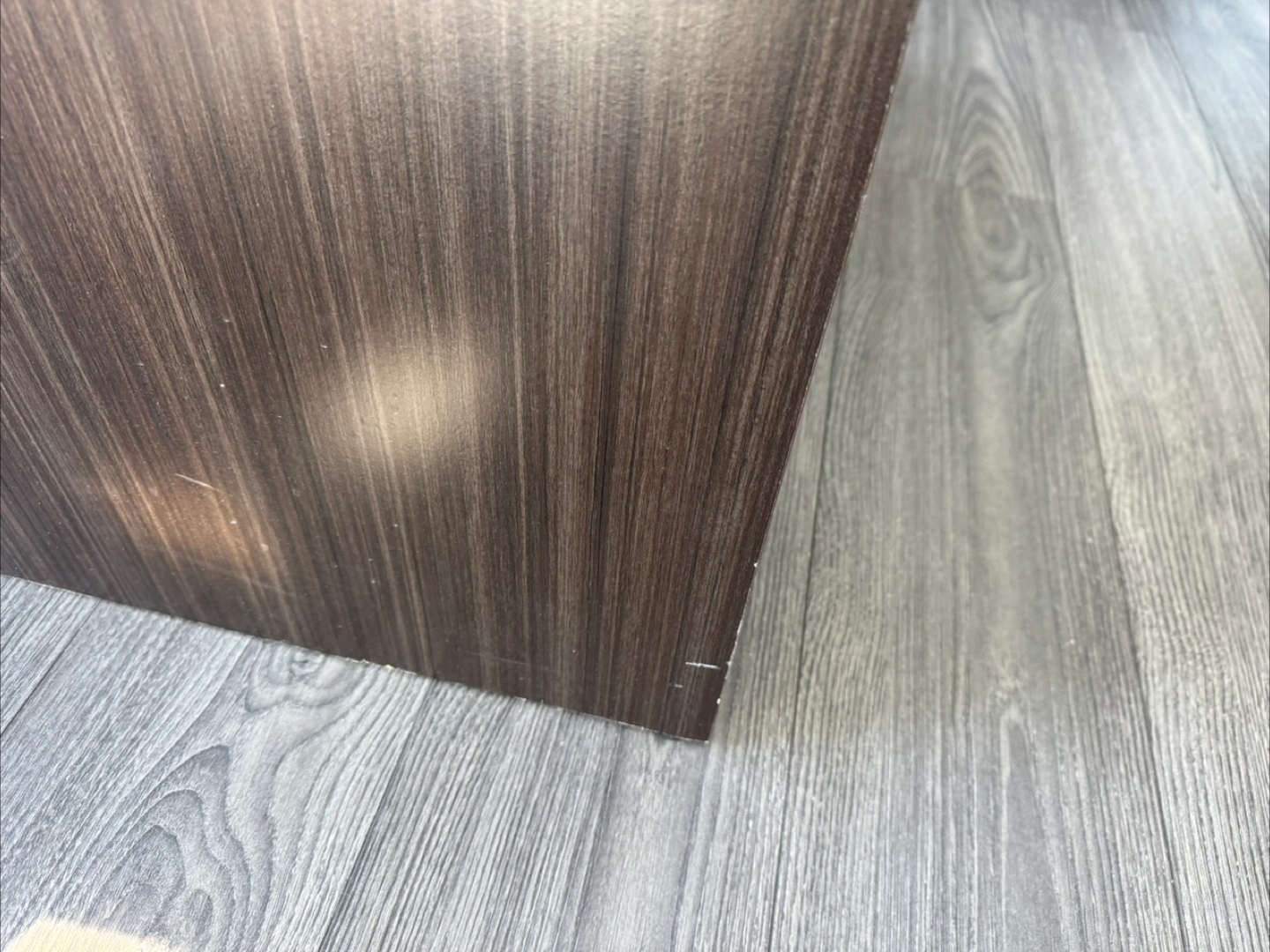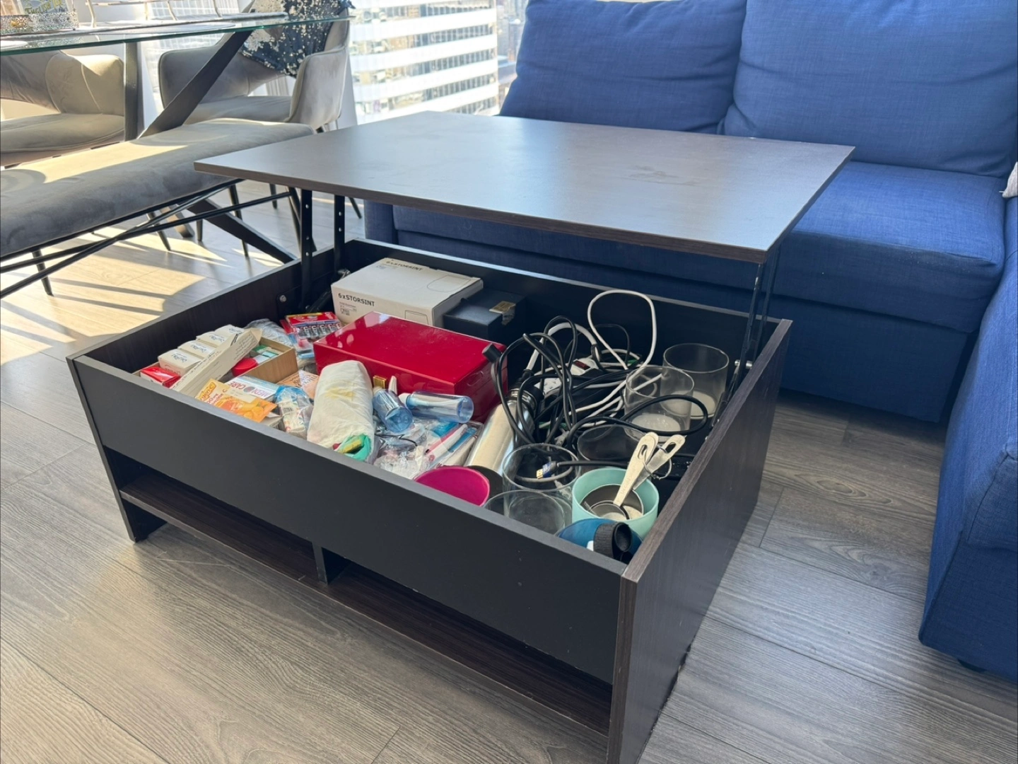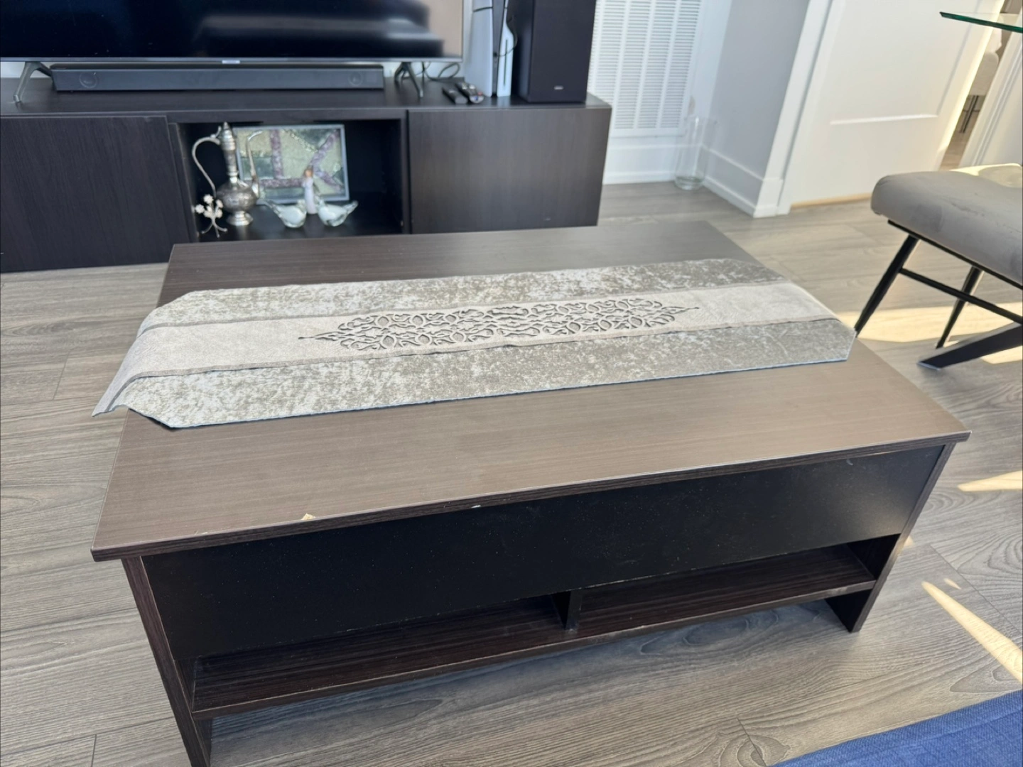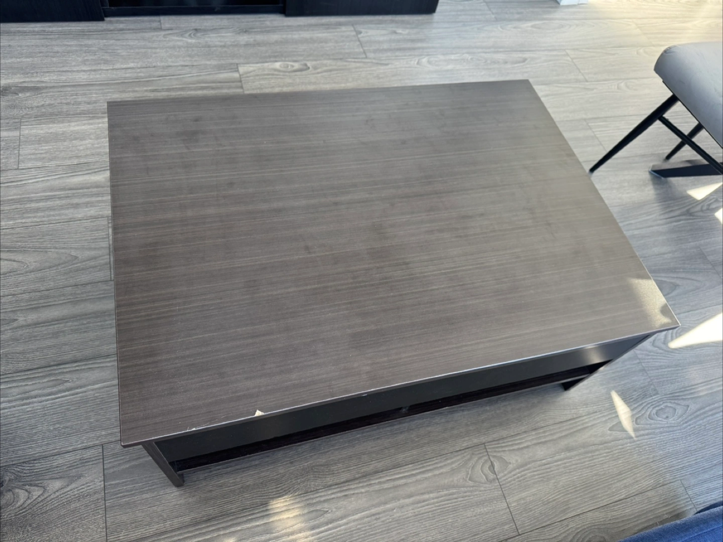 Dark wood grain lift top coffee table with ample storage inside and open shelving below. It's made of composite wood and measures approximately 40" L x 20" W x 16" H. Some scuffs on the bottom edge.