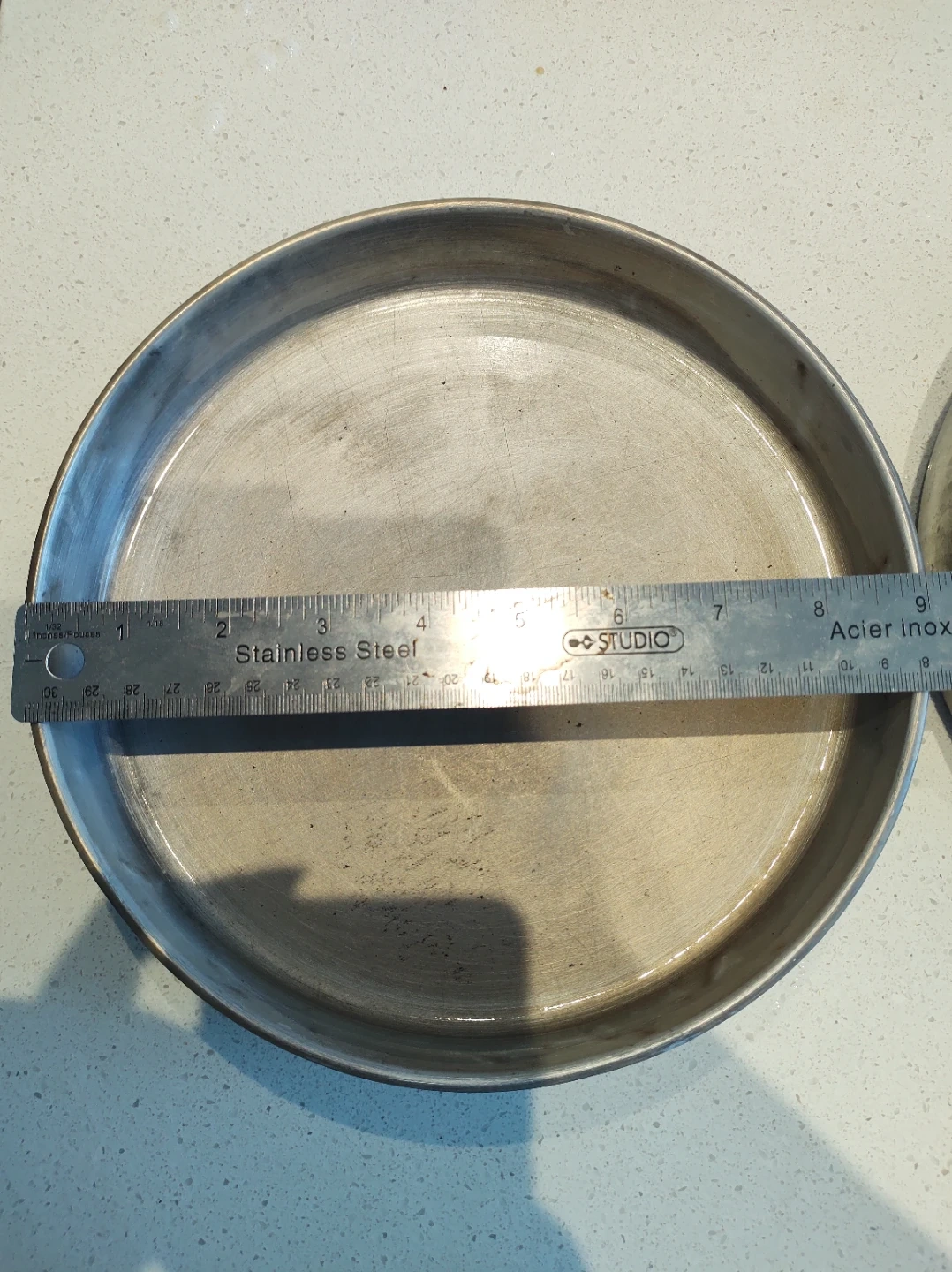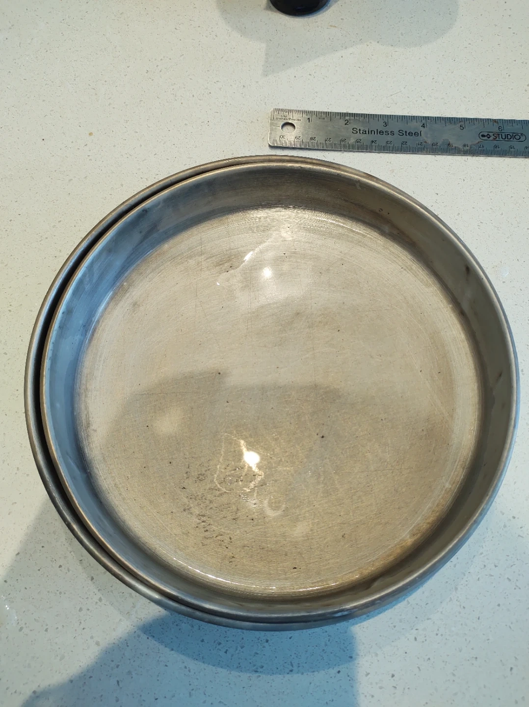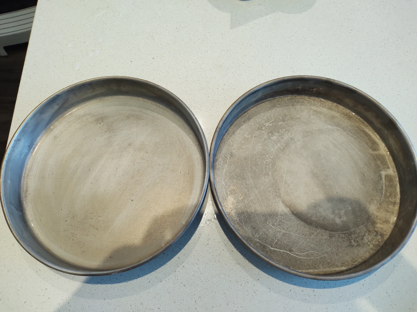 Set of two round baking pans. Aluminum construction. Each pan measures approximately 9 inches in diameter.
