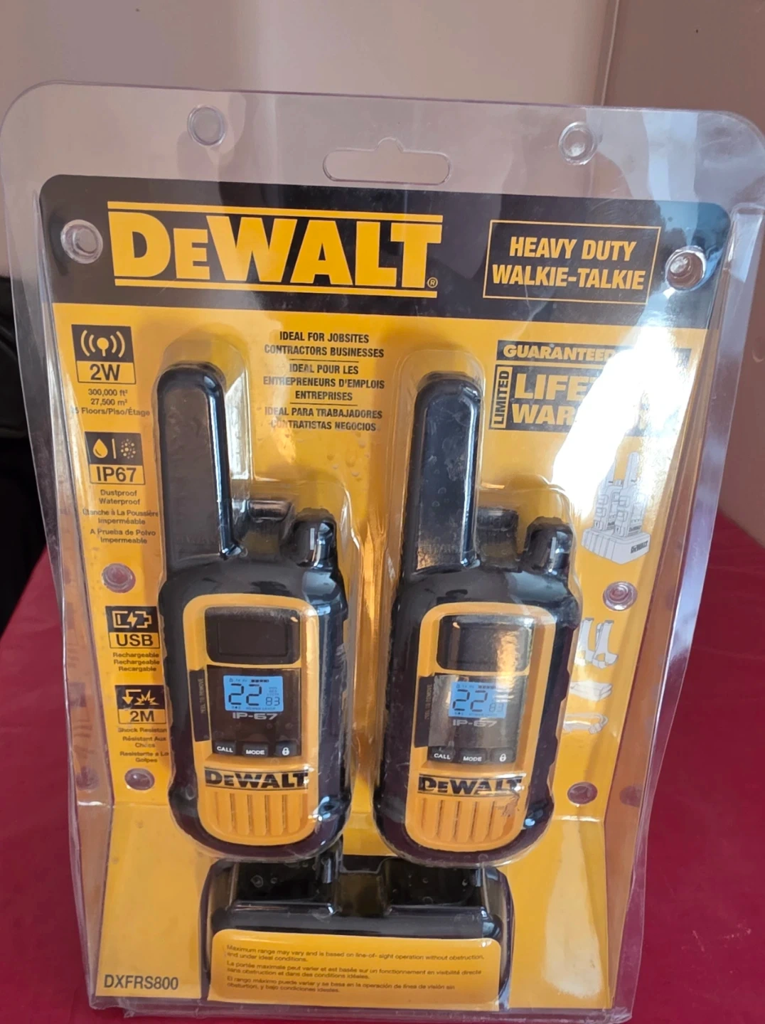 Selling a new set of DeWalt Heavy Duty Walkie-Talkies, model DXFRS800! These are ideal for jobsites and contractors, offering reliable communication. They're dustproof and waterproof (IP67 rated) and have a range of up to 300,000 ft. They also feature USB charging and shock resistance. Comes with the original packaging