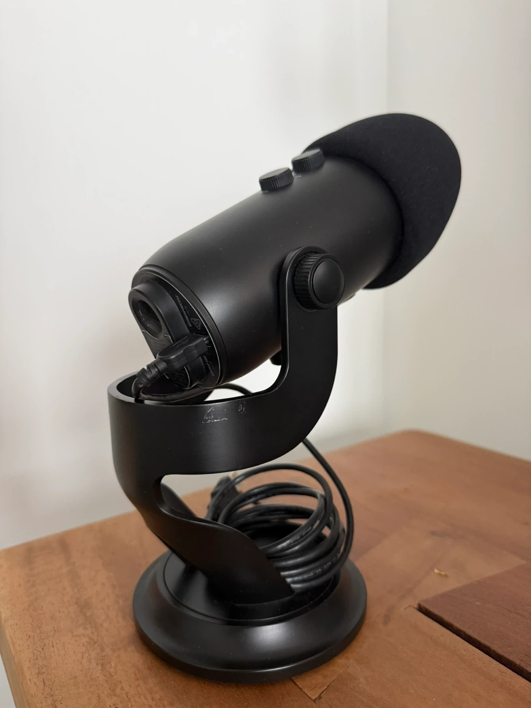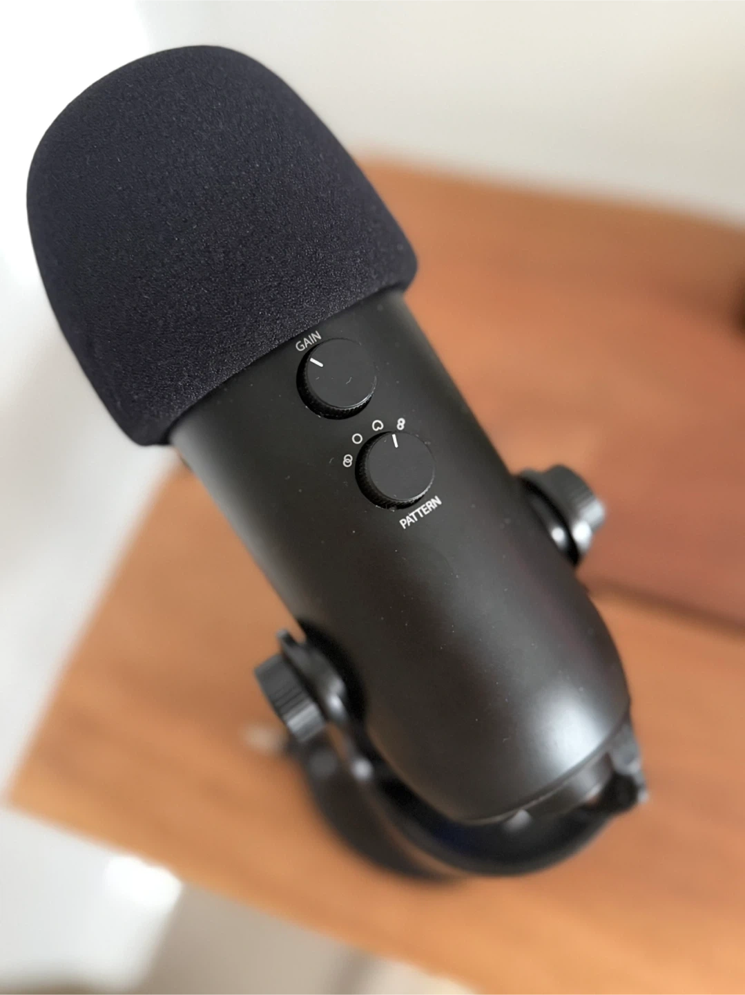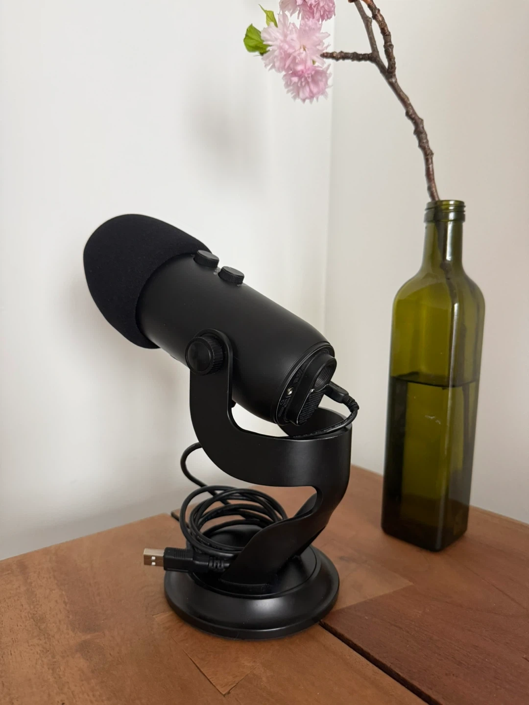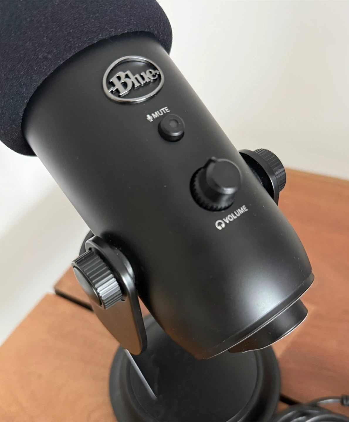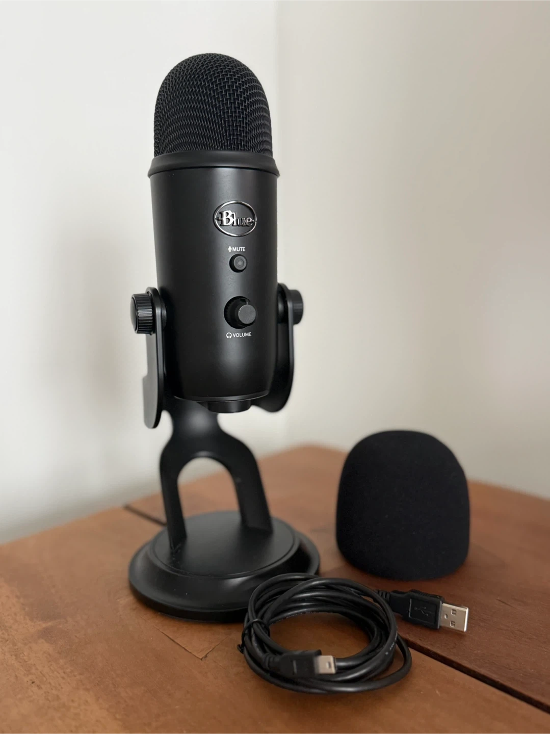 This is a black Blue Yeti USB microphone. It features a mute button and volume control knob. The microphone also has gain and pattern adjustment dials. Includes a USB cable and pop filter. In great condition!
