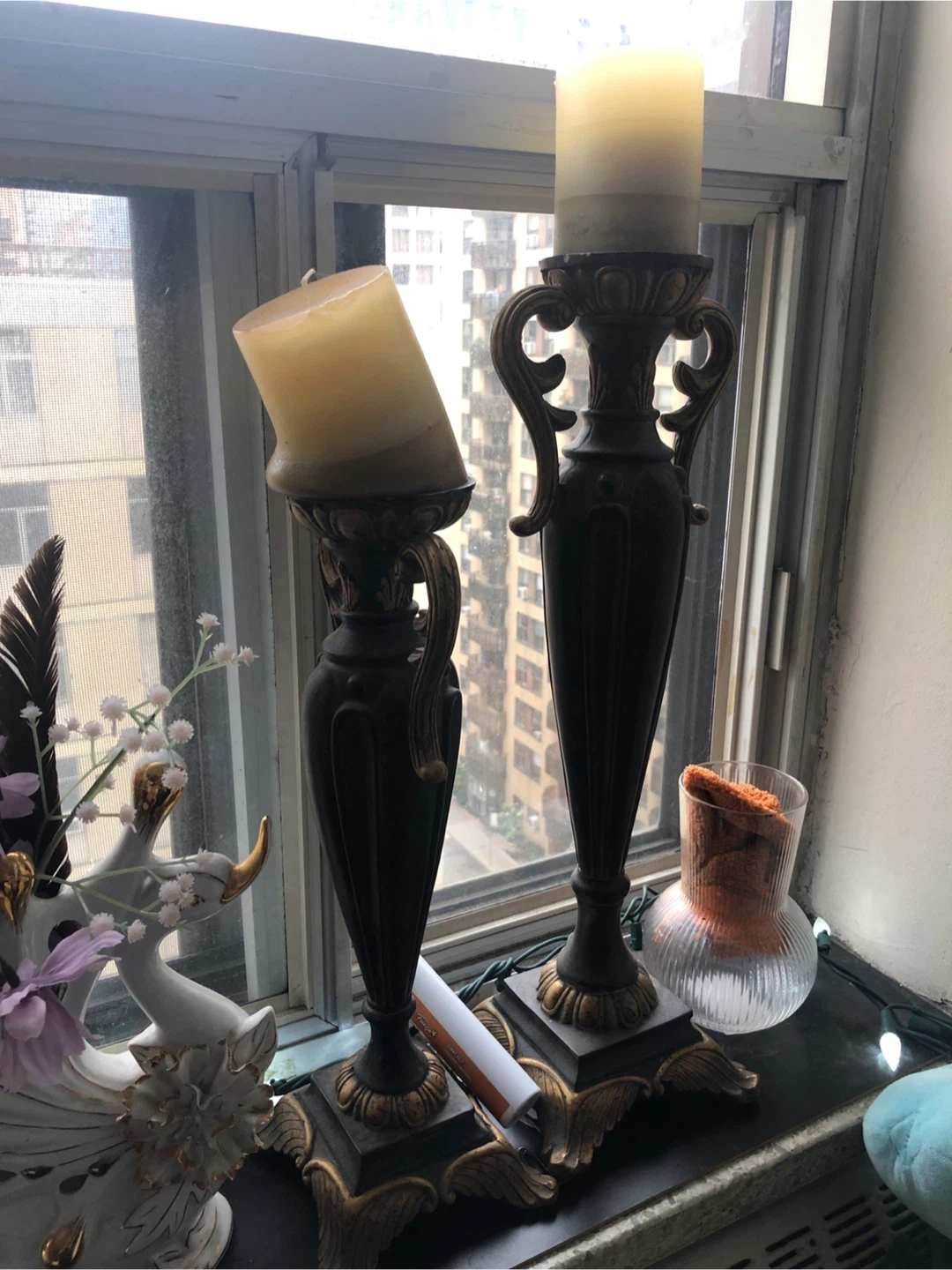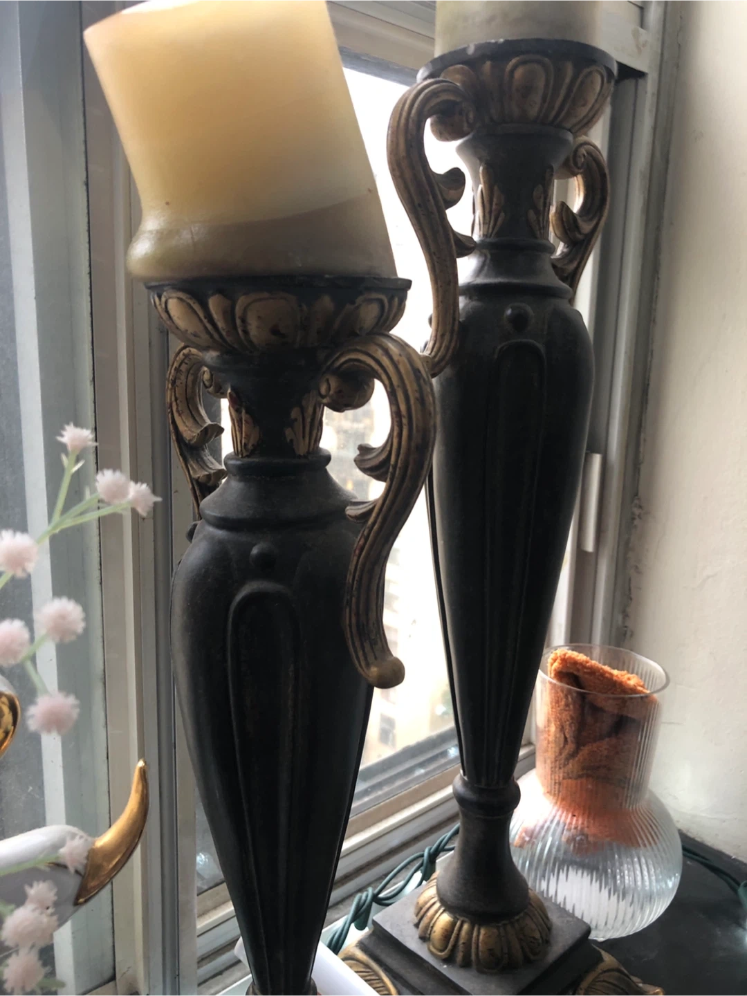 Selling a set of two candlestick holders. They have a vintage look with a black and gold colour scheme. They would look great on a mantle or as a centrepiece for a table