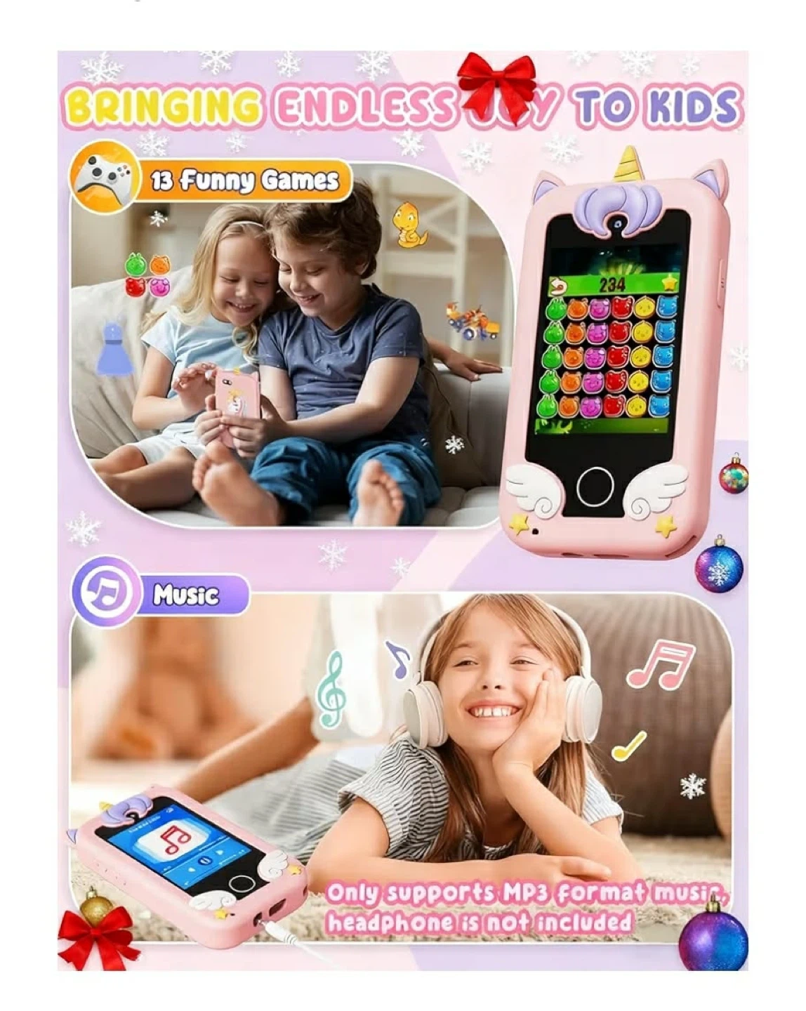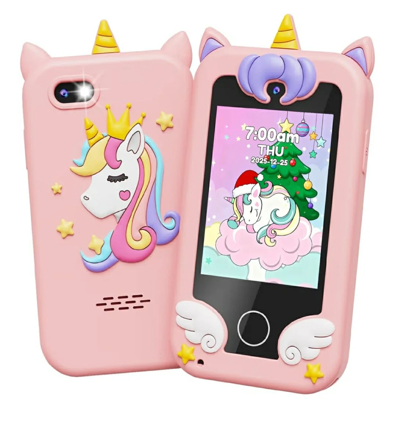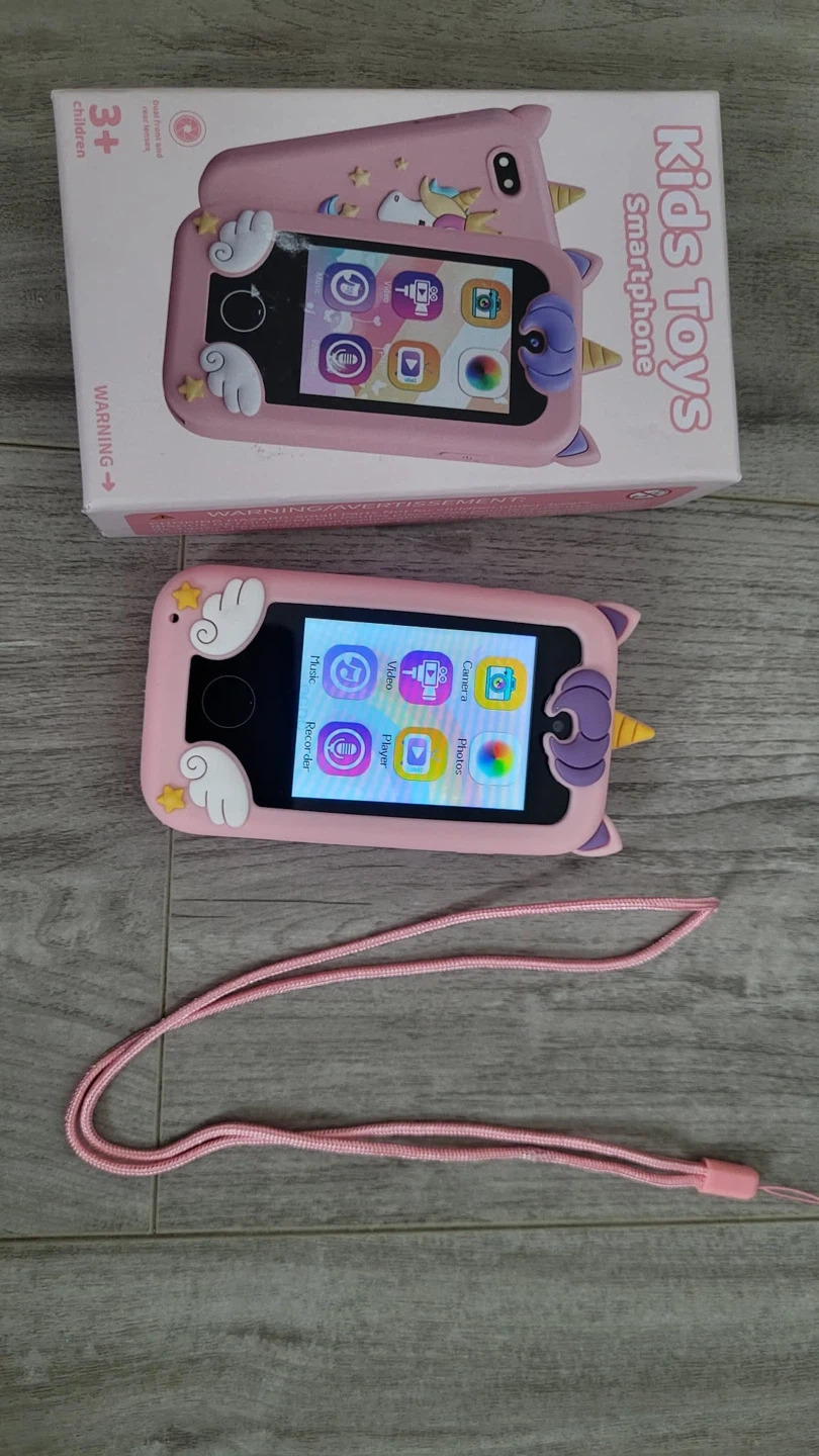 This cute pink silicone phone case features a fun unicorn design for kids! It includes 13 built-in games and 21 apps like a camera, music player, and more. Supports MP3 playback; headphones are not included. Perfect for keeping little ones entertained!
