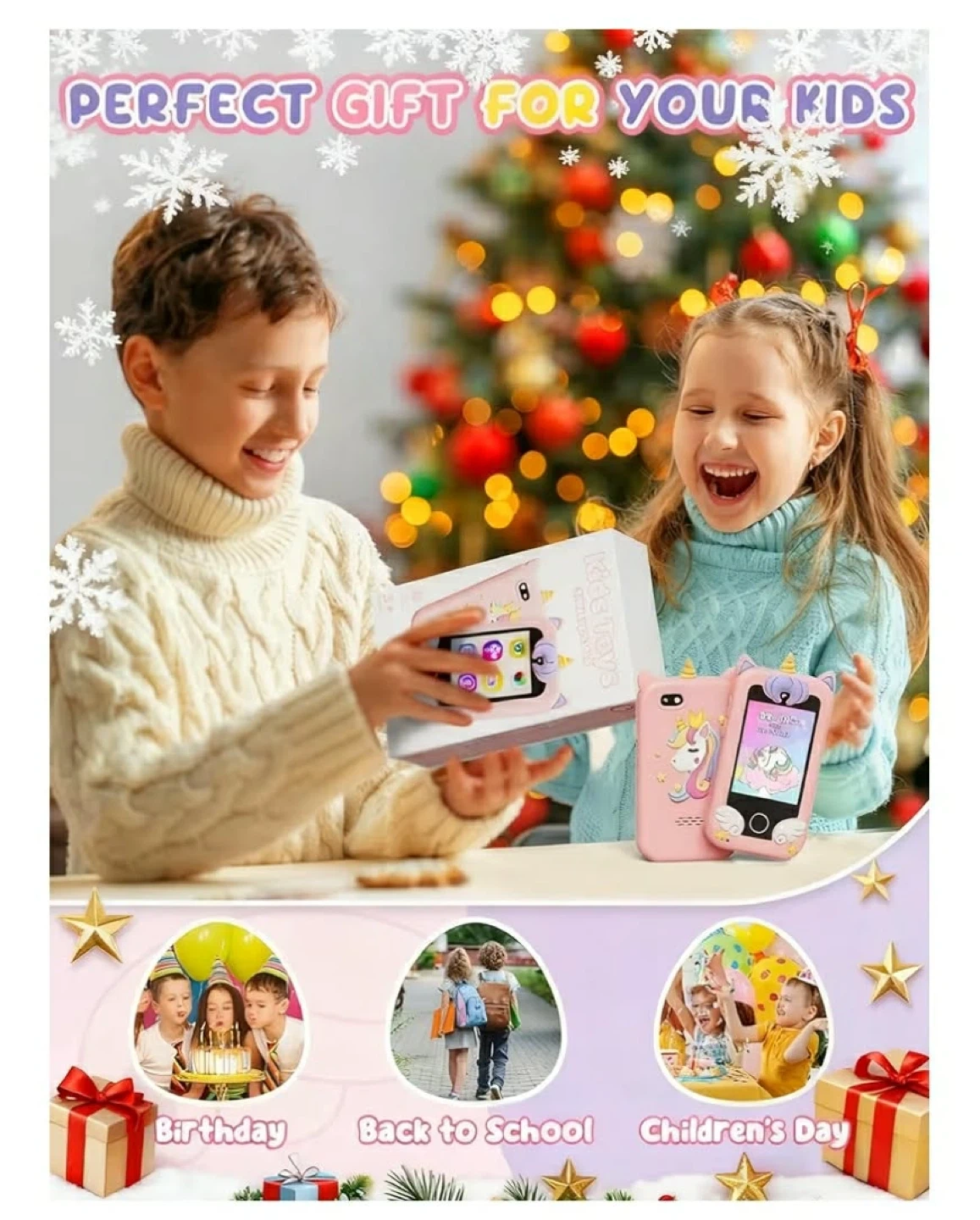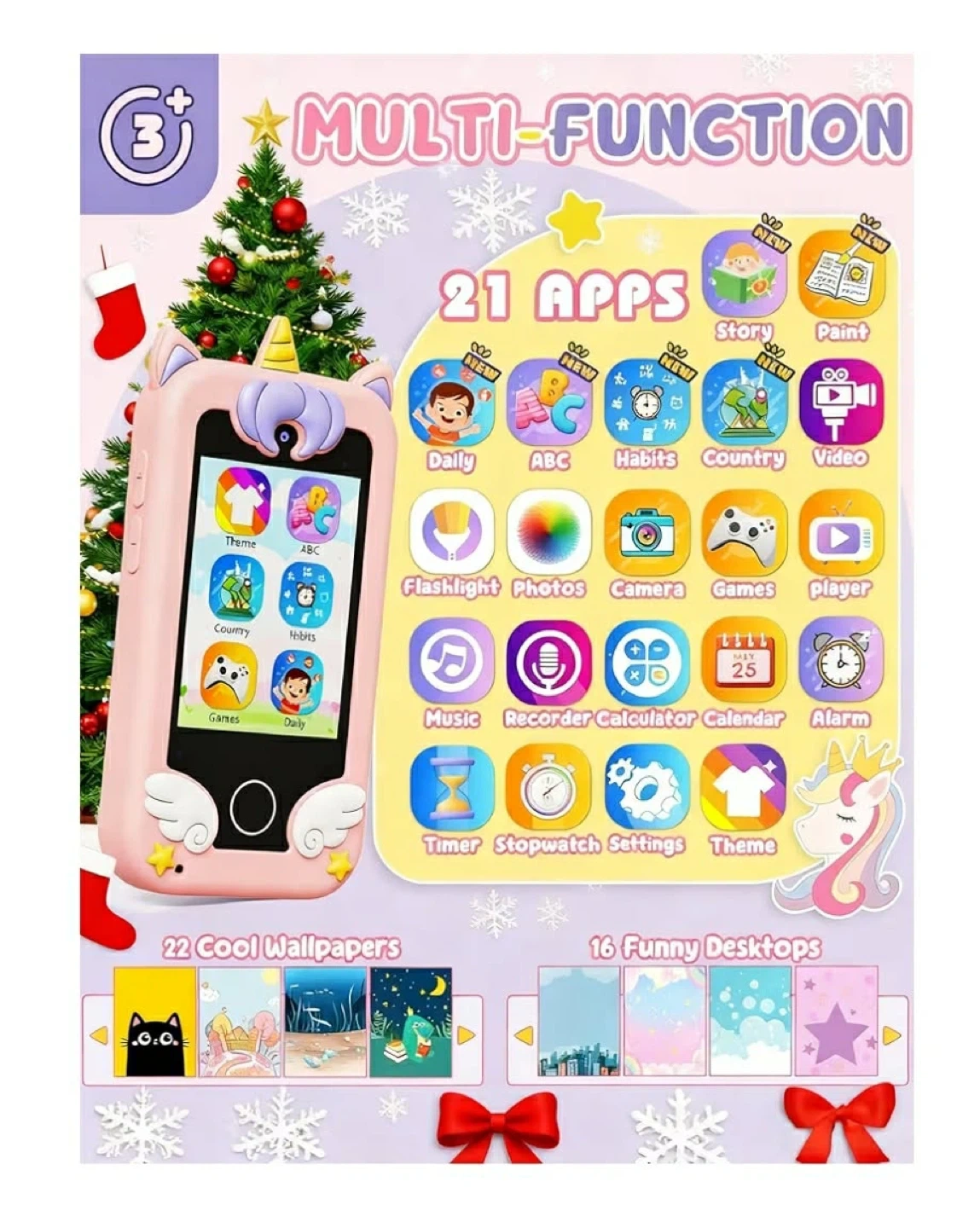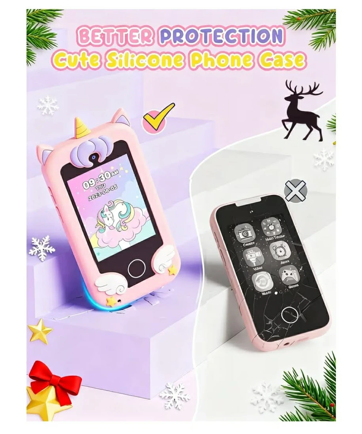 This cute pink silicone phone case features a fun unicorn design for kids! It includes 13 built-in games and 21 apps like a camera, music player, and more. Supports MP3 playback; headphones are not included. Perfect for keeping little ones entertained!