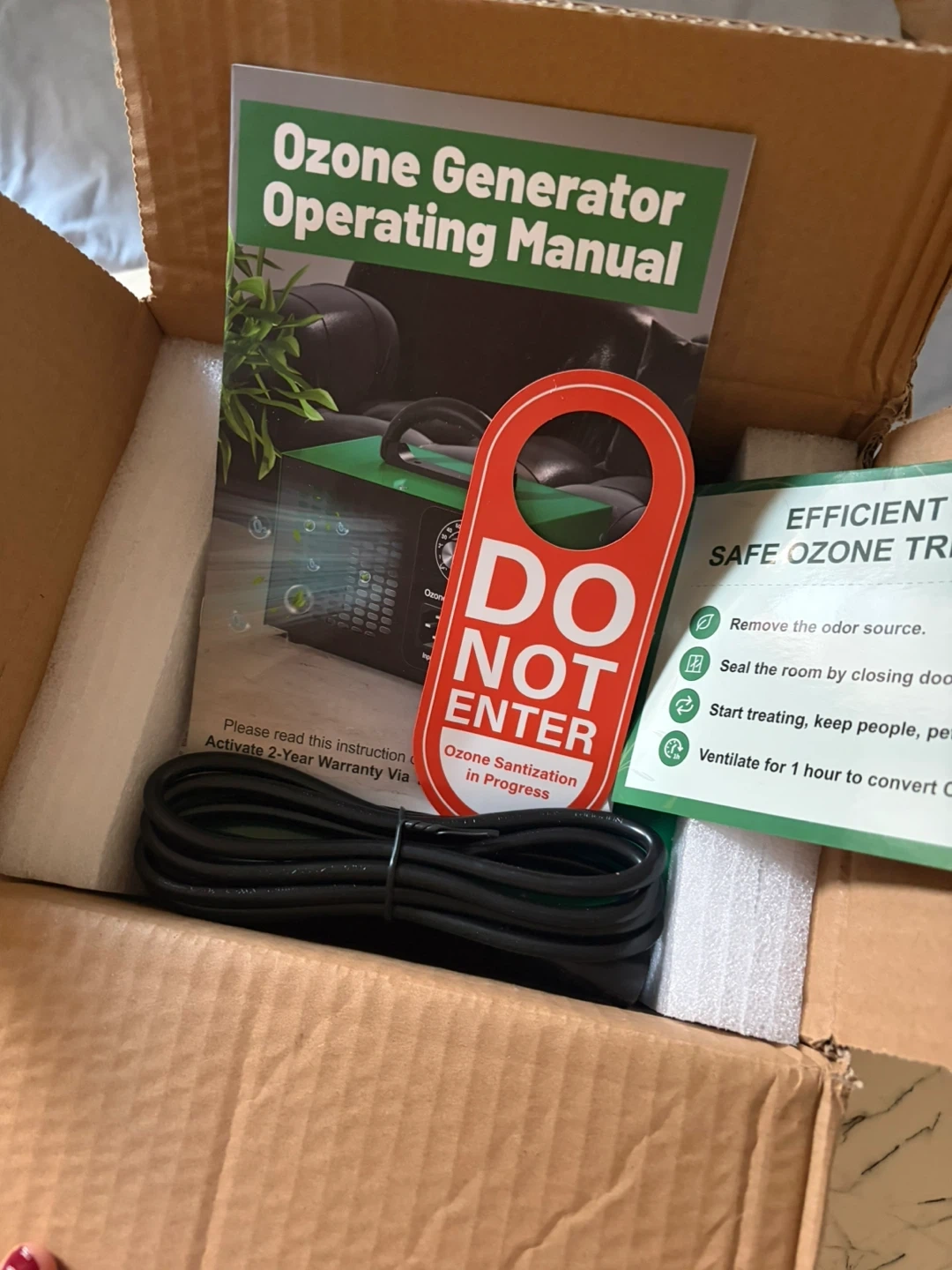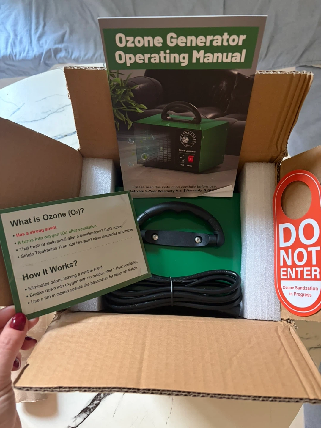 Brand new Ozone Generator and Operating Manual. Comes in original packaging. Eliminates odors, leaving a neutral scent. Breaks down oxygen with no residue after 1-hour ventilation. Includes power cord and 'Do Not Enter' sign. PLEASE follow the instructions and ensure no people, plants, animals or anything living is left in the space. Once purchased, accurate use of the ozone generator is up to the buyer and seller will not be held responsible