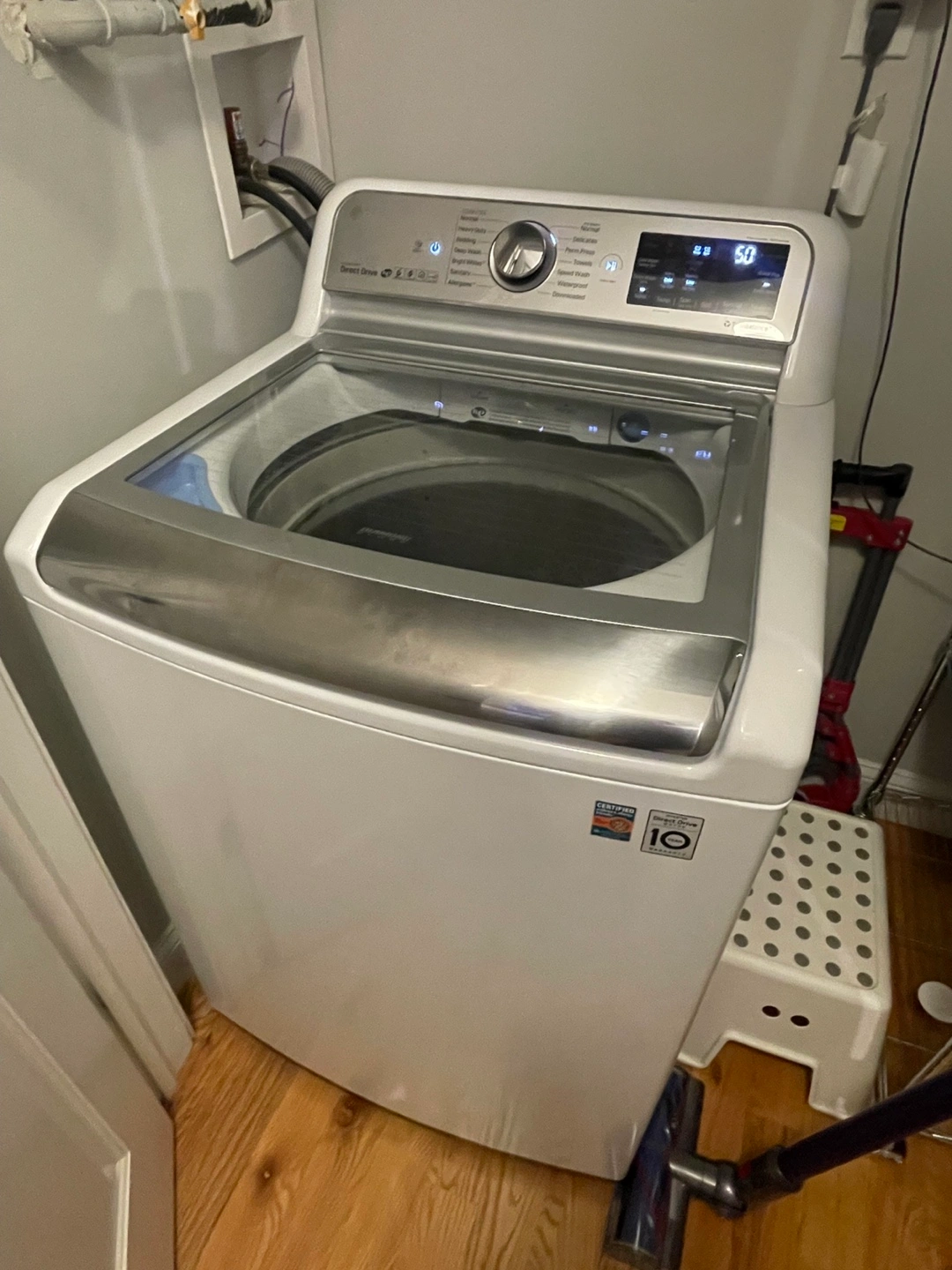 Washer only. White, top-loading washer with a clear lid. Features Smart Drive, TurboWash 3D, and Wifi-Enabled capabilities.