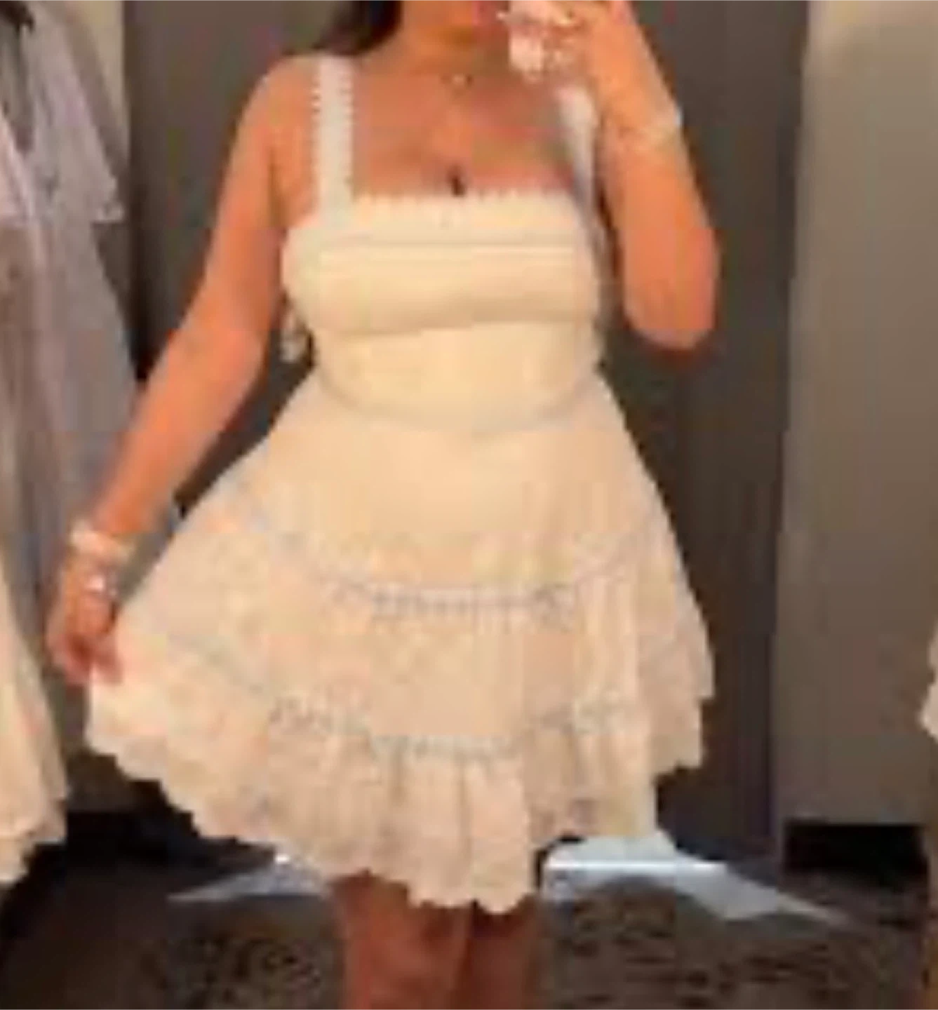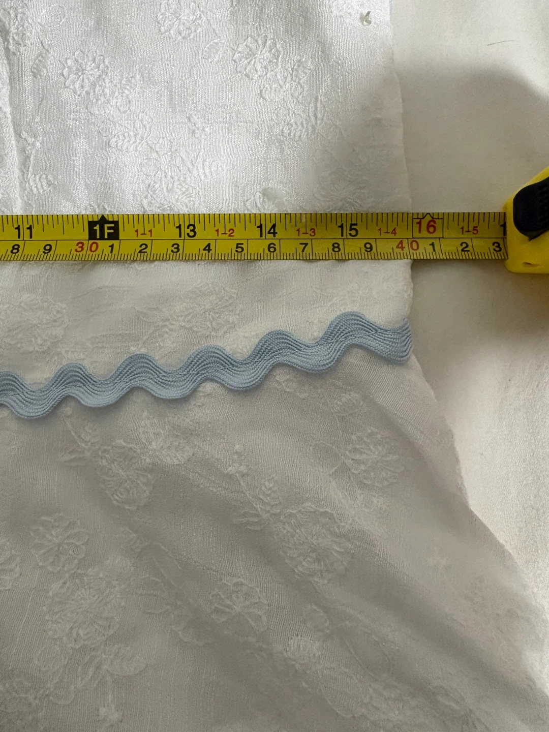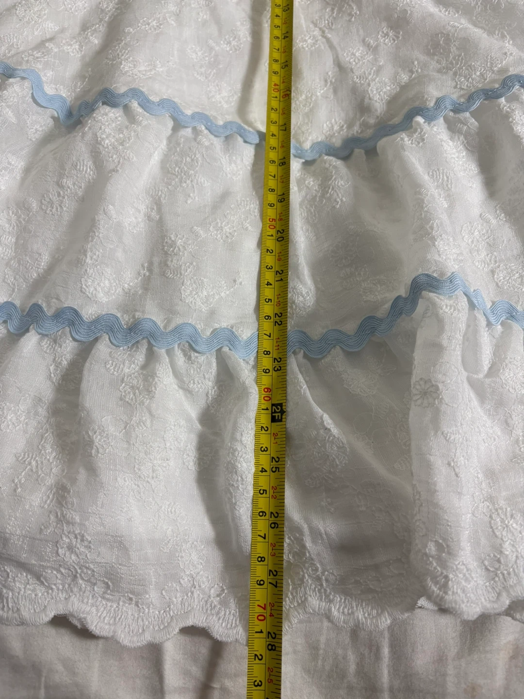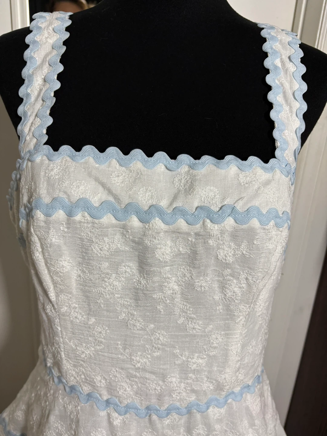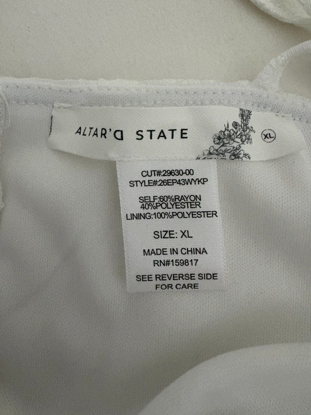 Altar'd State mini dress in white with blue lace trim. Self: 60% rayon, 40% polyester. Lining: 100% polyester. Size XL. Made in China.