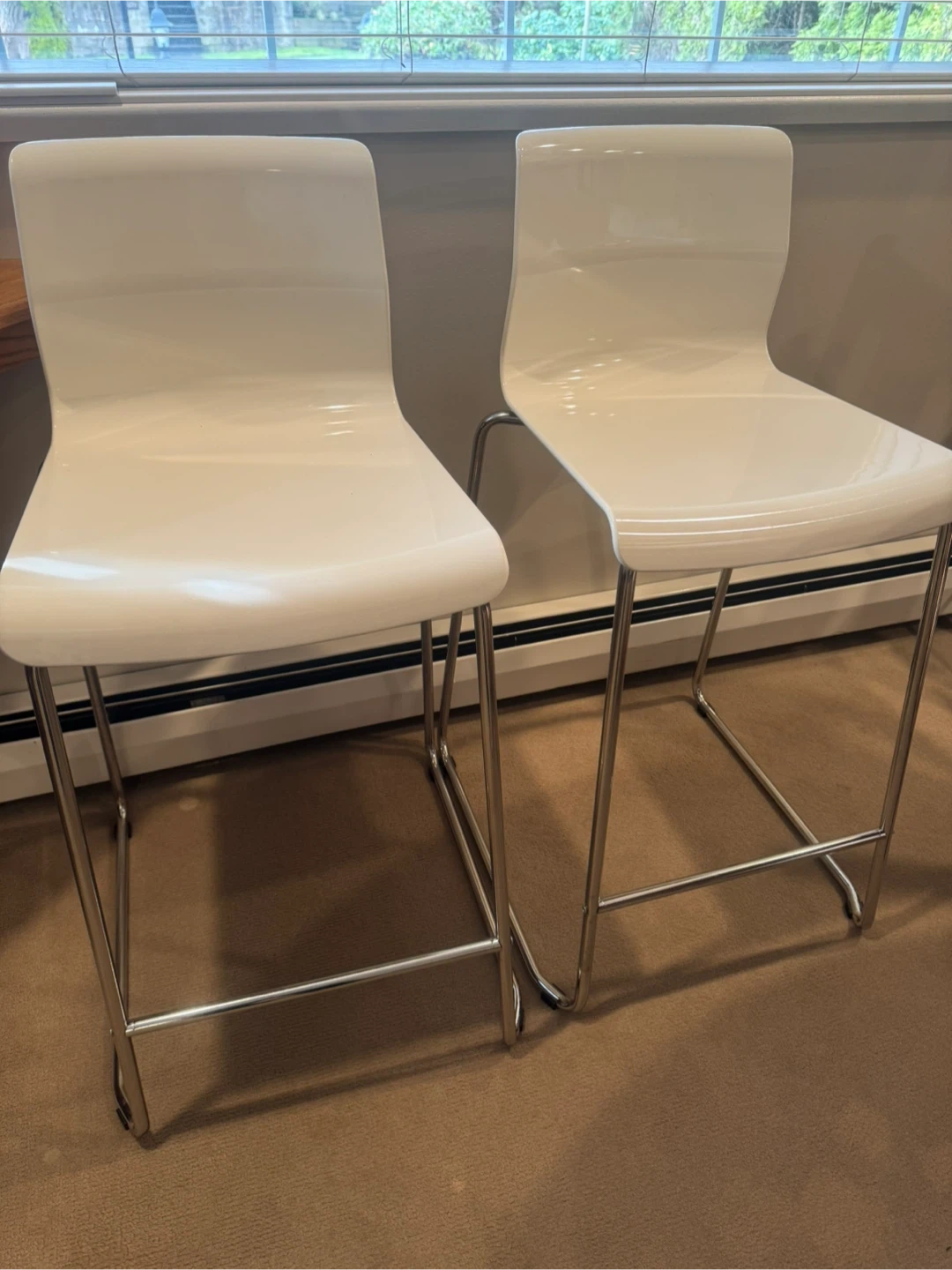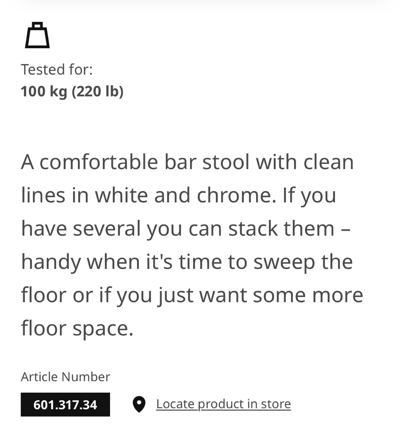 Comfortable white and chrome plated bar stool with clean lines. Seat height is 66 cm (26"). It's tested for 100 kg (220 lb). These stools can be stacked for easy storage when not in use.