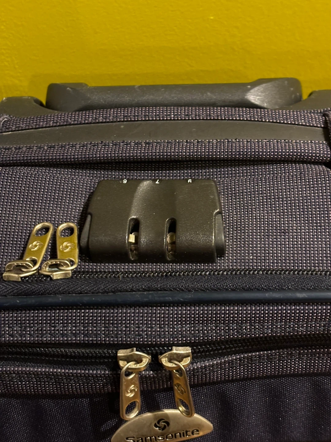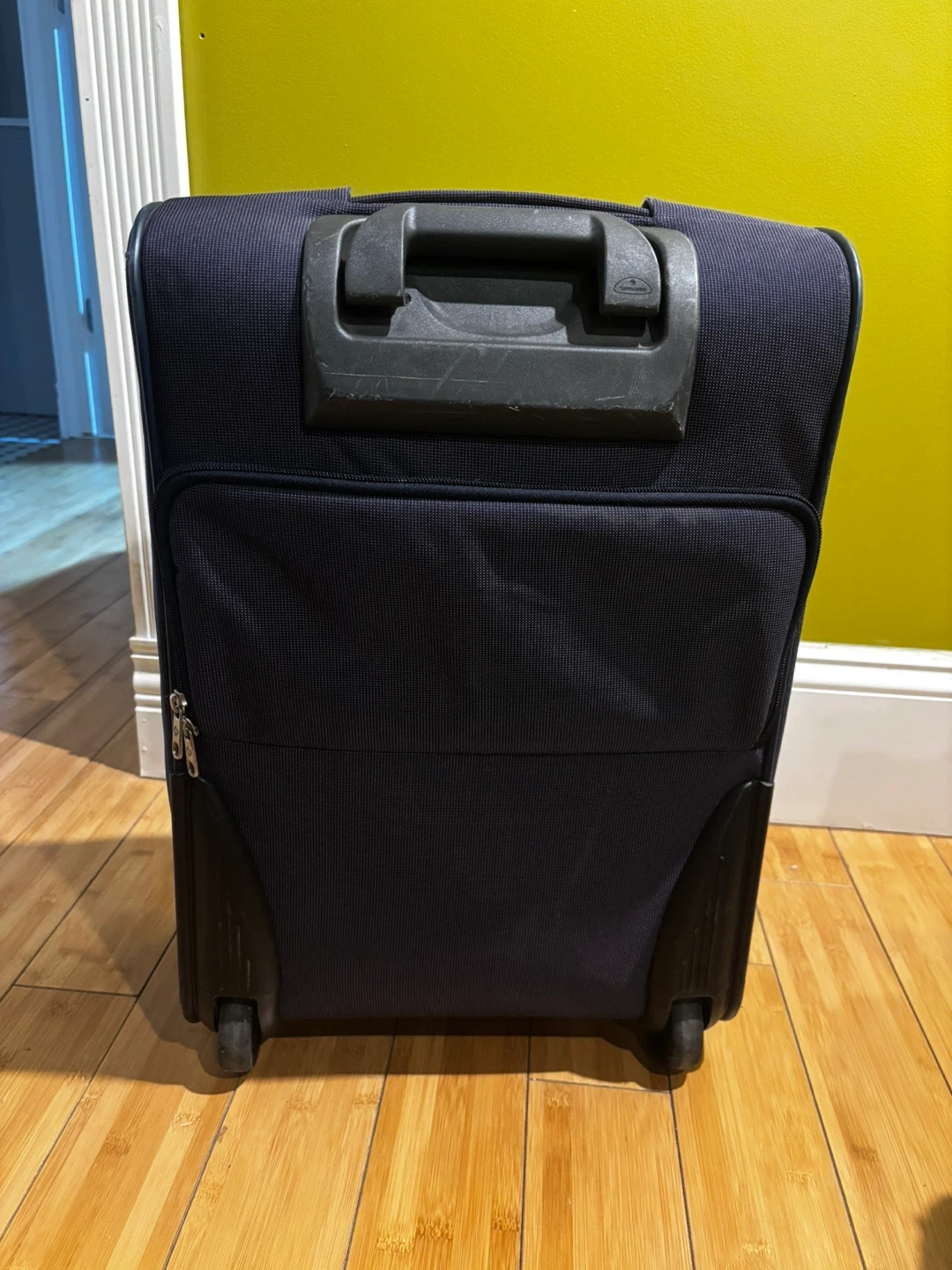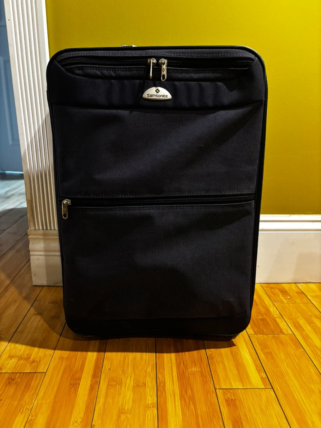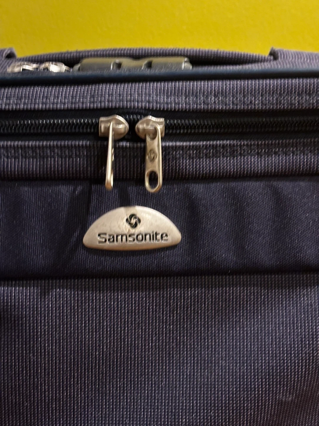 Samsonite navy blue spinner suitcase. It's made of durable fabric. TSA-approved combination lock included. Great for travel!