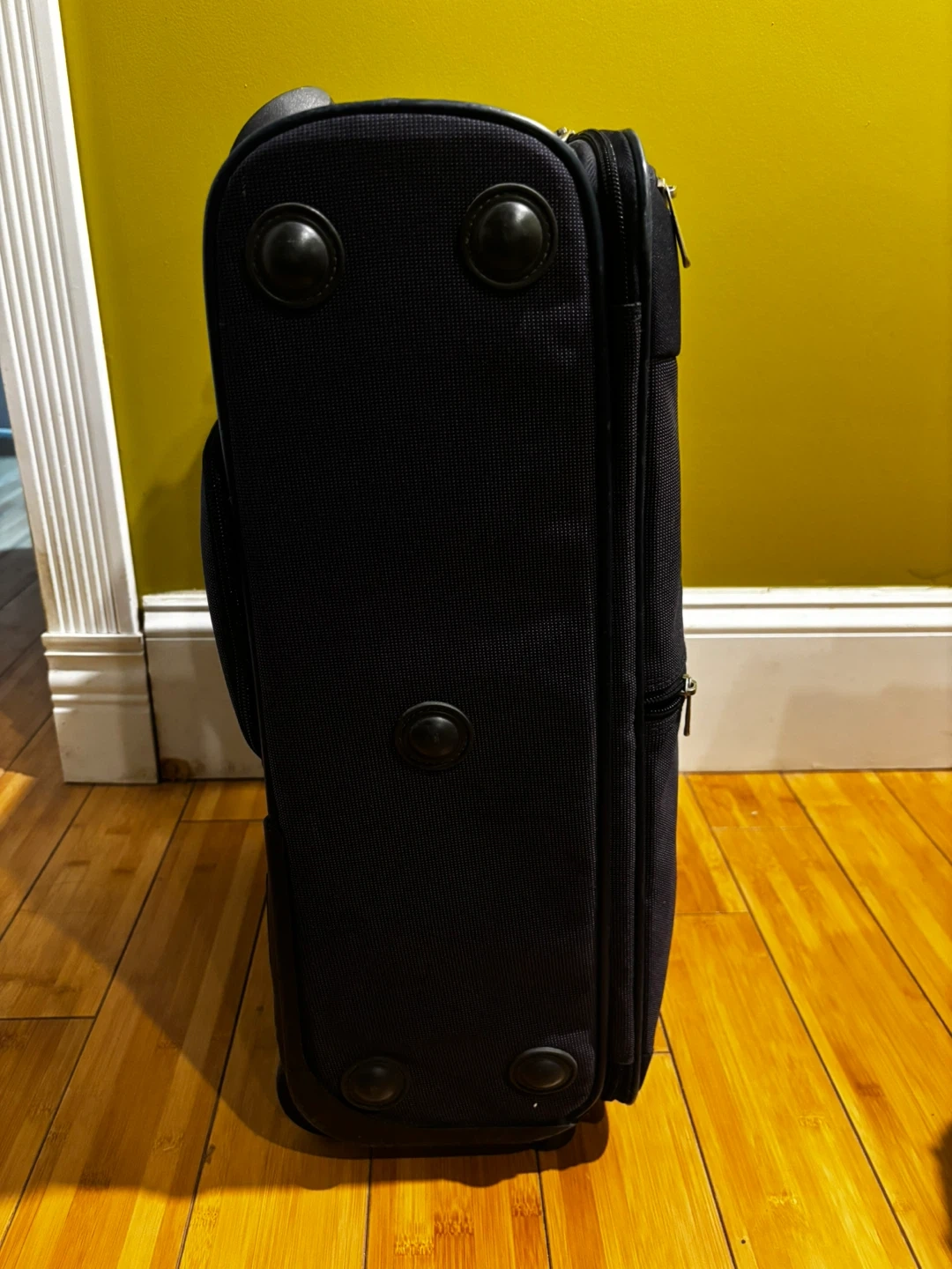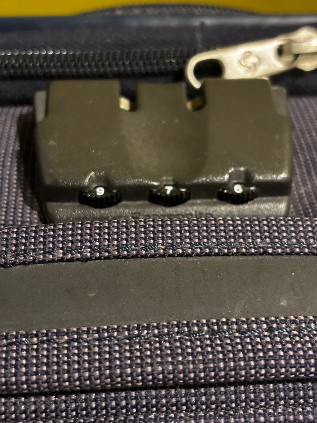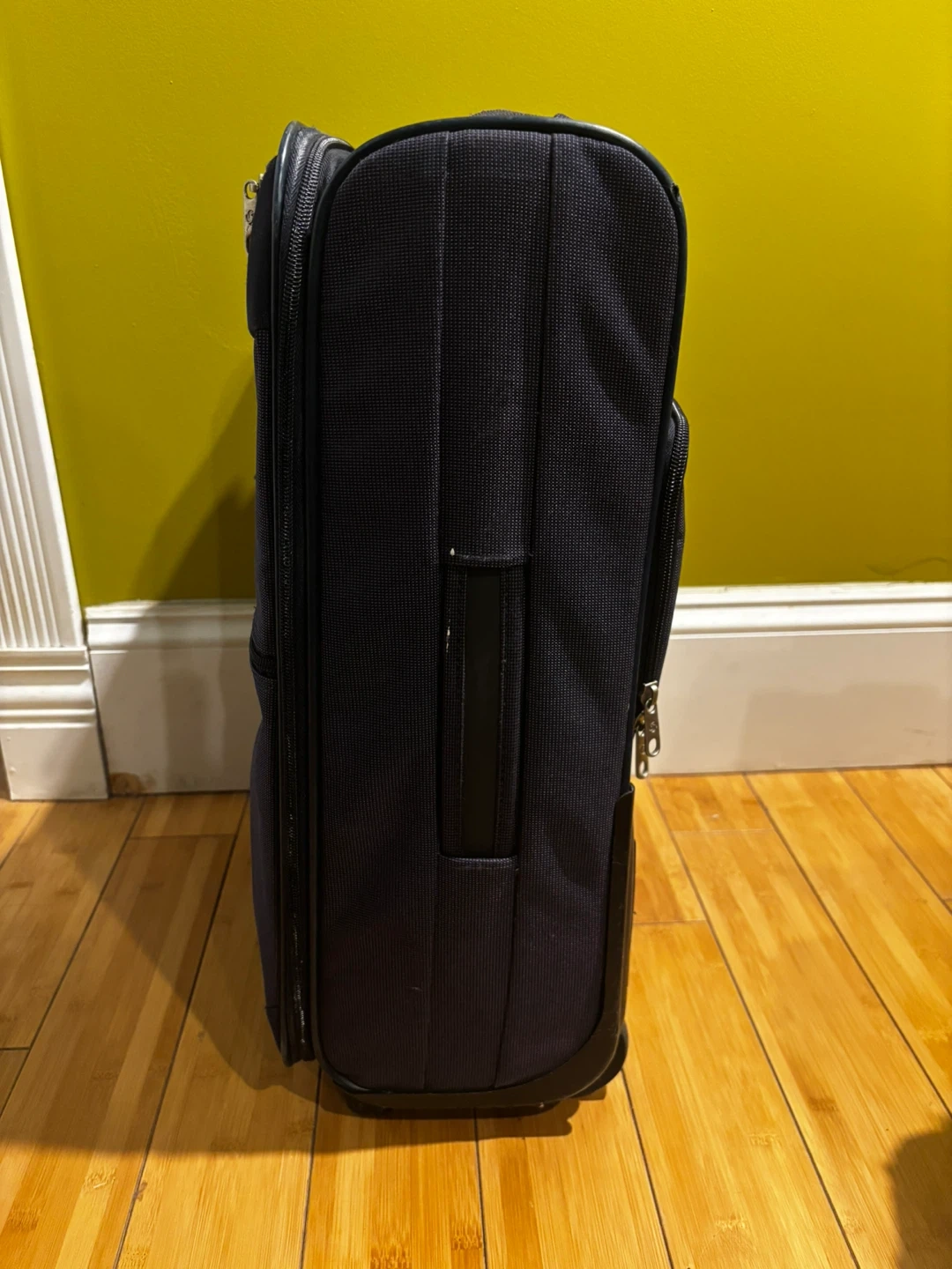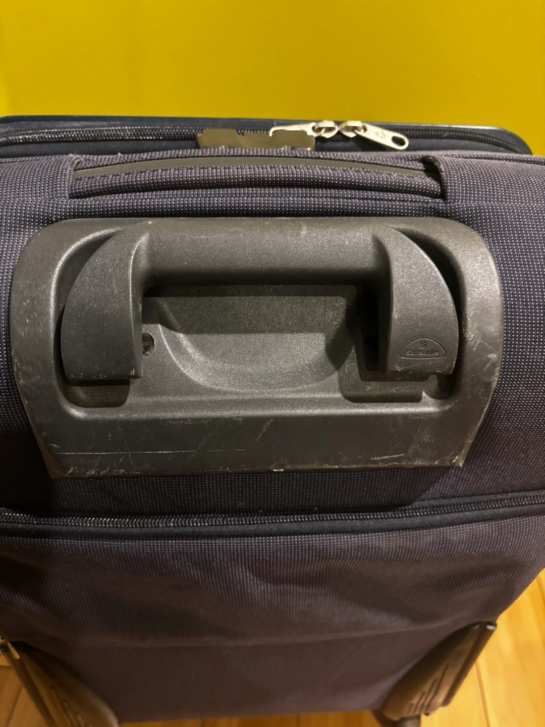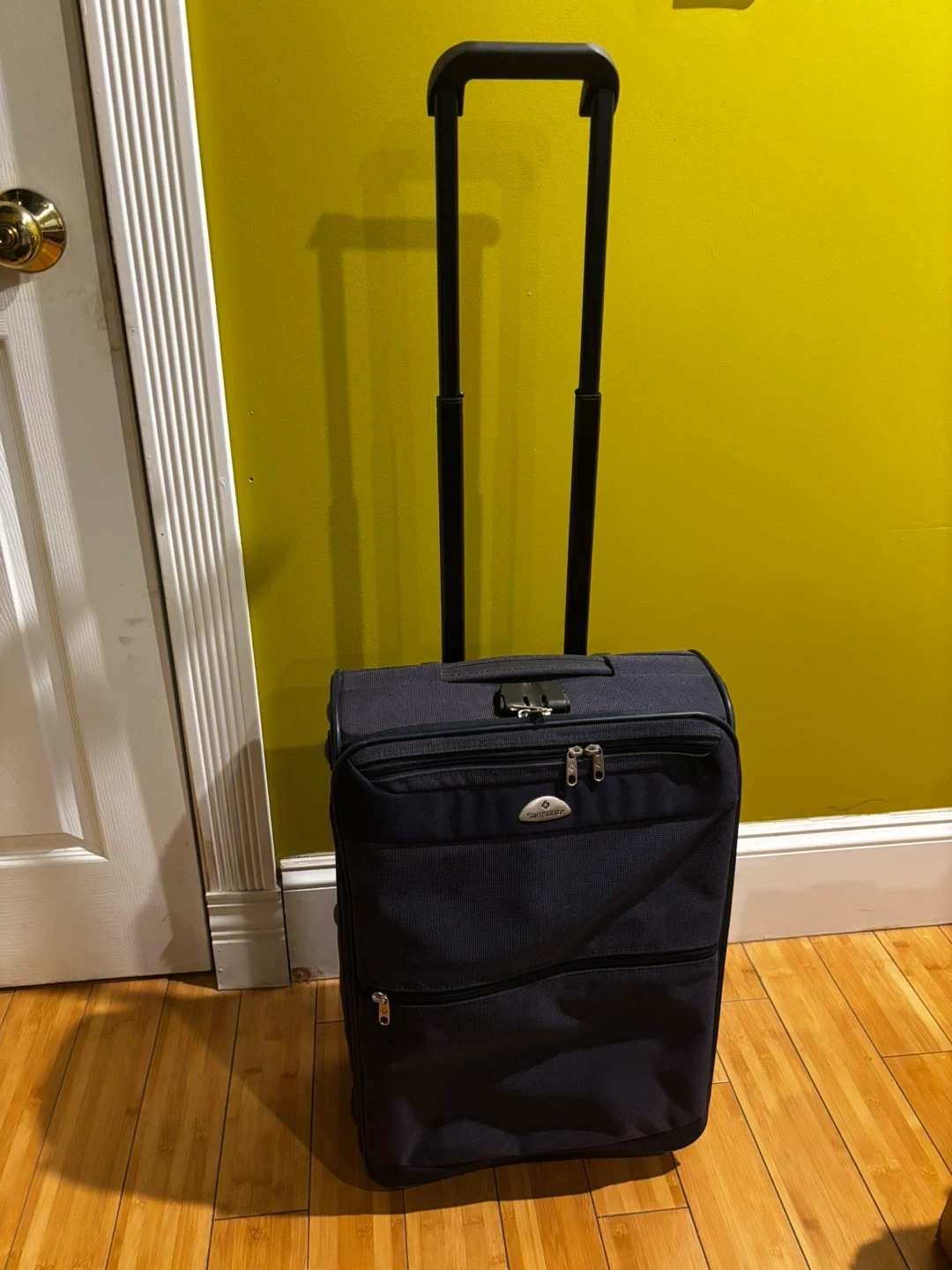 Samsonite navy blue spinner suitcase. It's made of durable fabric. TSA-approved combination lock included. Great for travel!