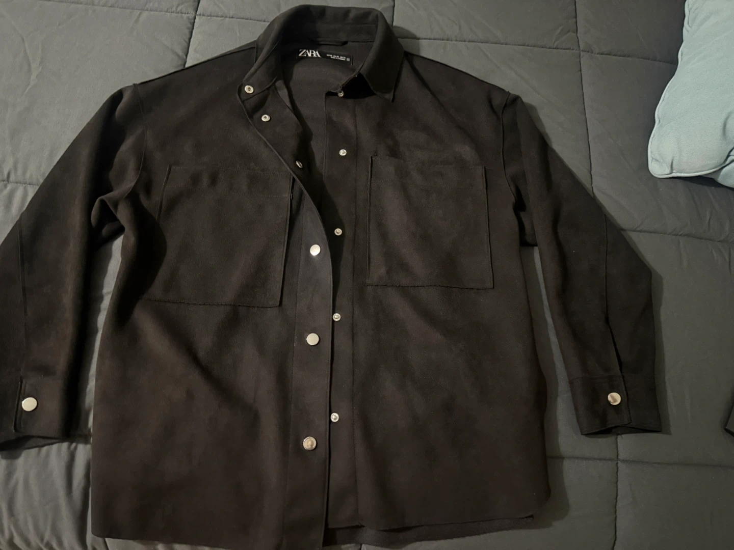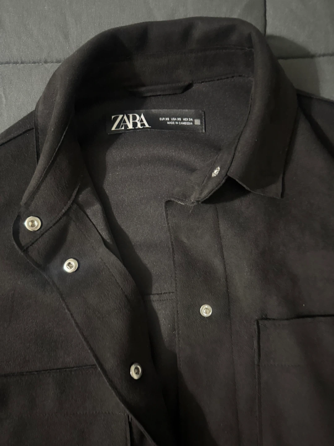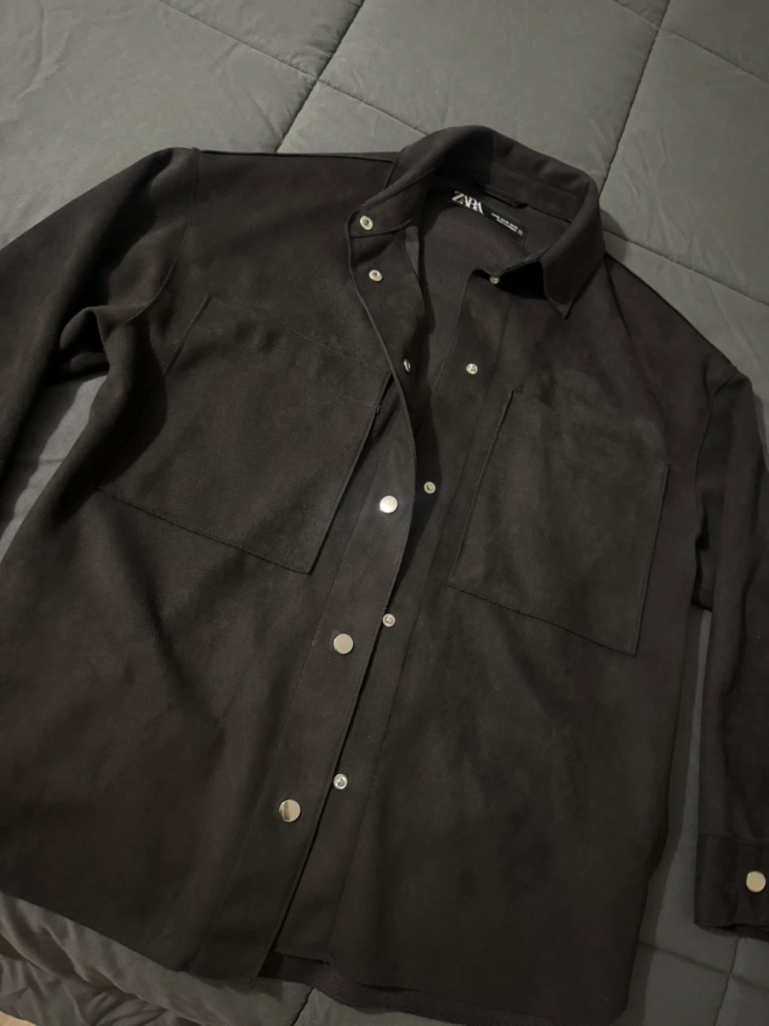 ZARA black shirt jacket with a soft faux suede finish. It features two chest pockets and silver snap button closure. Size XS.