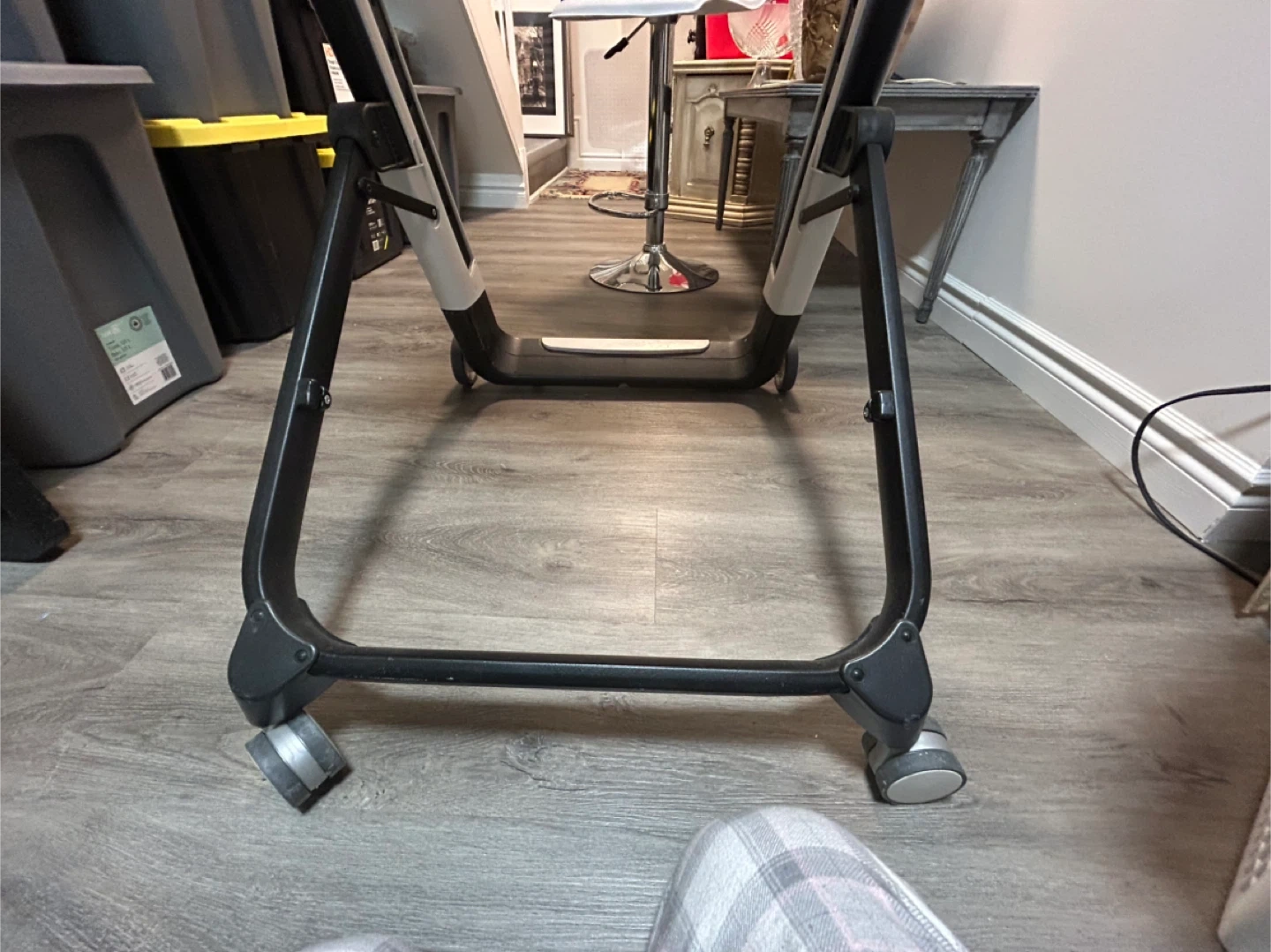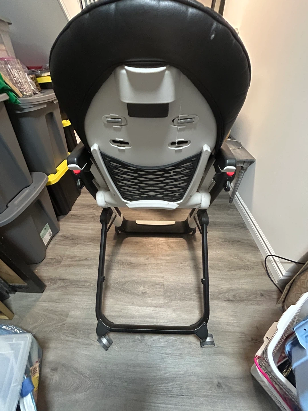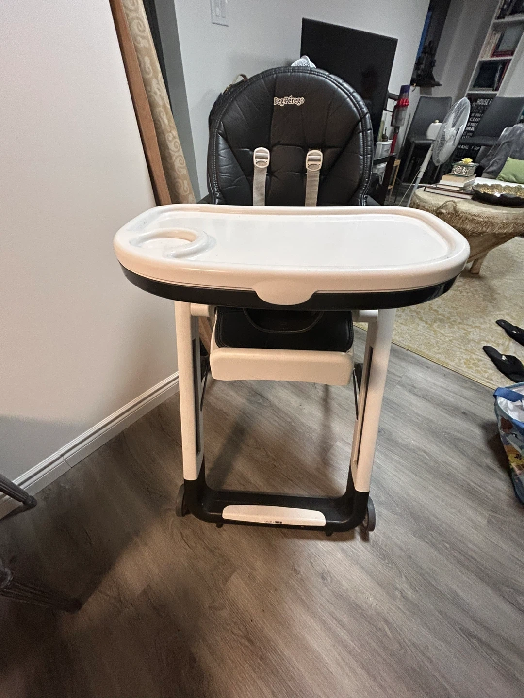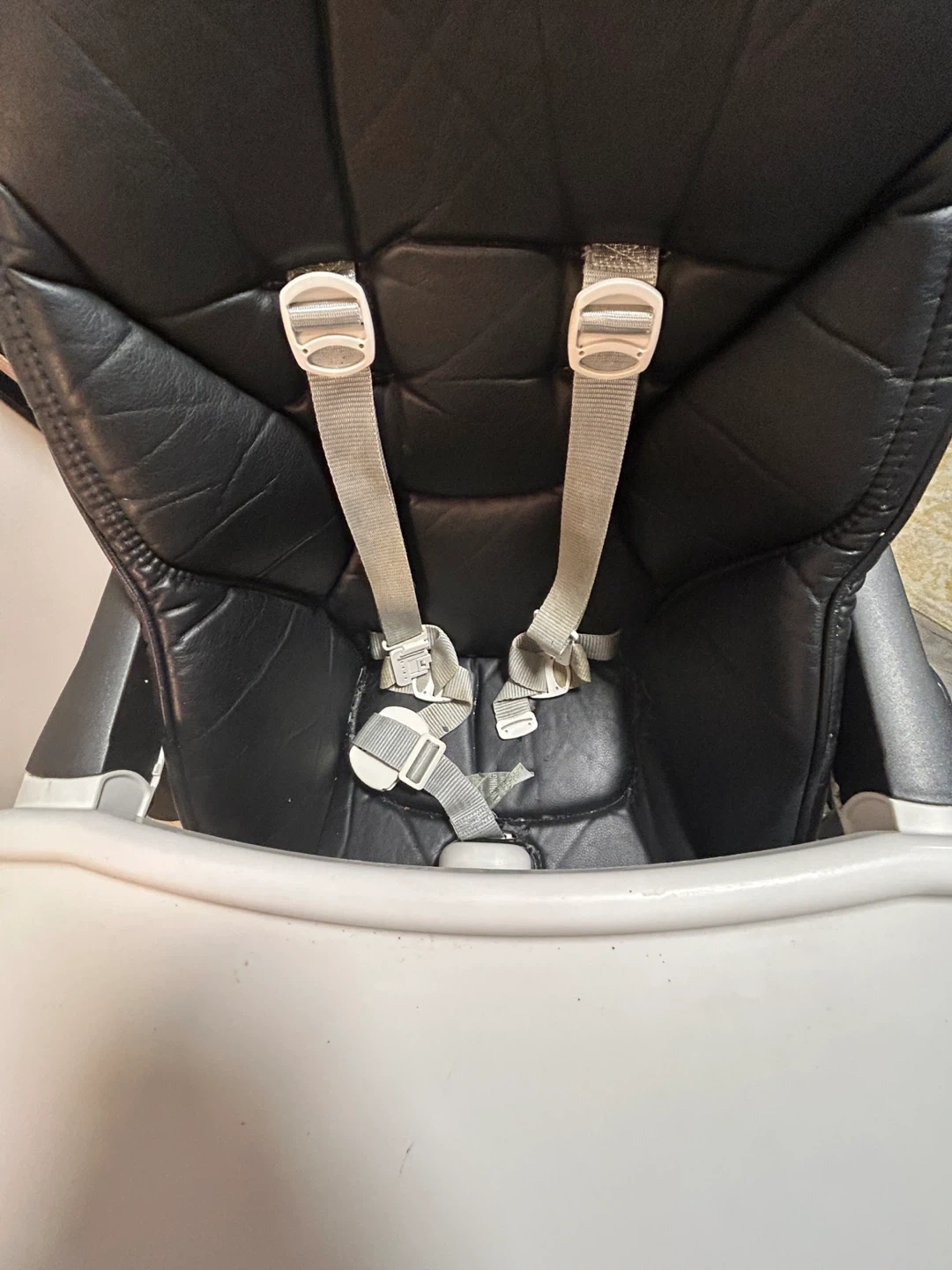 This Peg Perego high chair features a black leatherette seat and a white tray. It has a 5-point harness for safety. It's easy to clean and has wheels for mobility.