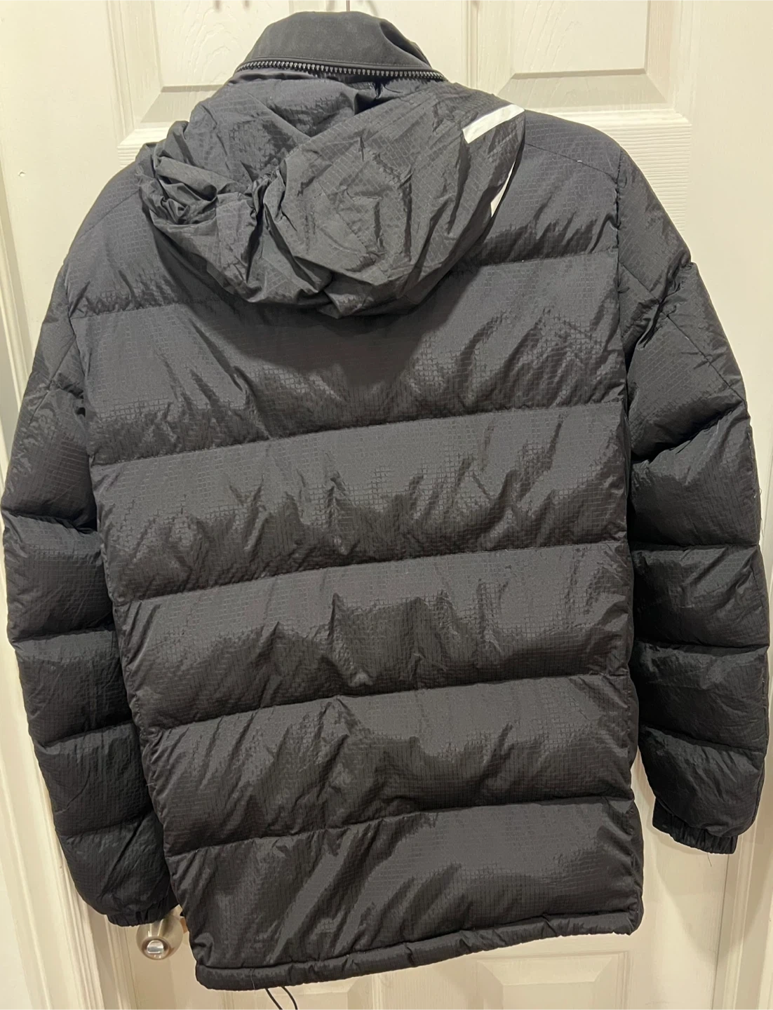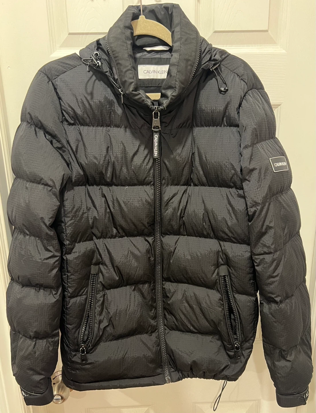 This is a black Calvin Klein puffer jacket with a hood. It's made with a shiny, textured material. The jacket has a full zip closure and zippered pockets. Size small
