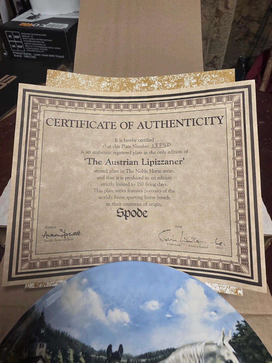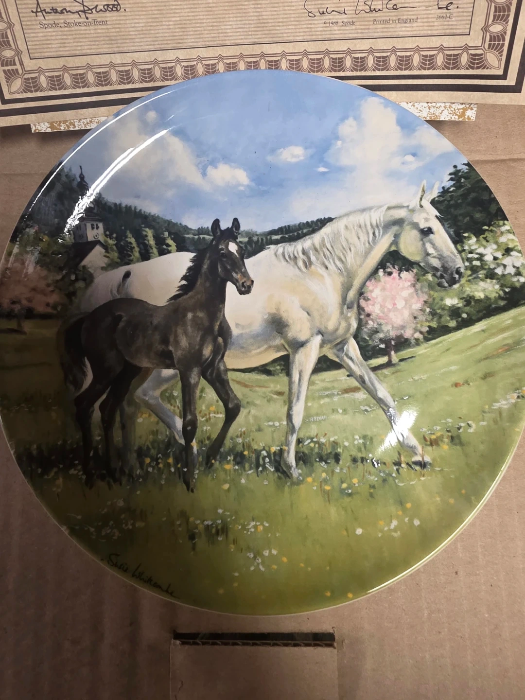 This is the second plate in The Noble Horse series, titled 'The Austrian Lipizzaner'. It's an authentic registered plate, produced in an edition limited to 150 firing days. The plate features portraits of the world's finest sporting horse breeds. Made in England.