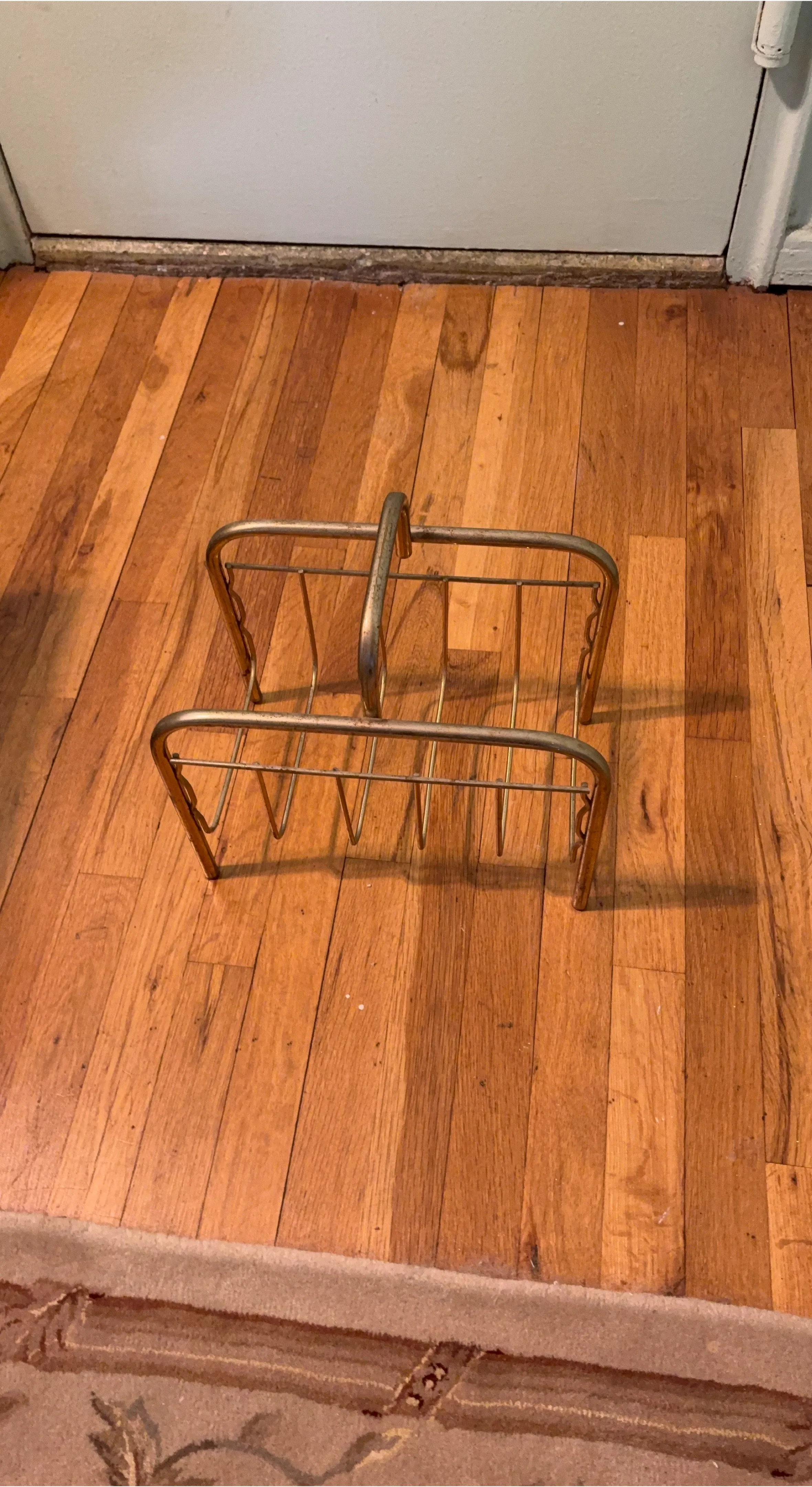 This is a vintage metal magazine rack with a brass-like finish. It has a sturdy design with multiple slots for organizing magazines or mail. It's perfect for keeping your entryway or living room tidy!