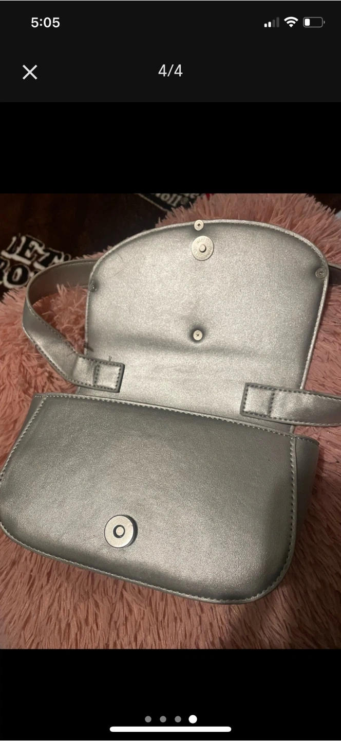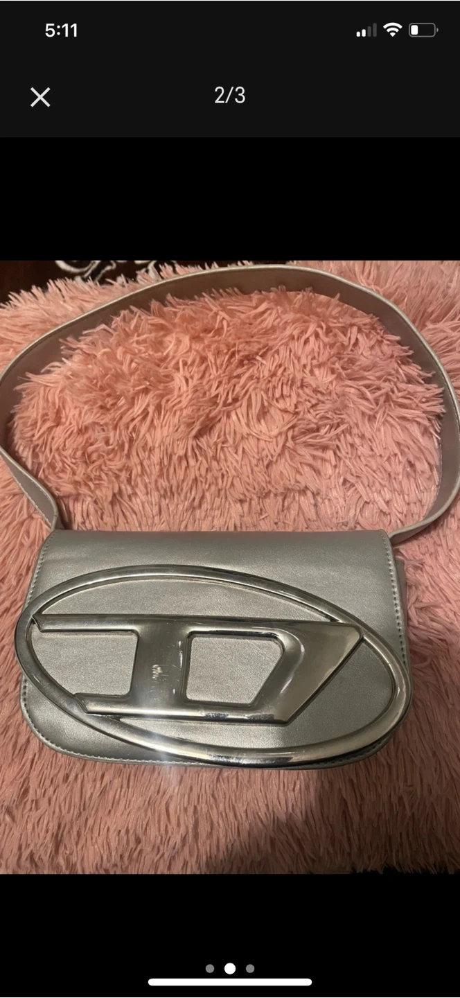 This is a silver shoulder bag from Diesel. It features a large D logo on the front flap and a magnetic closure. The interior has one main compartment.
