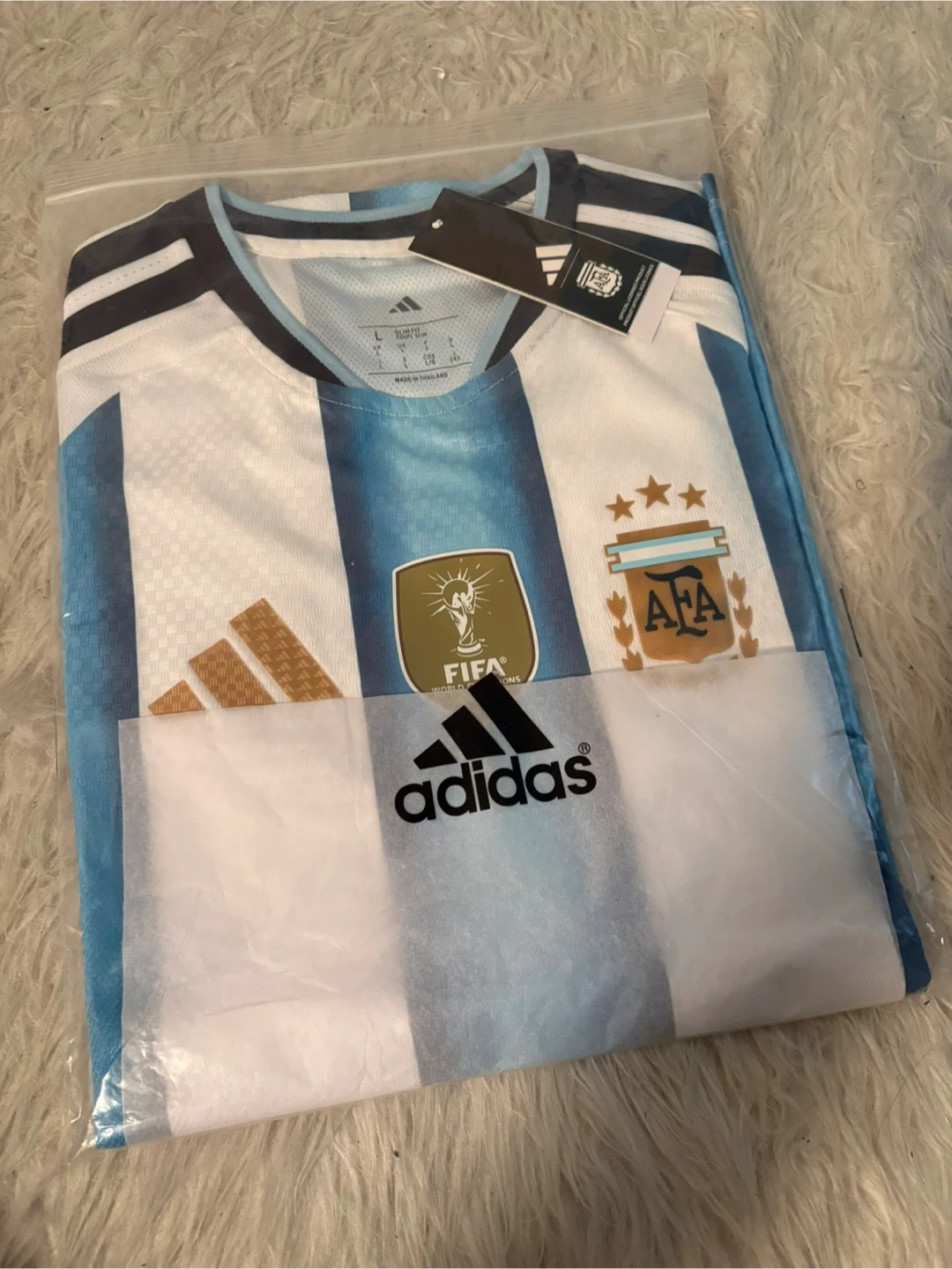 Brand new Argentina Adidas jersey, never worn. It has never been used. The jersey comes complete with the Adidas tags and packaging, as shown in the photos.