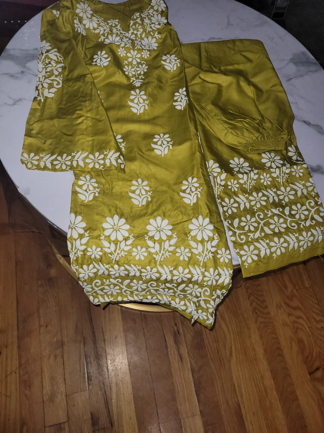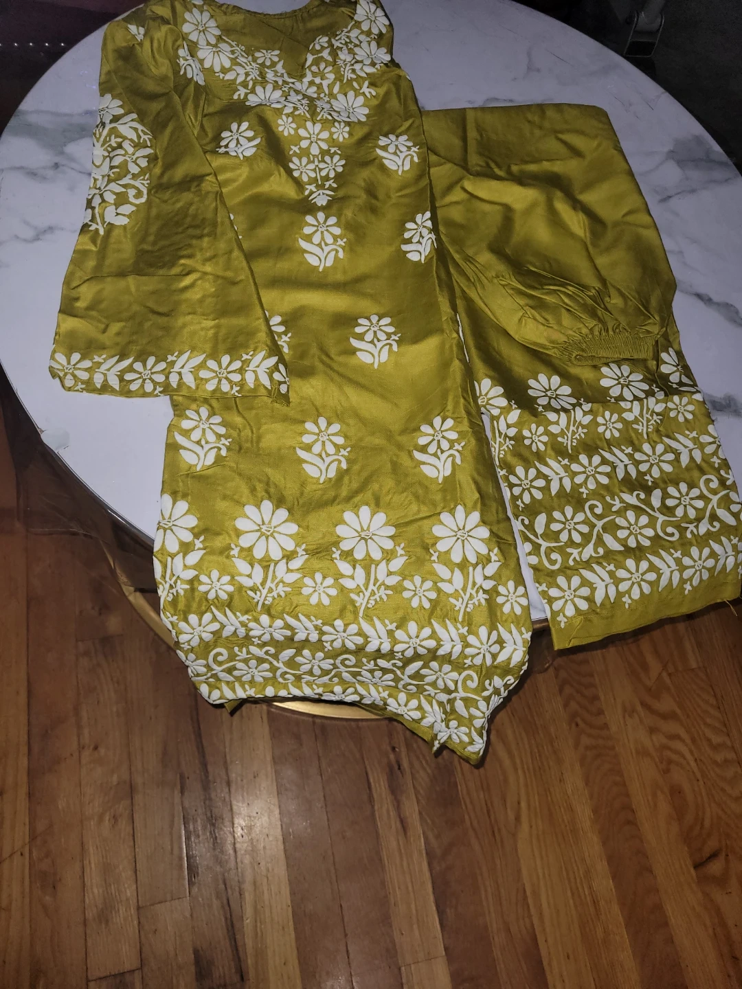 This women's suit set is a beautiful olive green color with white floral embroidery. It includes a top and matching pants. The fabric appears to be silk or a silk blend with a subtle sheen. This outfit is perfect for casual wear or dressing up!