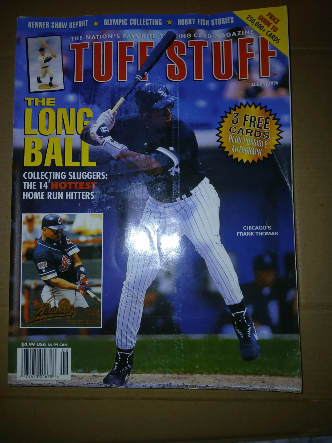 This is the August 1996 issue of Tuff Stuff Magazine, featuring 'The Long Ball' and 'Collecting Sluggers: The 14 Hottest Home Run Hitters'. It includes articles on Chicago's Frank Thomas and other collecting topics. A price guide to 250,000+ cards is also included.