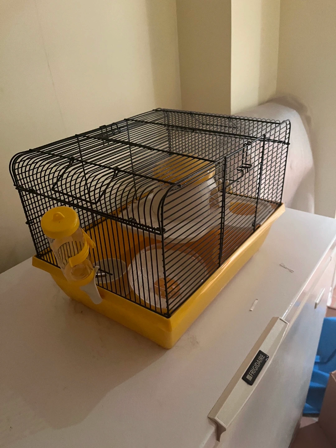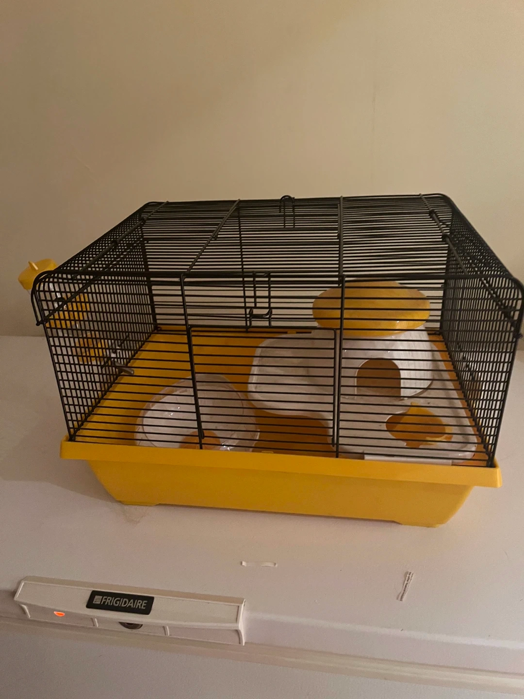 Selling a hamster cage in good condition! It's yellow and black, and comes with a water bottle and a little house for your hamster to hide in. Perfect for a small pet!