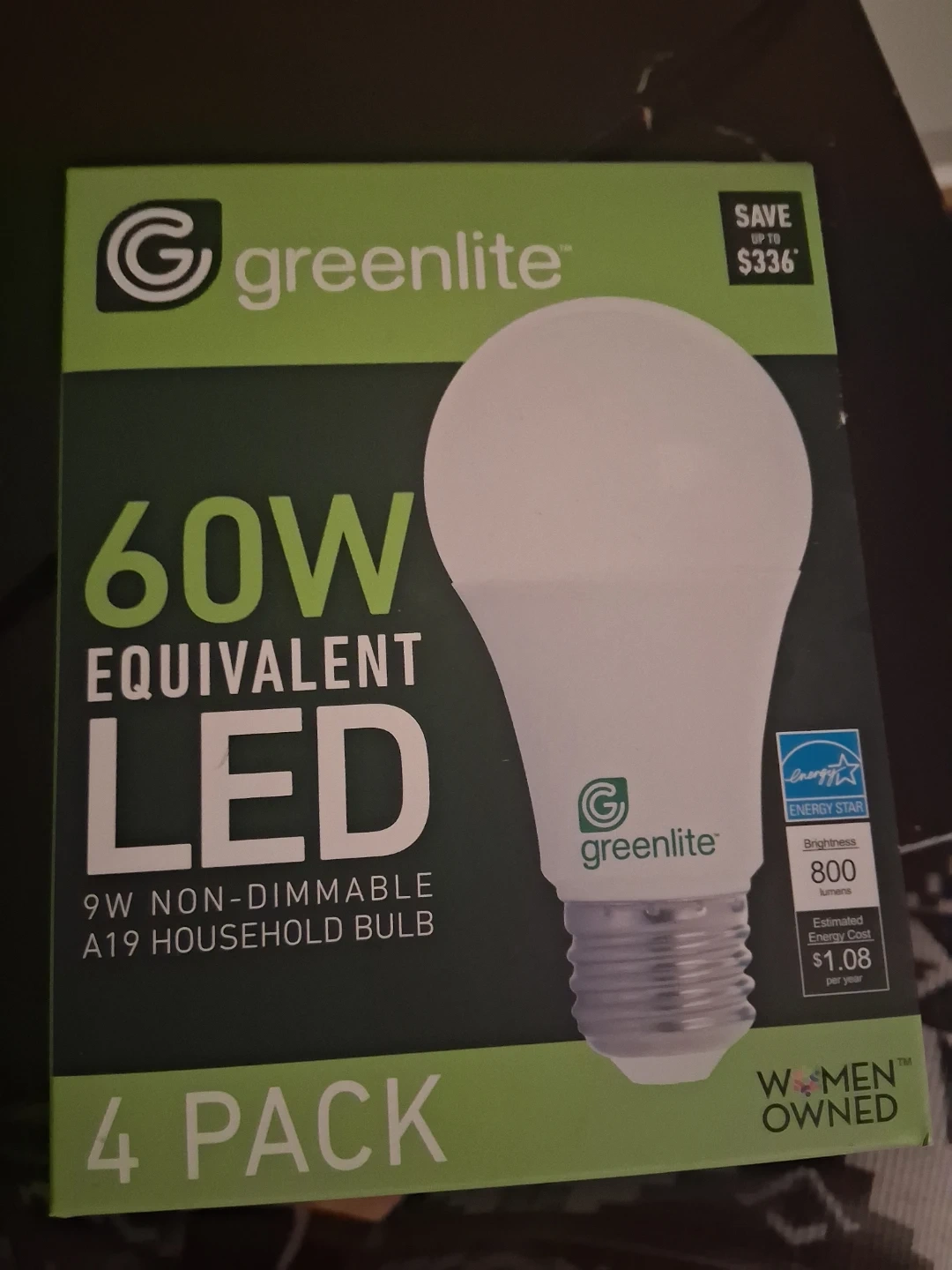 This is a 4-pack of Greenlite 9W non-dimmable A19 household LED bulbs. They provide 800 lumens of brightness. They're Energy Star certified and estimated to cost $1.08 per year to run.
