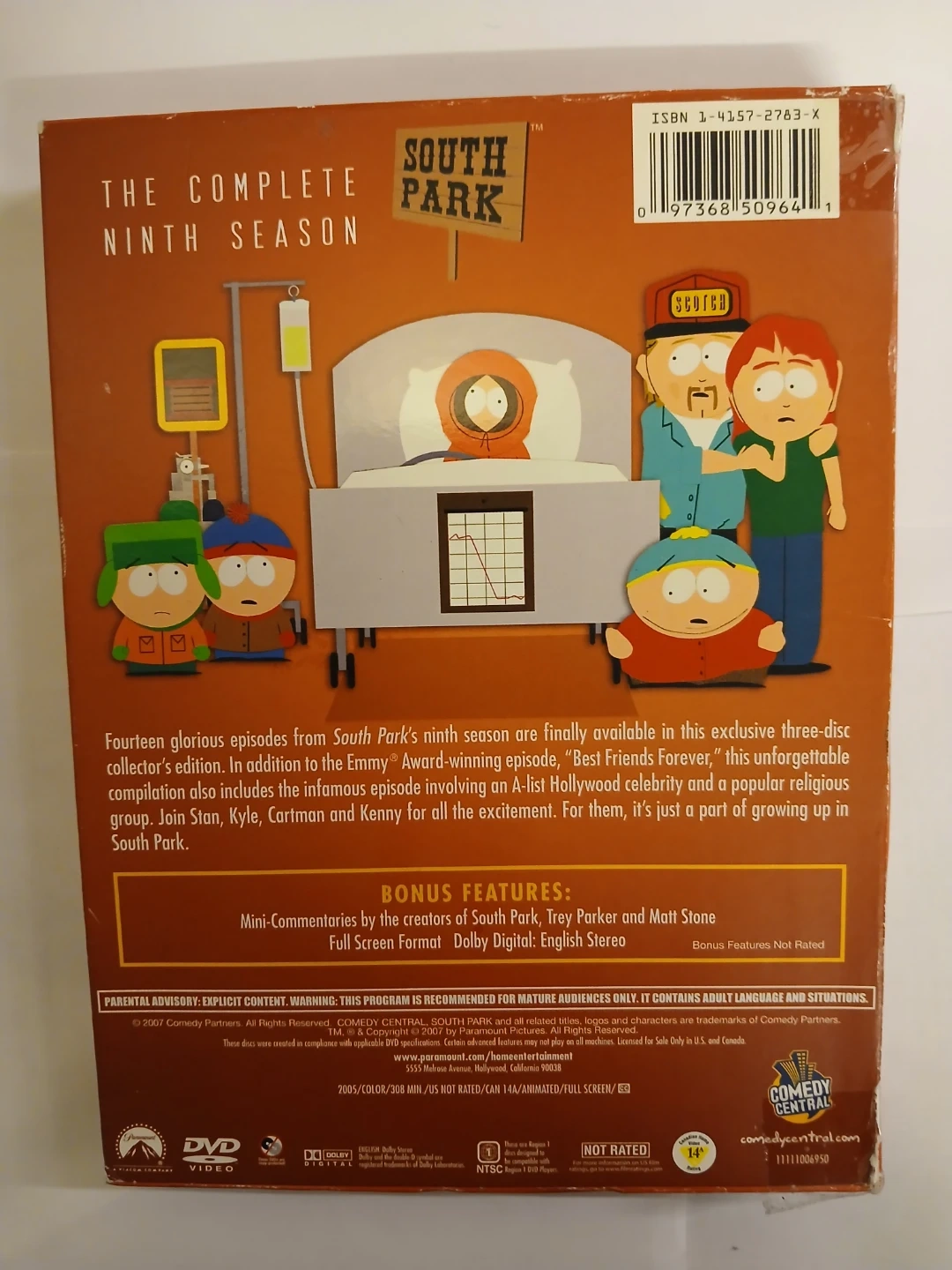 Fourteen episodes from South Park's ninth season are available in this three-disc collector's edition. It includes the Emmy Award-winning episode "Best Friends Forever". This box set comes with mini-commentaries by creators Trey Parker, Matt Stone, and. Full screen format with Dolby Digital stereo sound.
