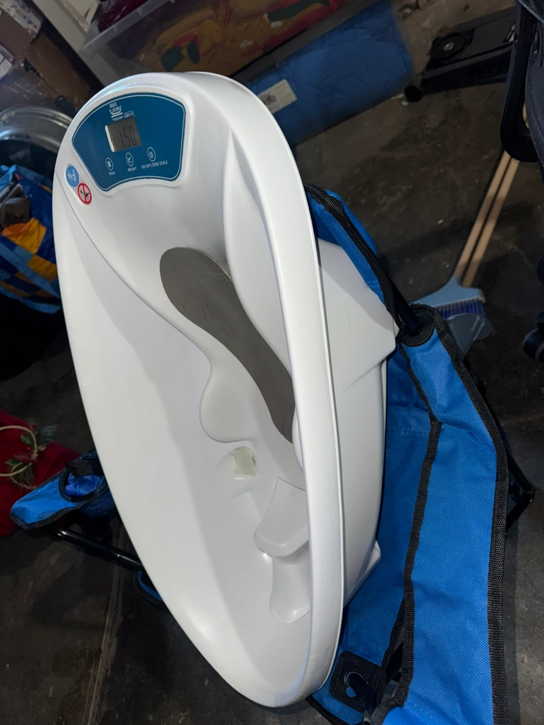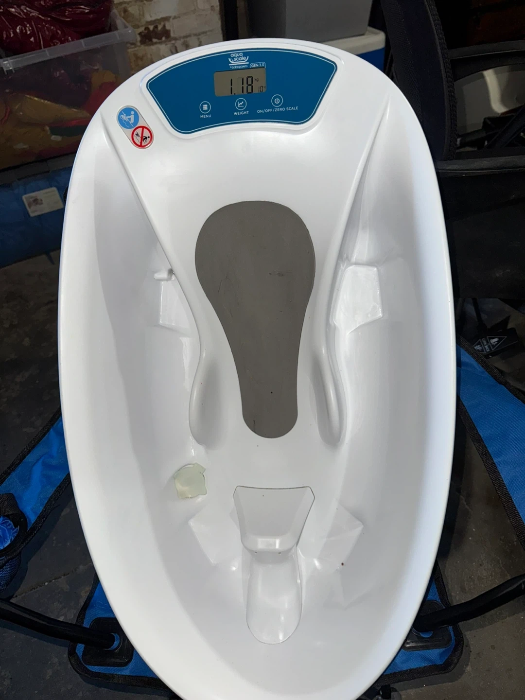 This is the Aqua Scale baby bath scale. It accurately measures your baby's weight in grams or pounds. It has a water temperature display and a tare function for weighing in a towel. Great for tracking your baby's growth!