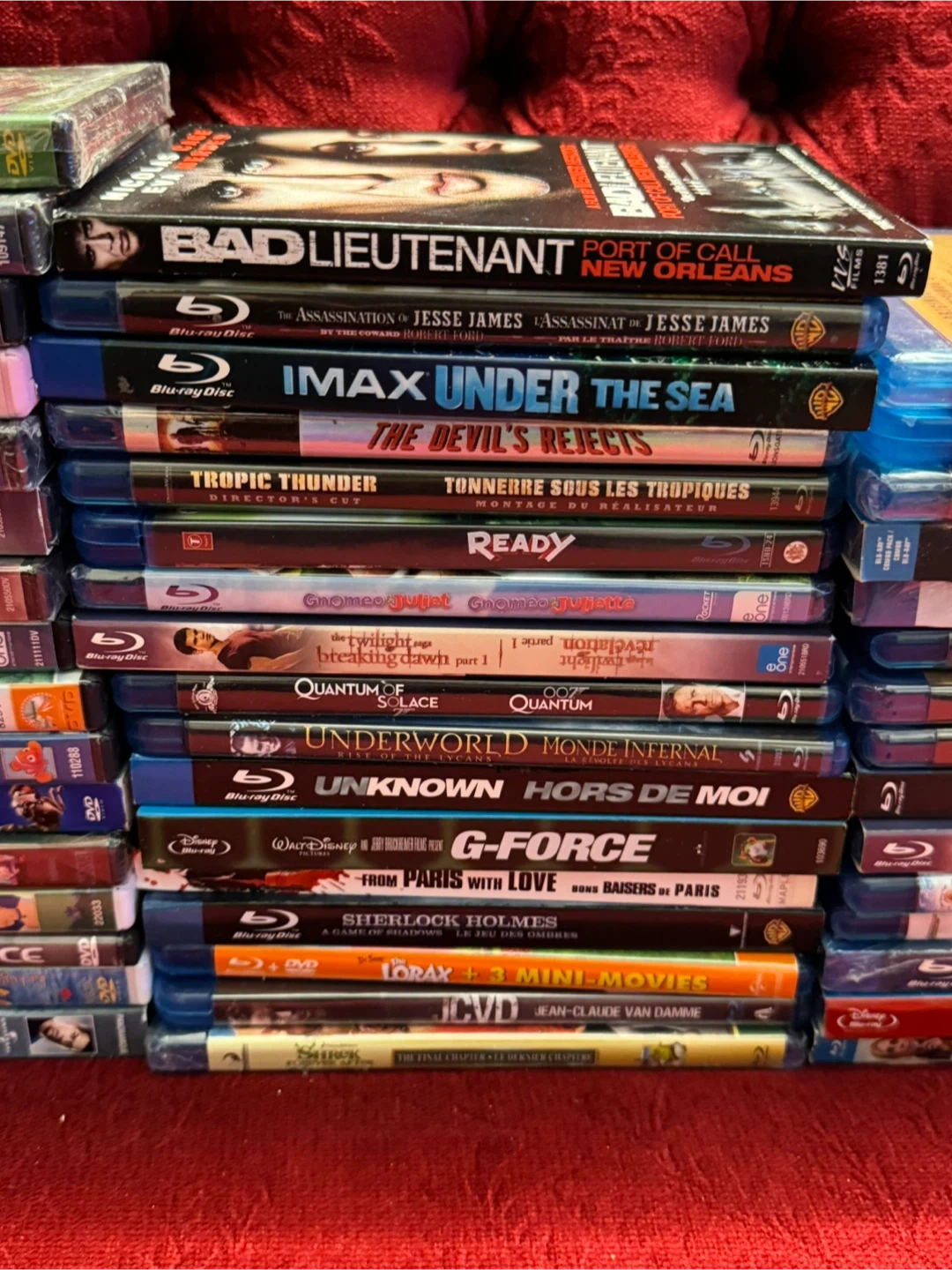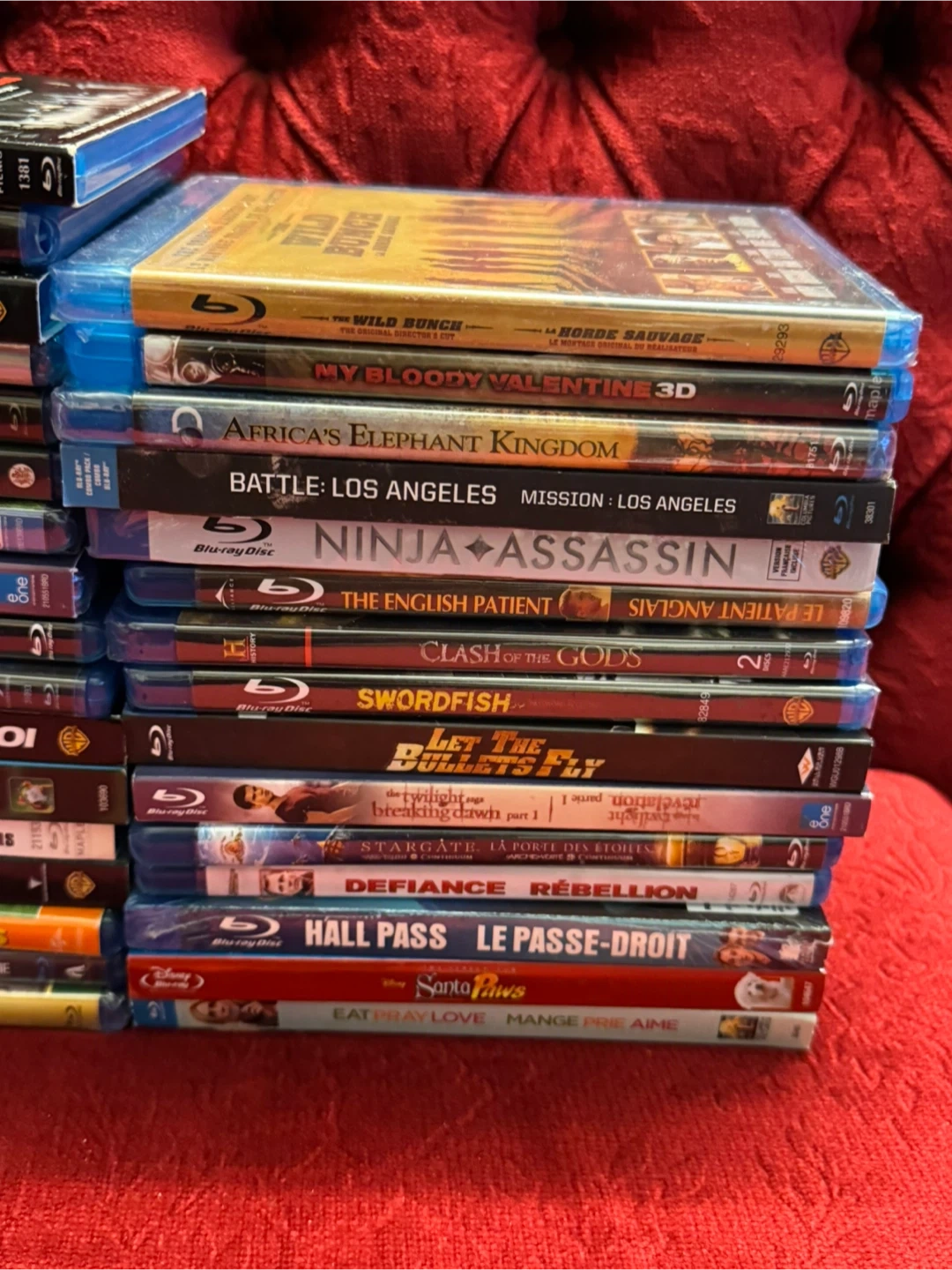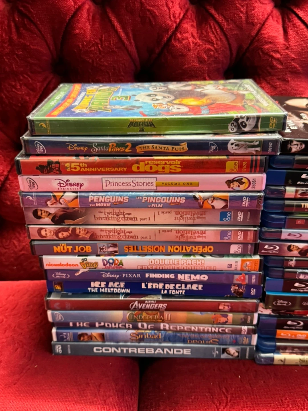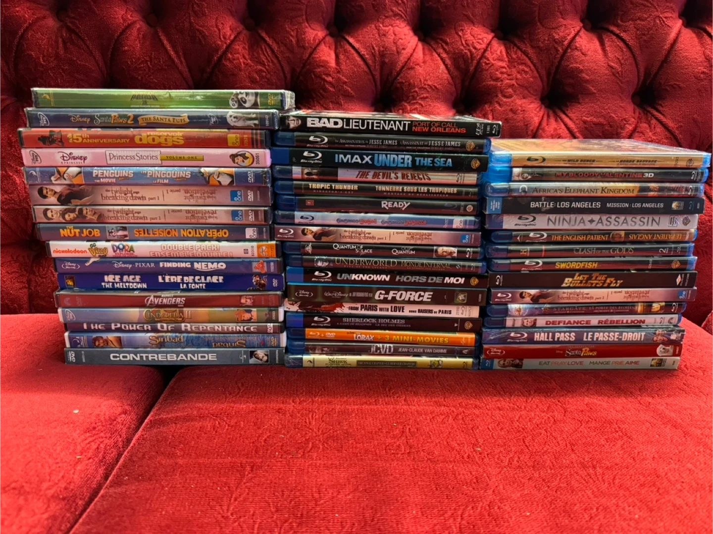 This is a collection of various Blu-ray and DVD movies. Includes titles like The Santa Pups, Kung Fu Panda, The Nut Job, Finding Nemo, Avengers, and Contrebande. Also features Blu-rays such as The Wild Bunch, My Bloody Valentine 3D, and Sherlock Holmes. Many different genres are represented in this lot.