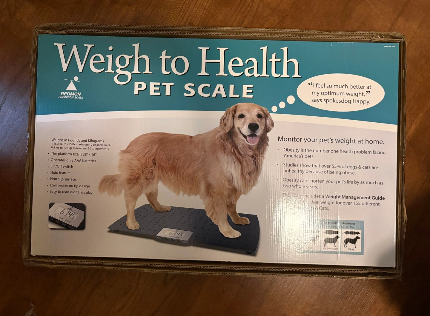 Used only once, still in very good LIKE NEW condition. Box included with scale. This large model (7475) is designed for dogs and other pets weighing up to 225 lbs (102 kg). Features: Measures from 1 lb 2 oz up to 225 lbs in 2-ounce increments. Platform has a large, non-slip rubberized mat measuring 28 x 16 inches. Includes a "Hold" feature to capture an accurate weight even if the pet is moving, and a memory function for previous weights. Operates on 2 AAA alkaline batteries.