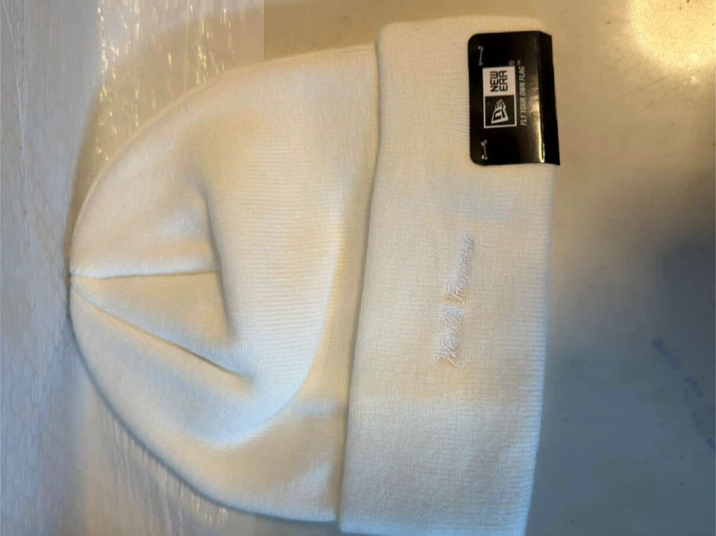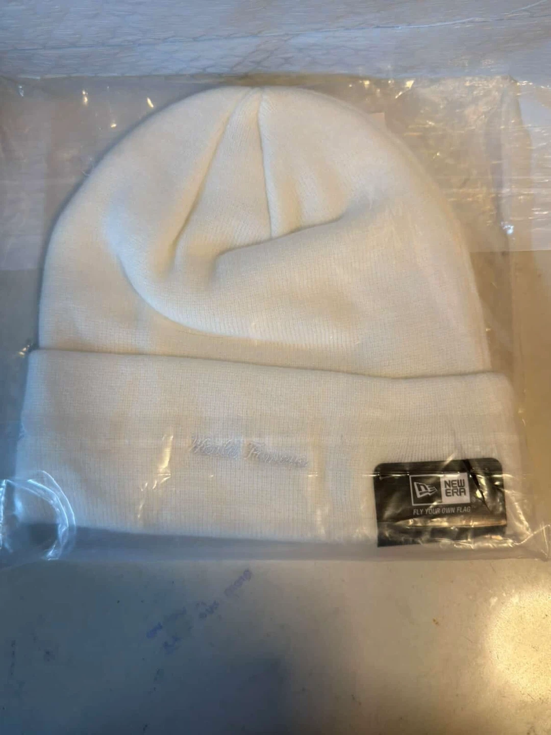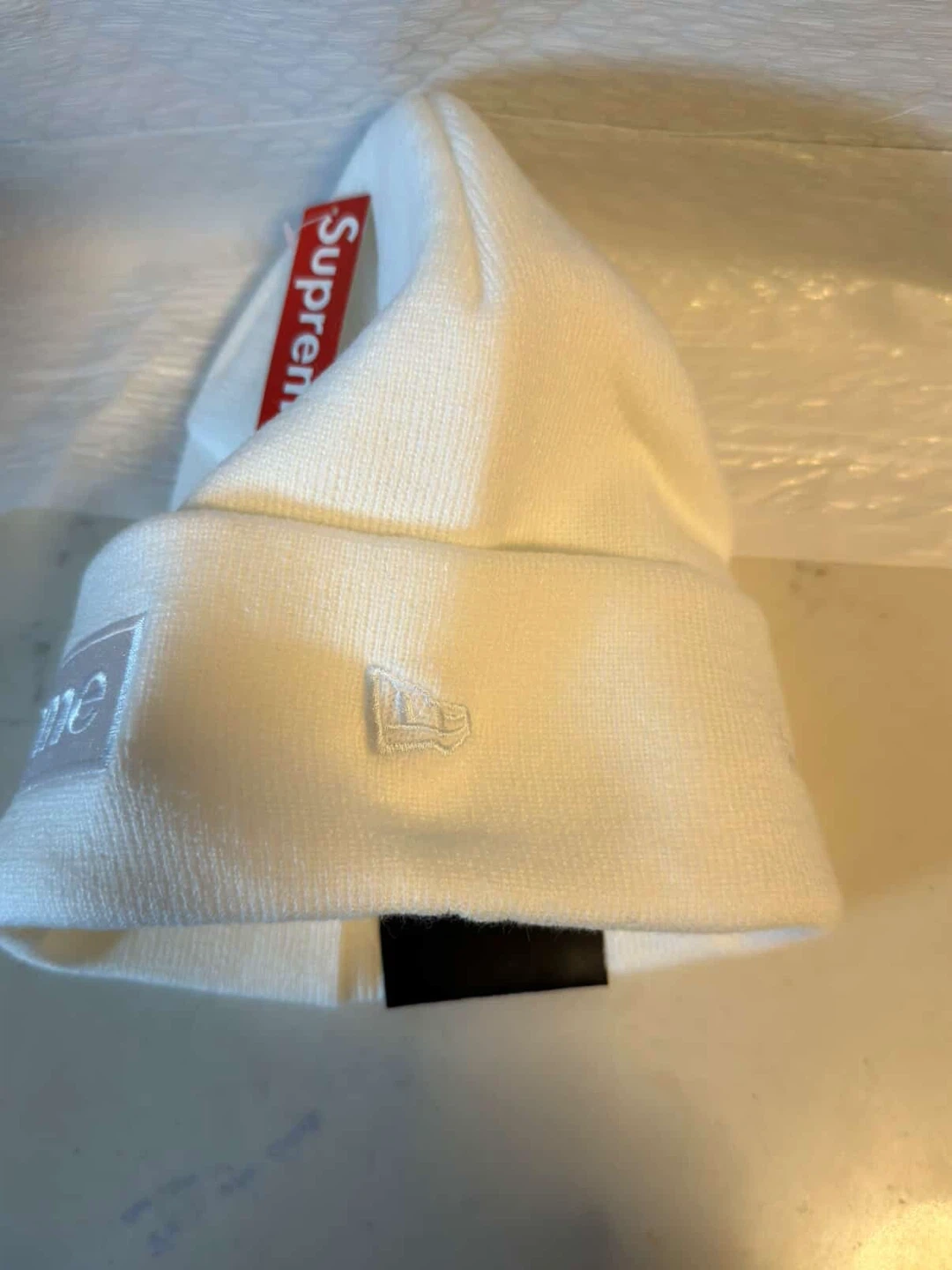 This is a white Supreme New Era box logo beanie. It features embroidered "Supreme" text on the front. The beanie is made of a knit material and comes with original tags and packaging.