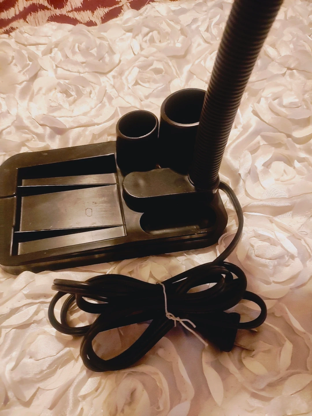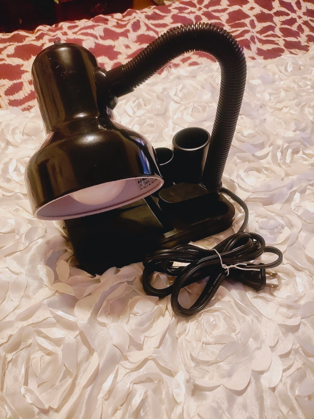 This is a black adjustable gooseneck desk lamp. It has a built-in pen holder and tray. The lamp is made of plastic and metal. It's perfect for a desk or workspace!