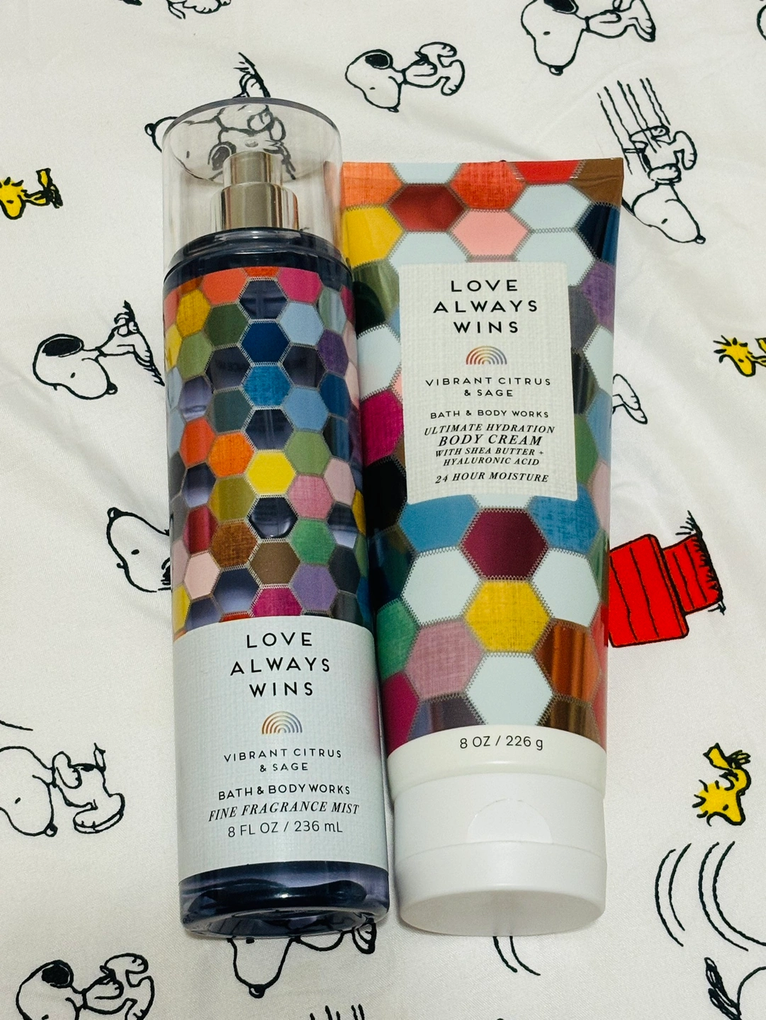 Bath and Body Works Love Always Wins set with body cream and fine fragrance mist.
