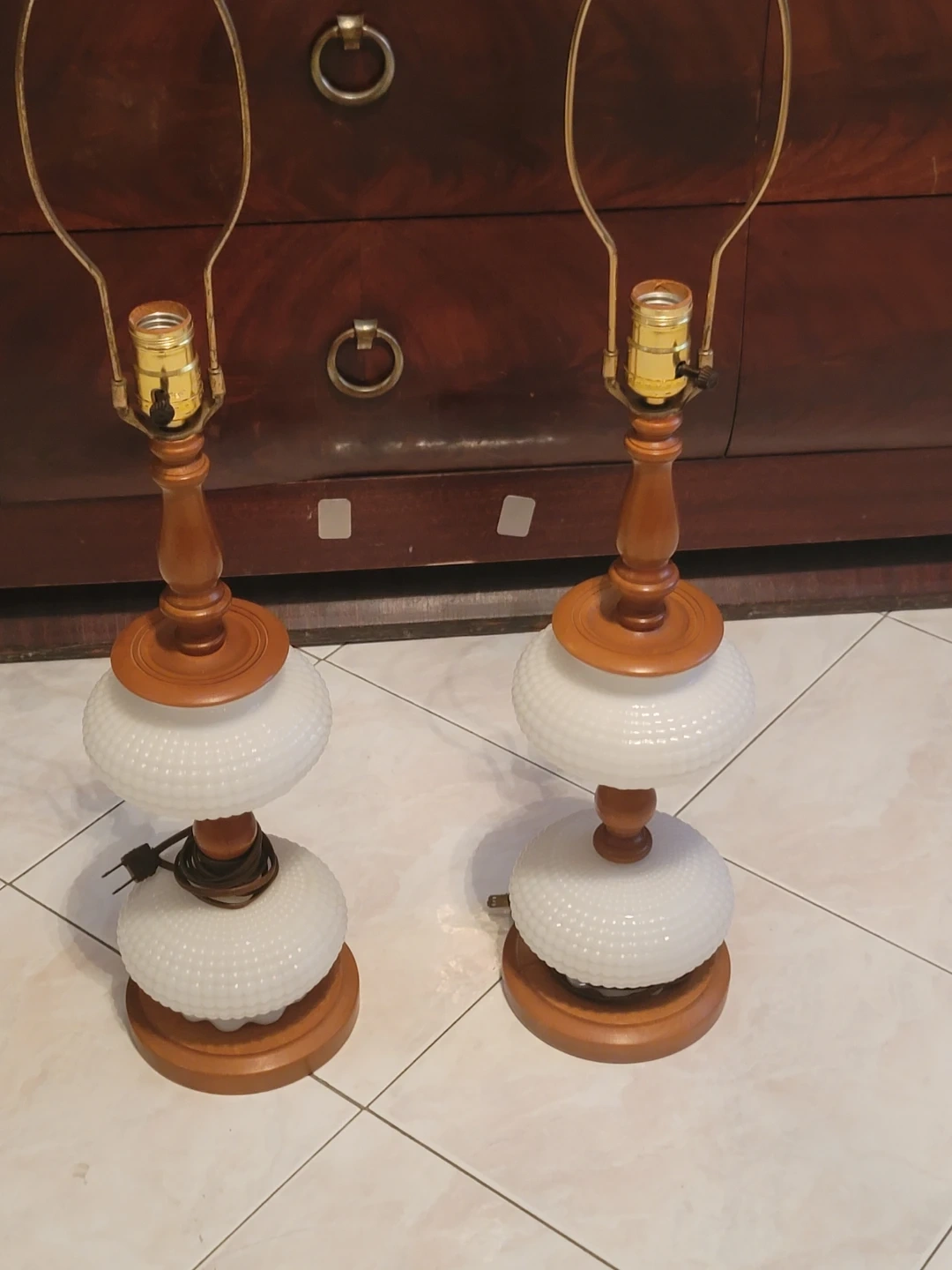 Vintage Milk Glass and Wood Table Lamps - Set of 2